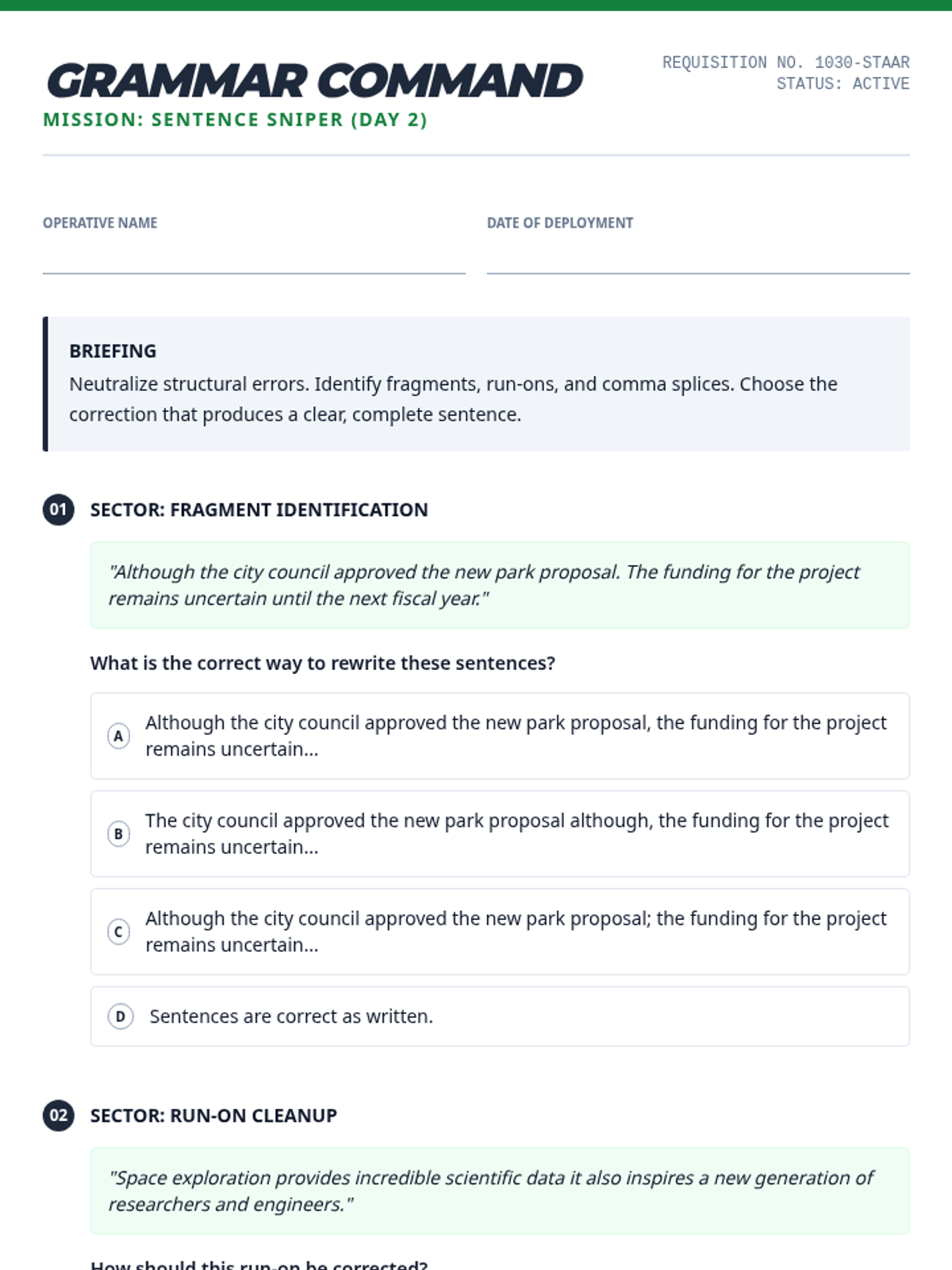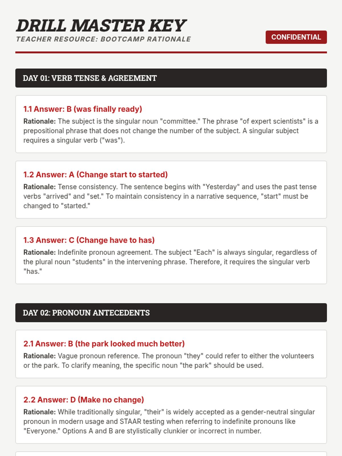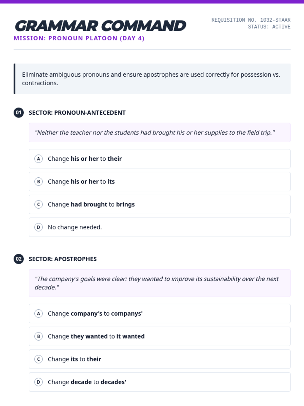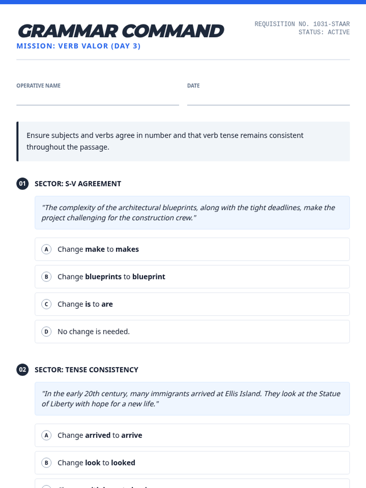 A series of daily editing drills targeting high-frequency STAAR grammar standards including verb agreement, pronoun-antecedent clarity, and complex punctuation.