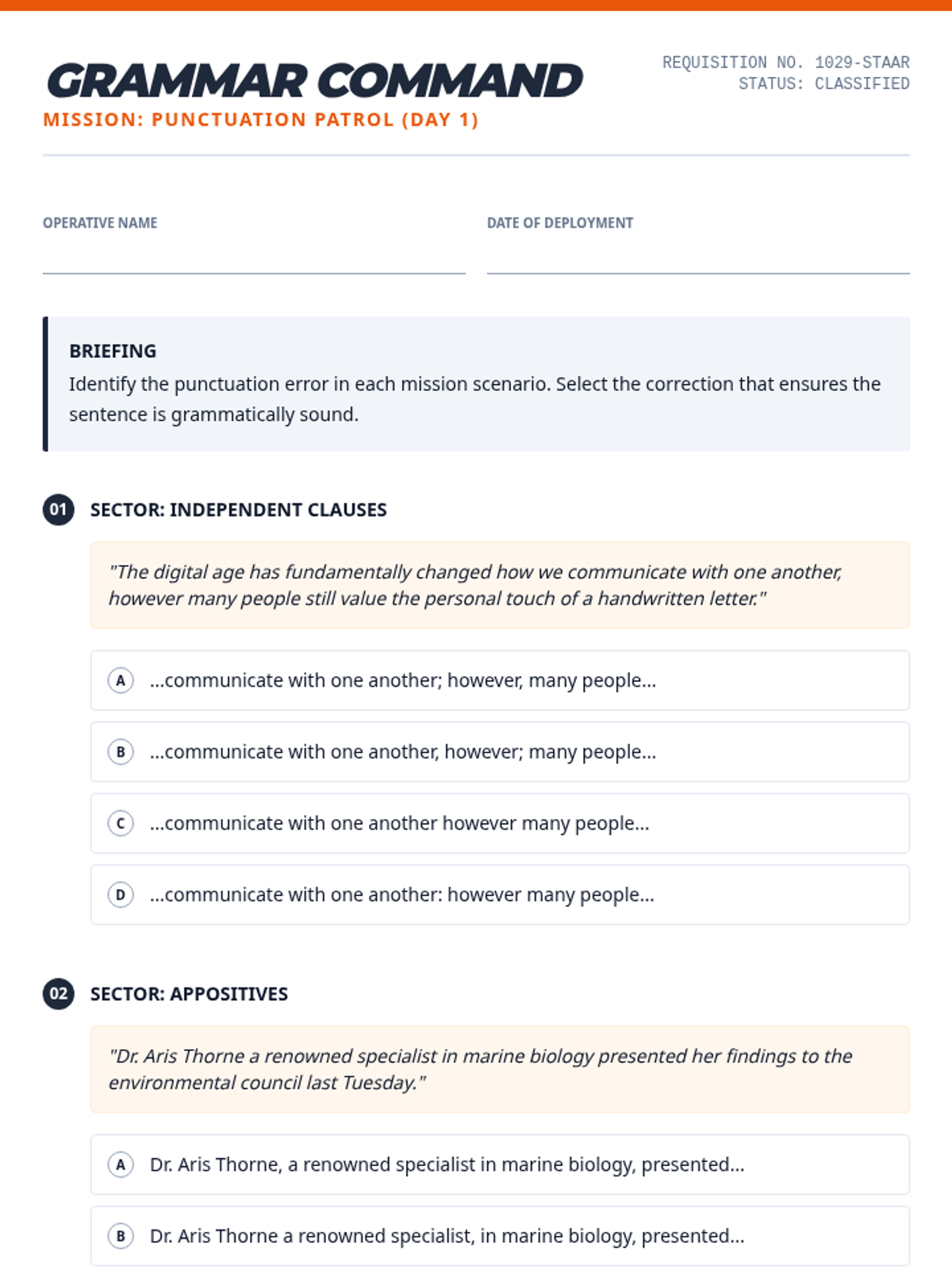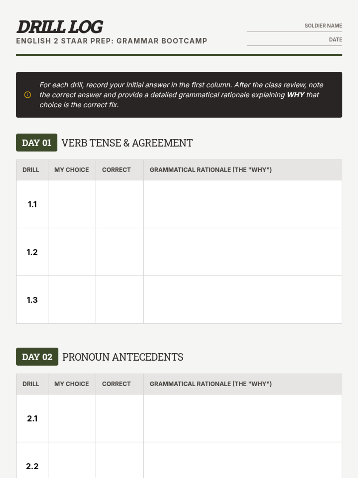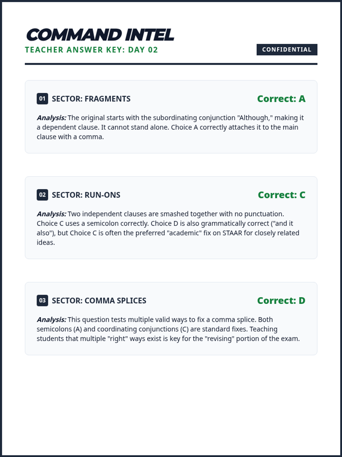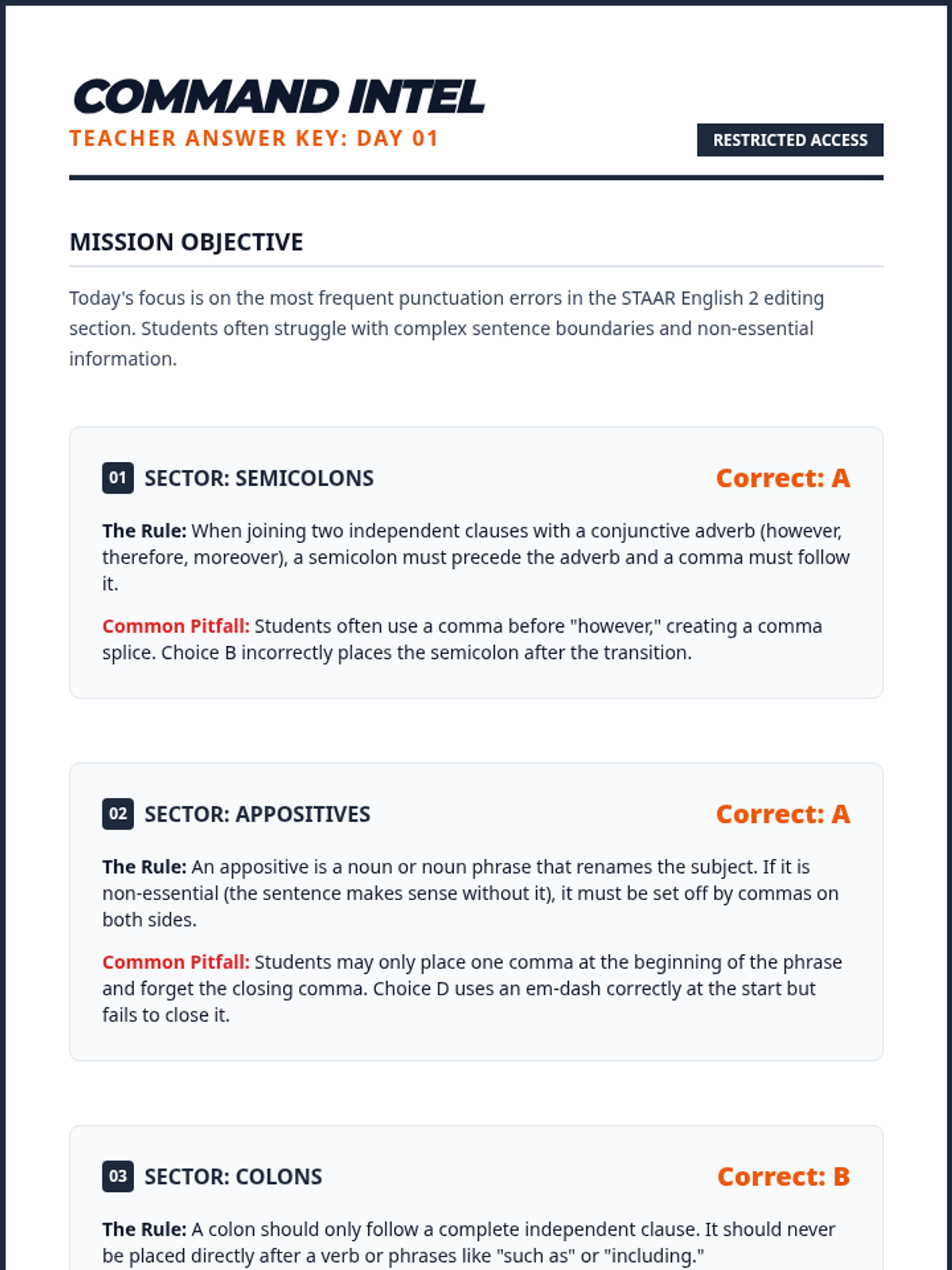 A series of daily editing drills targeting high-frequency STAAR grammar standards including verb agreement, pronoun-antecedent clarity, and complex punctuation.