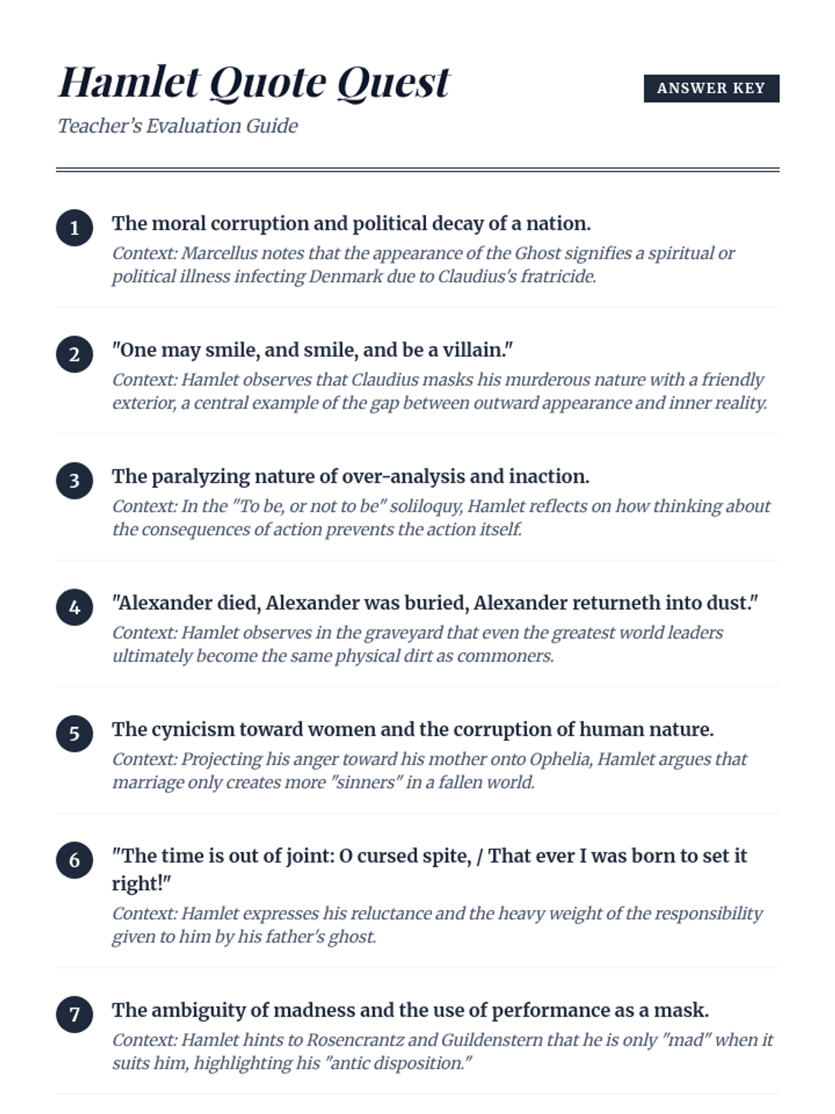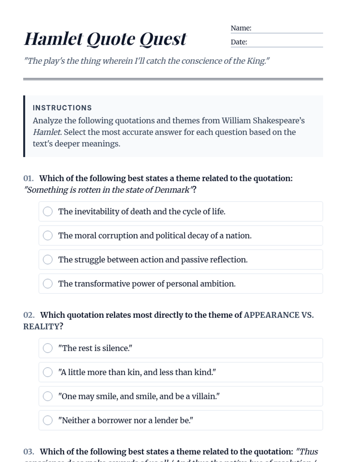 A focused lesson exploring the deep connections between Shakespeare's language and the core themes of Hamlet through quotation analysis.