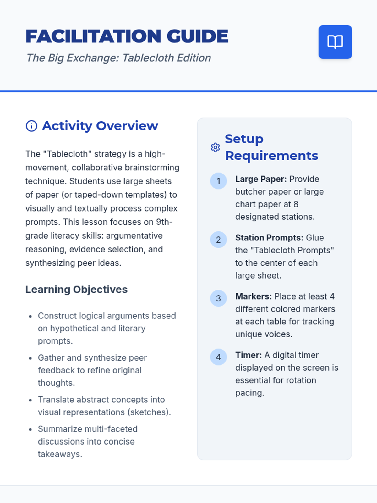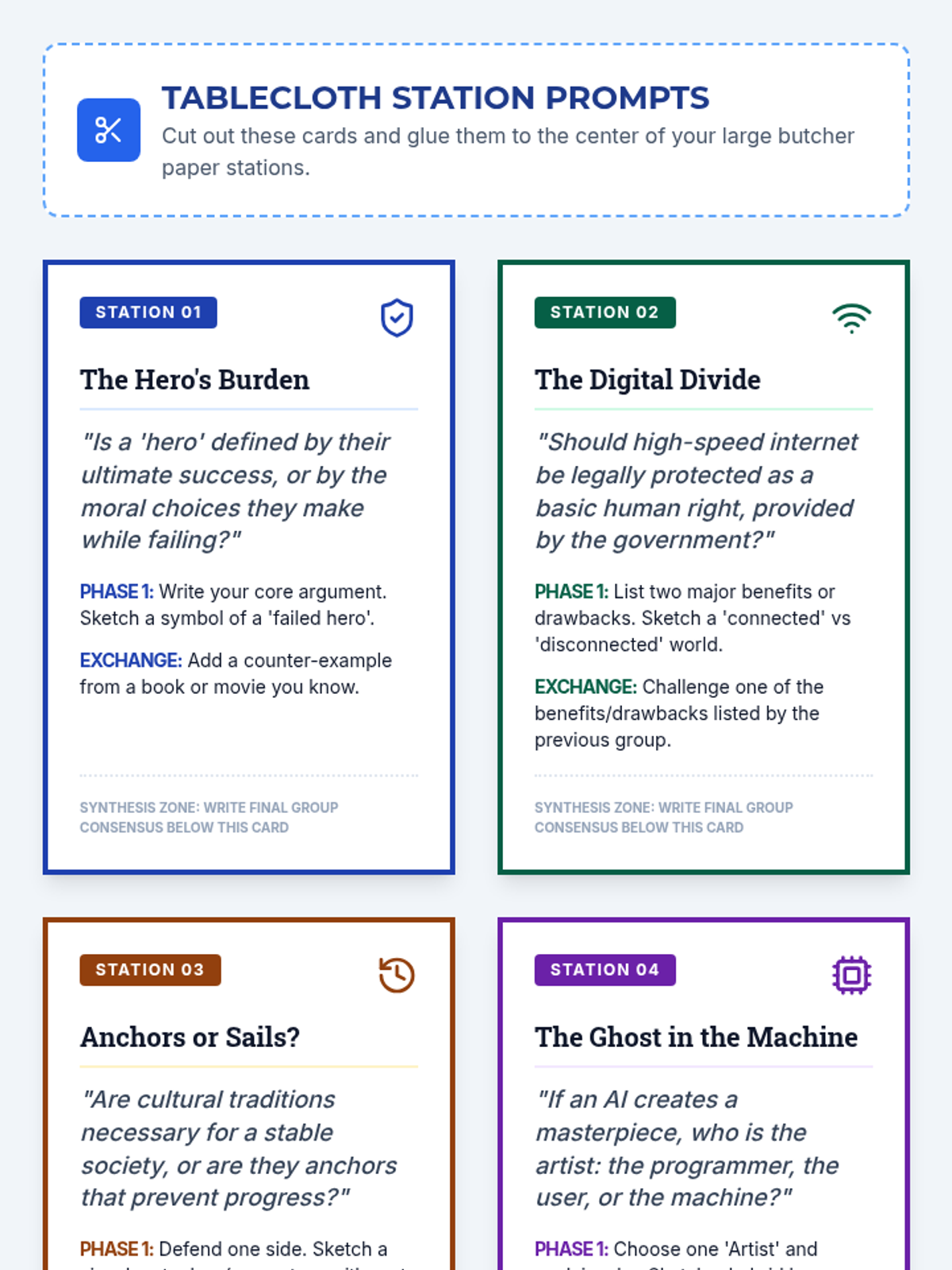 A high-energy, collaborative activity where students move between stations to engage in deep analysis, sketching, and argumentative debate on large 'tablecloth' papers.