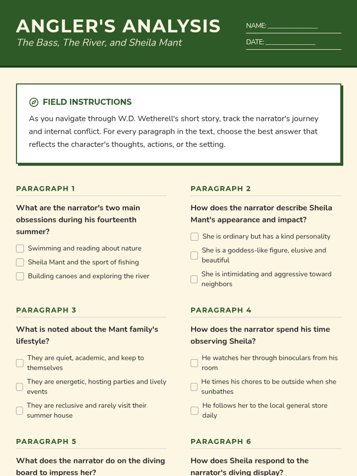 A focused study of W.D. Wetherell's short story 'The Bass, The River, and Sheila Mant,' examining character motivation and internal conflict through a paragraph-by-paragraph analysis.