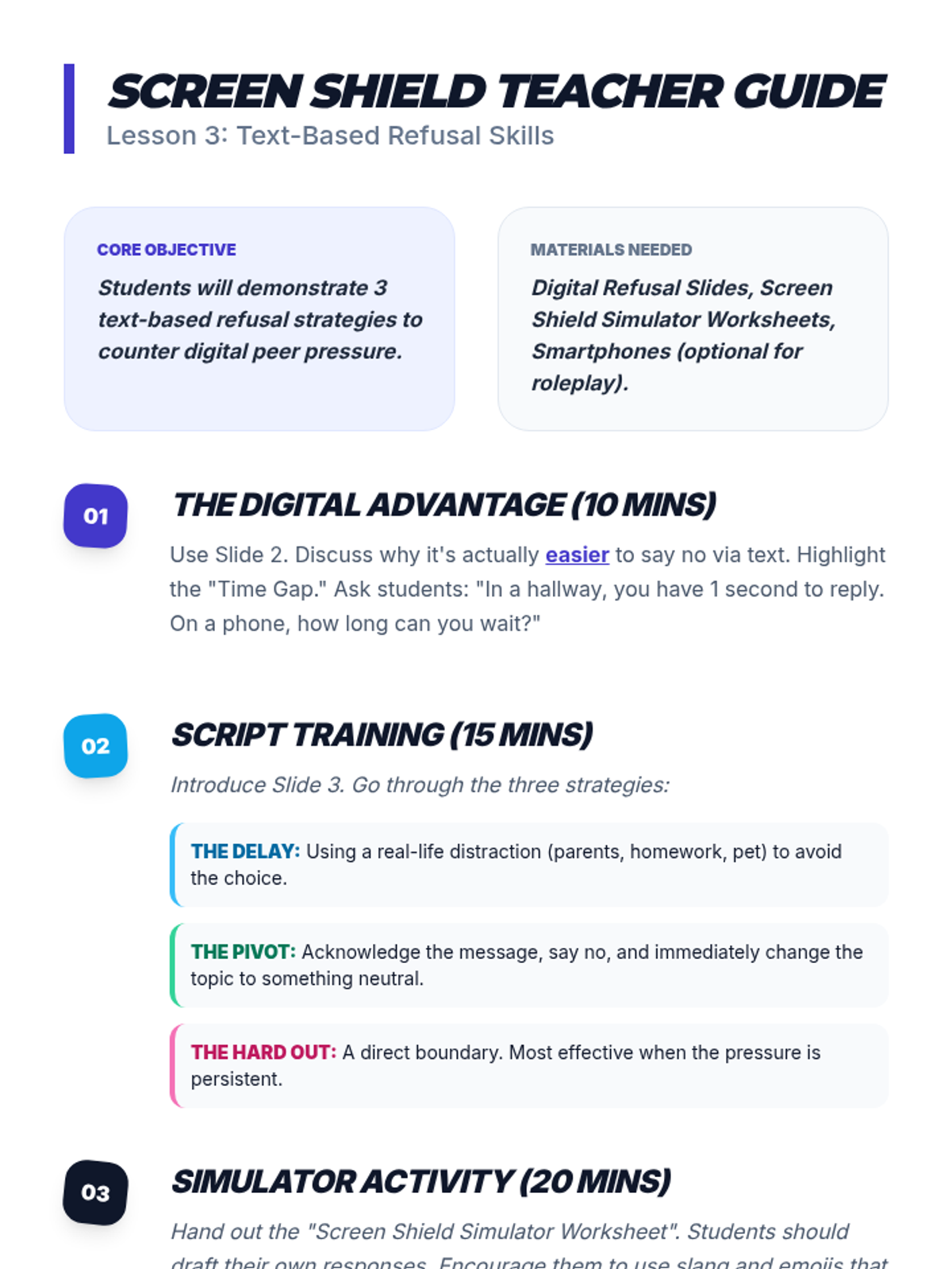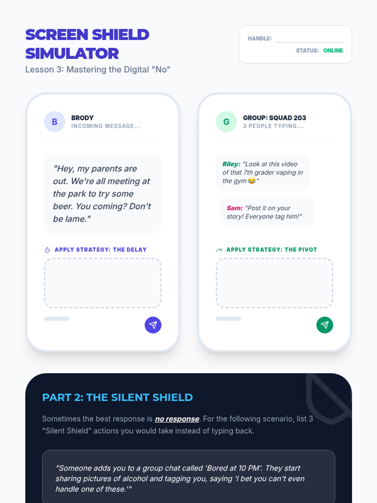 Students practice specific refusal techniques for digital messaging, including delay tactics, boundary setting, and exit strategies.