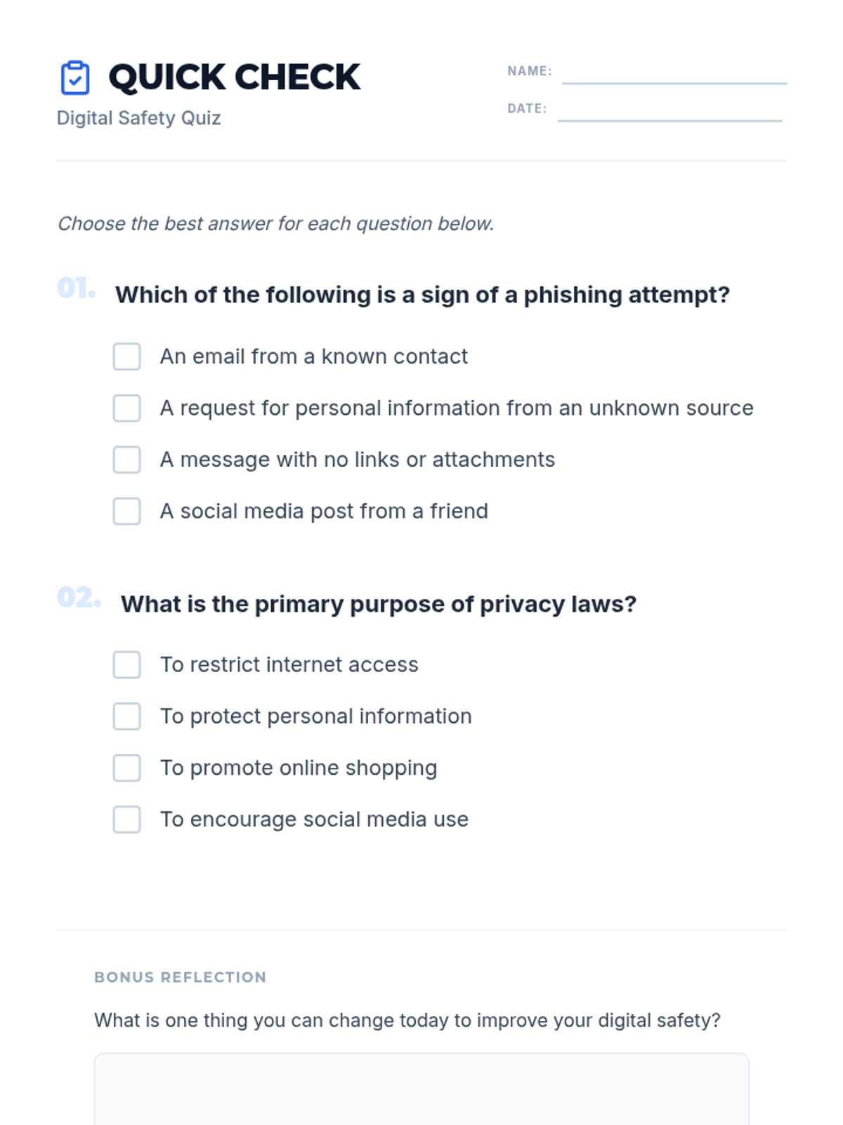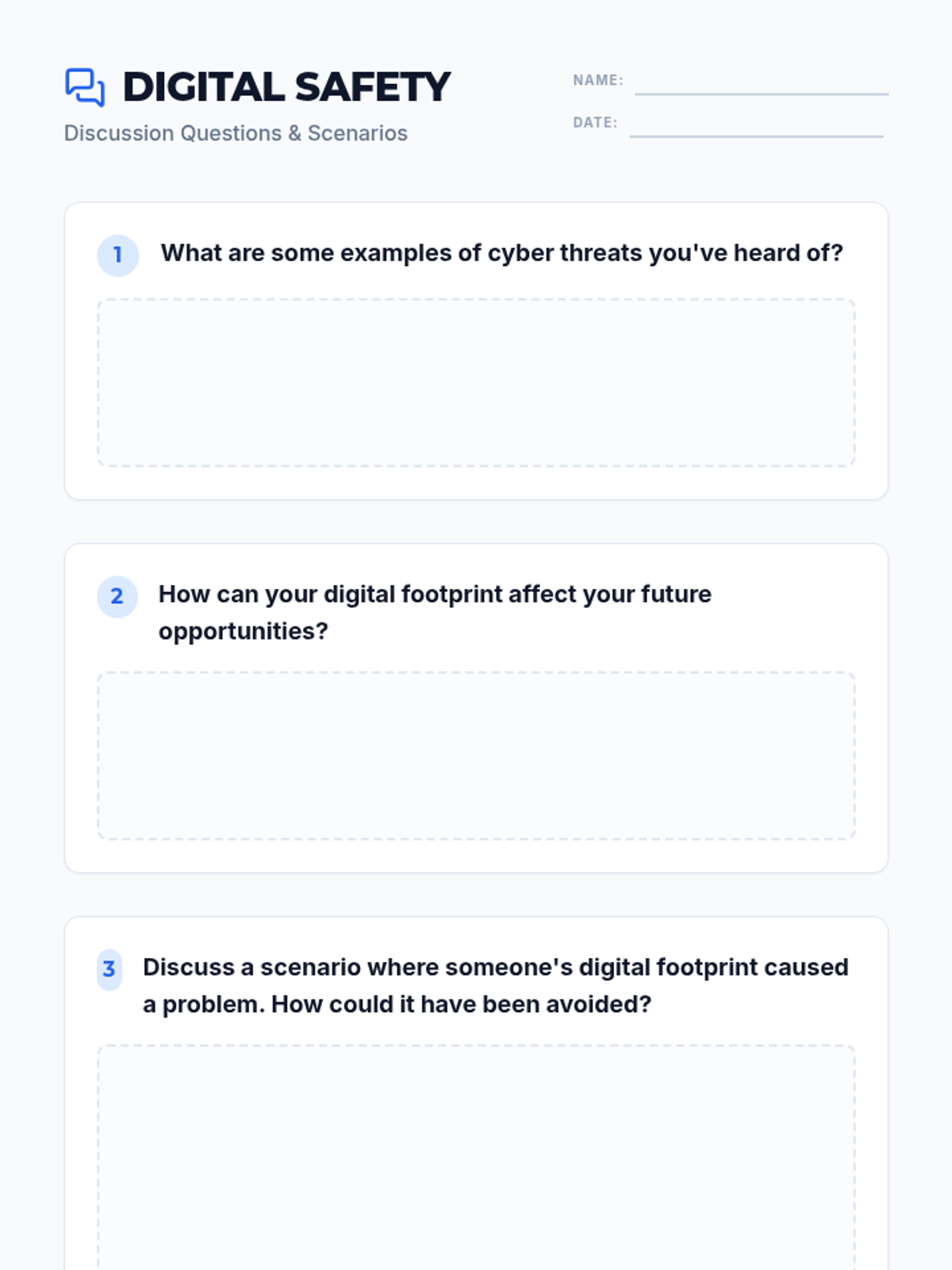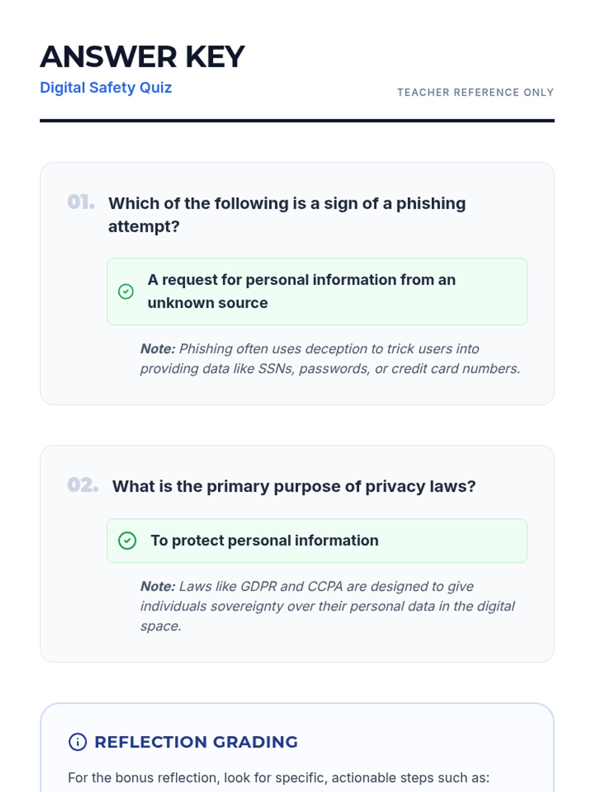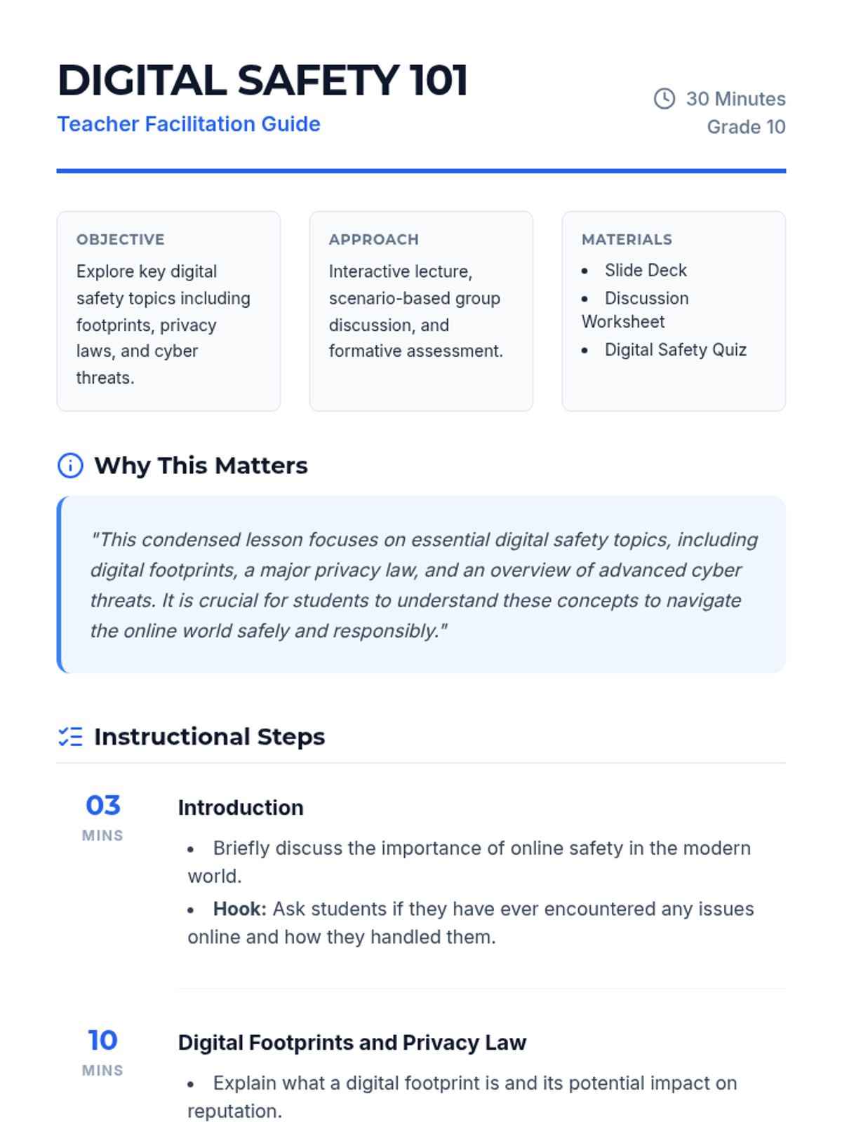 A condensed 30-minute lesson for Grade 10 students covering digital footprints, privacy laws (GDPR), and advanced cyber threats. Students will learn strategies to protect their online identity and recognize potential digital risks.