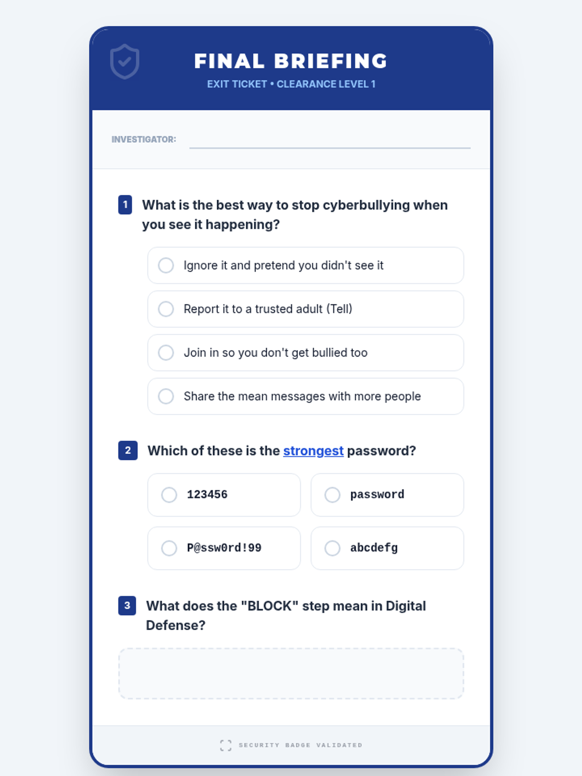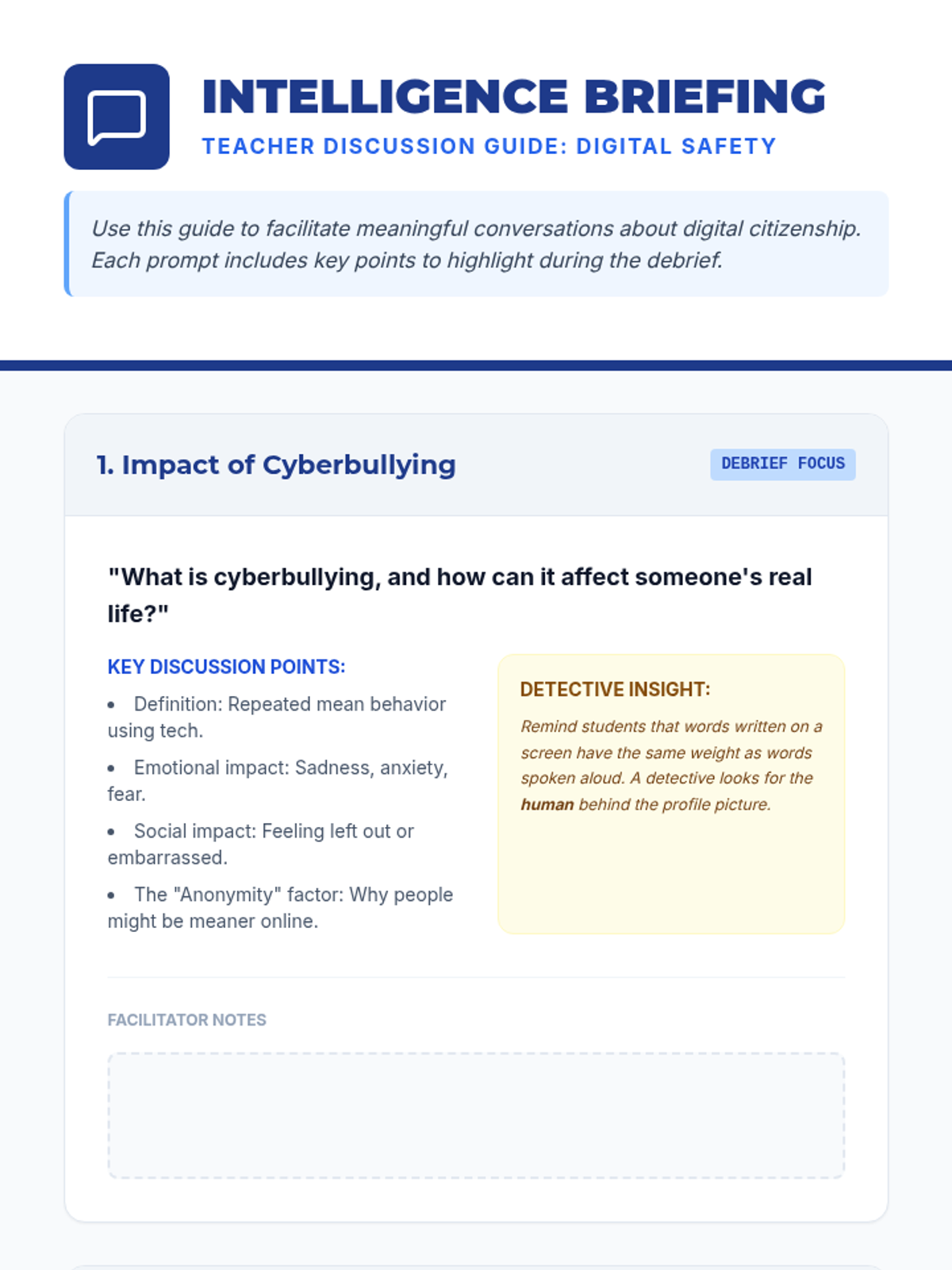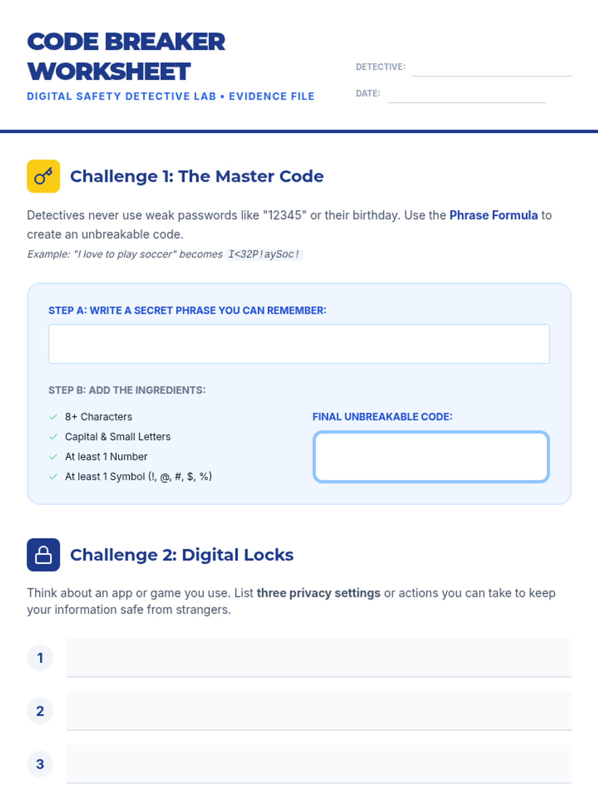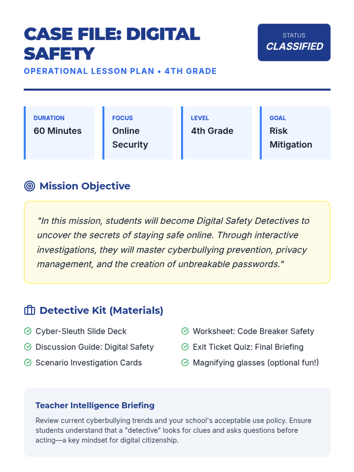 A high-energy 4th-grade lesson where students become 'Digital Safety Detectives' to investigate cyberbullying, privacy, and password security. Through role-play scenarios and hands-on activities, they develop the skills needed to protect themselves and others in the digital world.