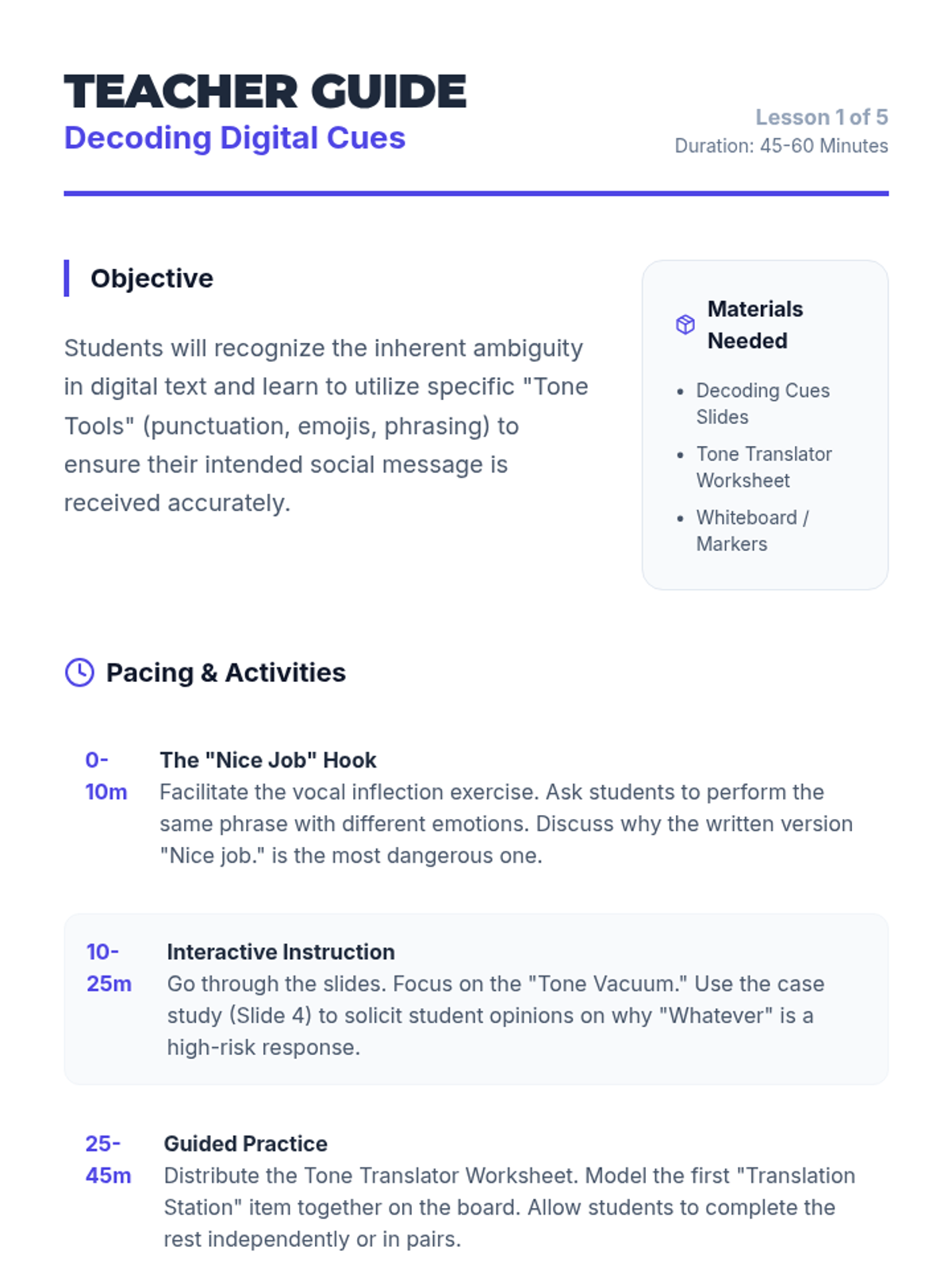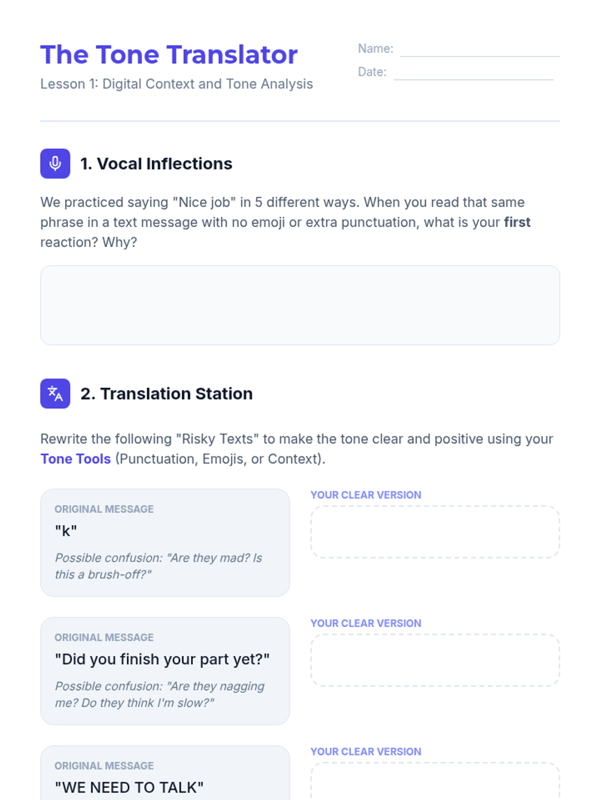 Students analyze how the absence of tone and body language leads to misunderstandings in digital spaces. They learn to use punctuation and emojis to clarify meaning.