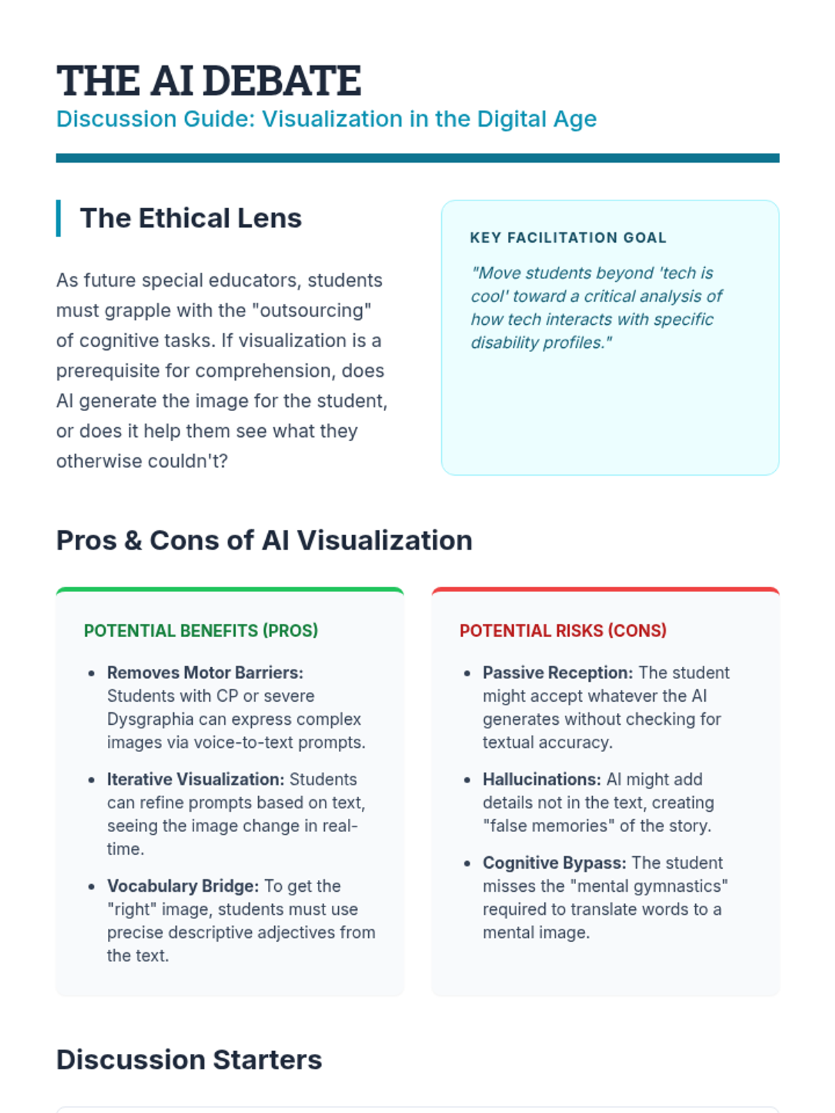 Explores the role of digital tools and AI in externalizing mental images, debating the cognitive trade-offs of student-generated vs. pre-made visuals.