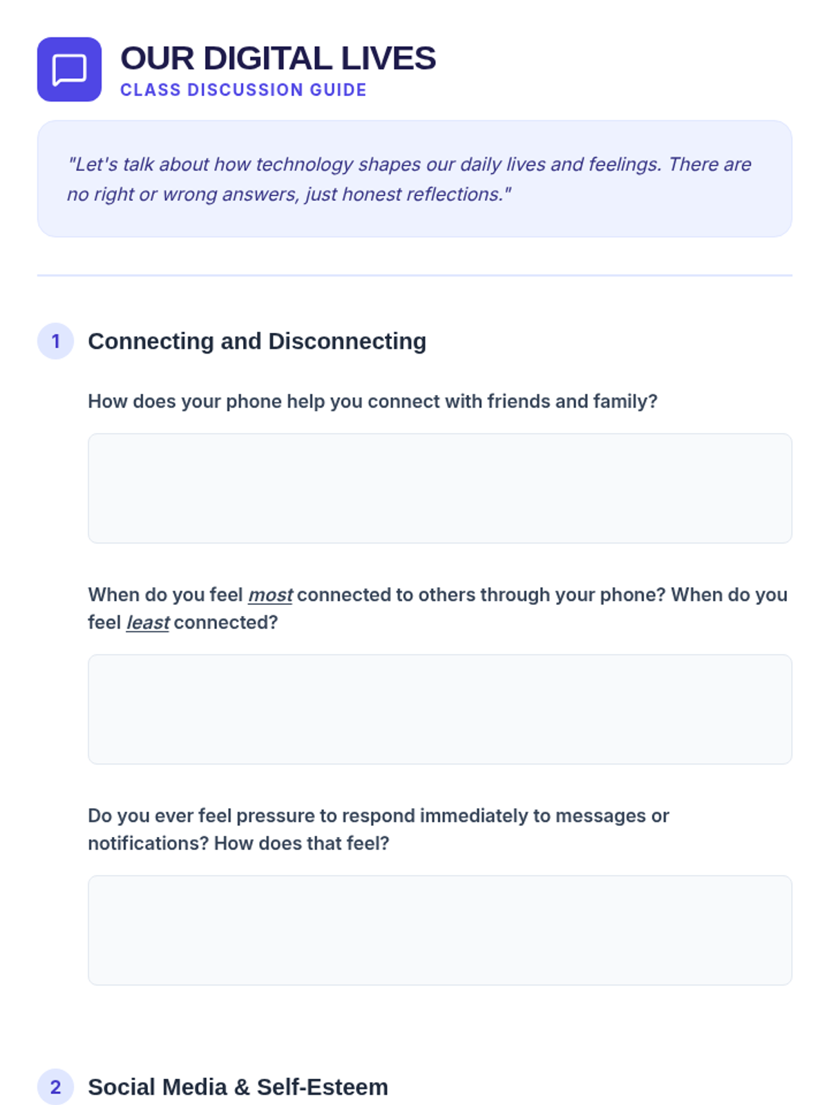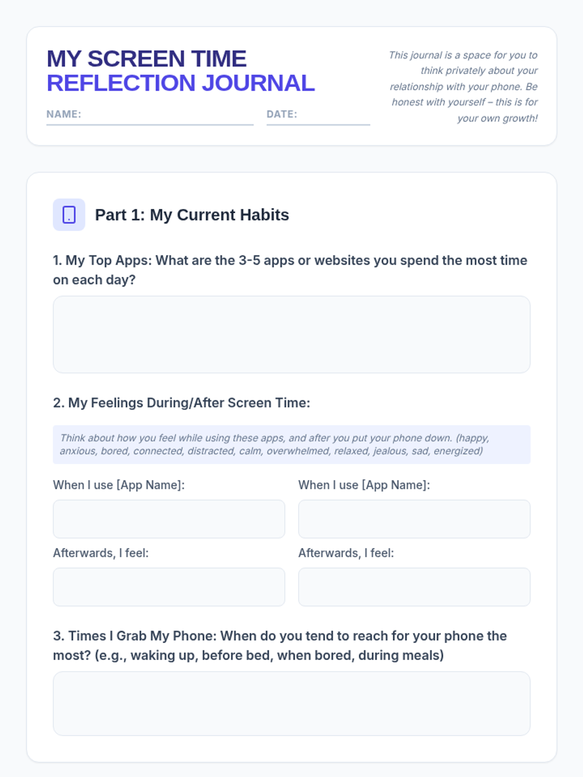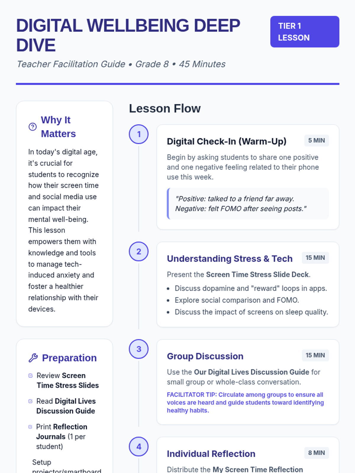 This lesson explores the connection between screen time, social media, and stress, helping 8th-grade students develop healthier digital habits. It includes a slide deck, a discussion guide, and a personal reflection journal to navigate the digital world mindfully.
