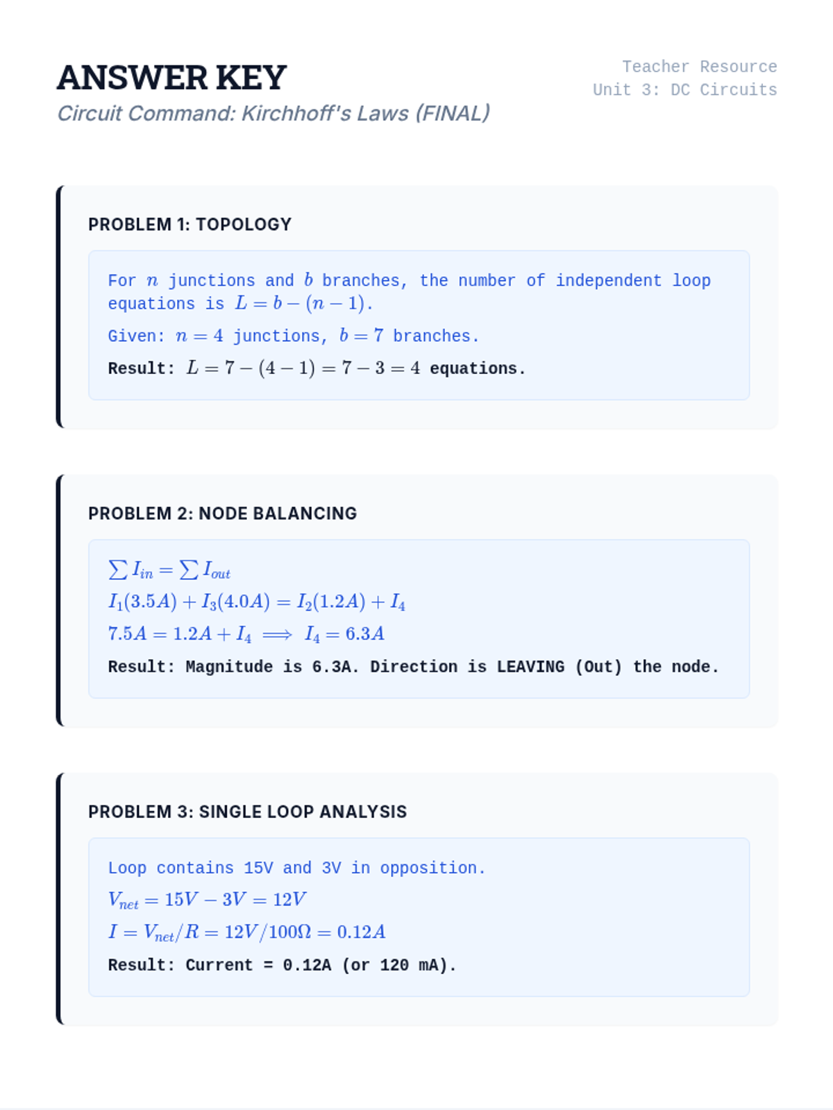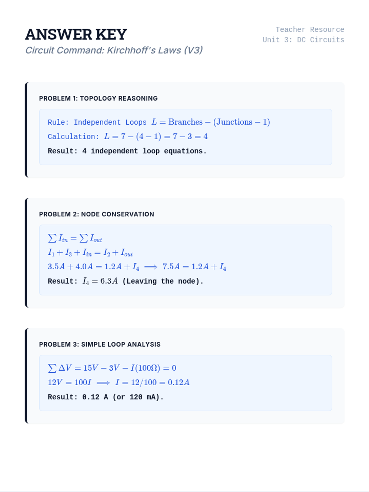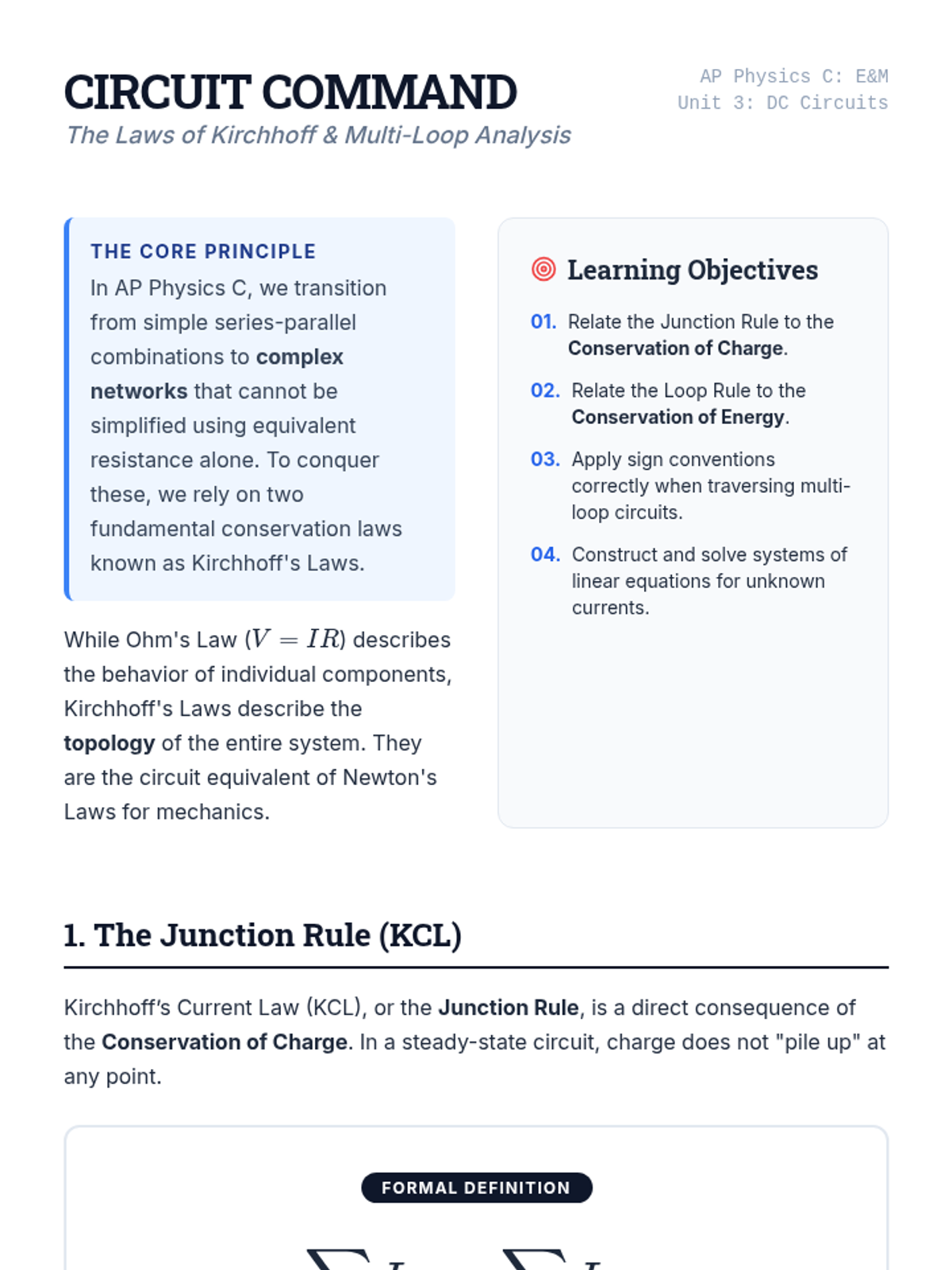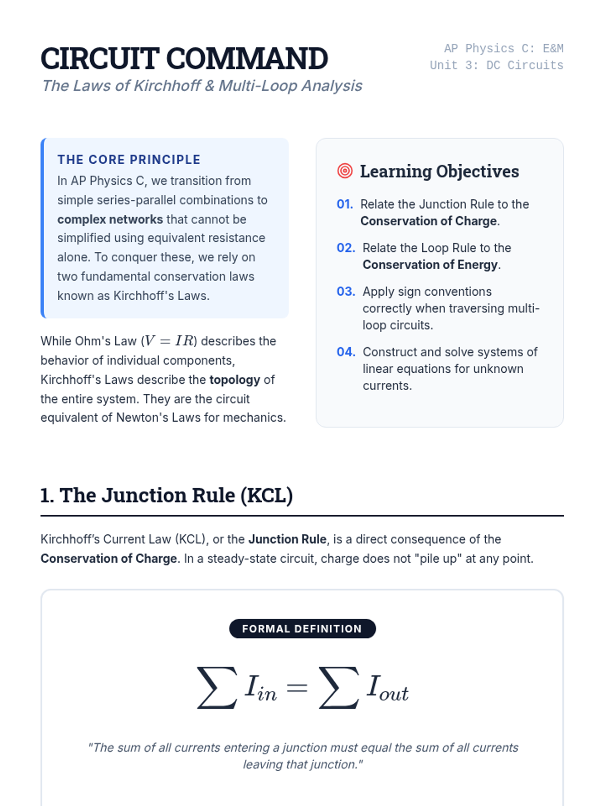 A comprehensive guide to Kirchhoff's Laws for AP Physics C, focusing on the Junction and Loop rules, conservation principles, and systematic problem-solving for multi-loop circuits.