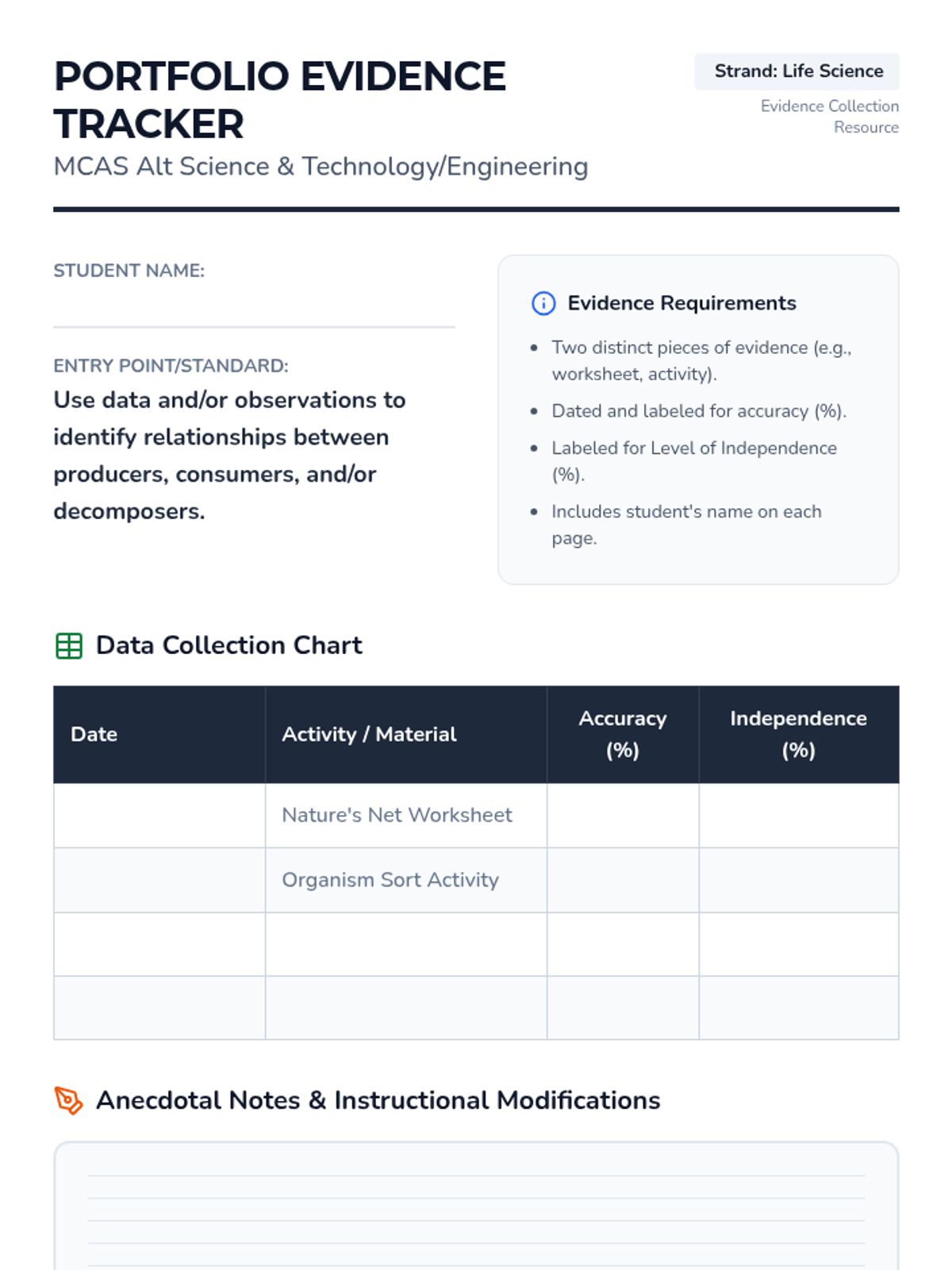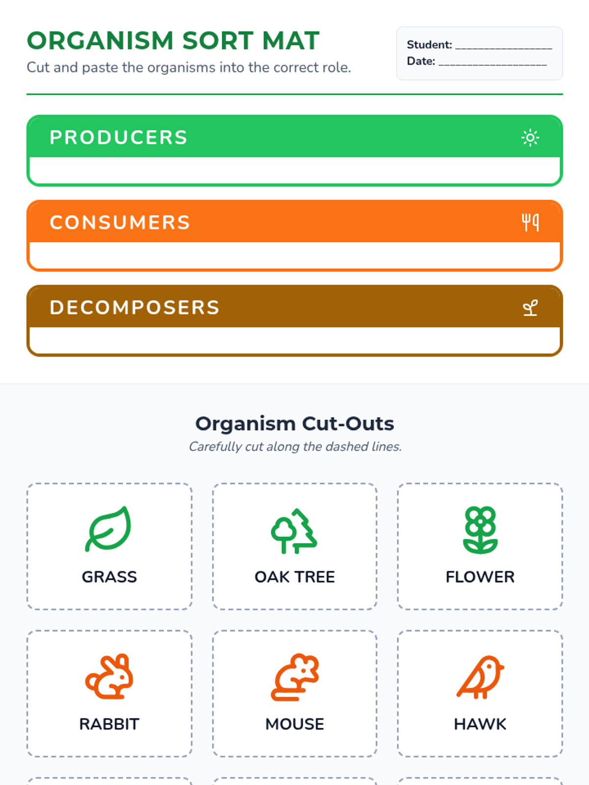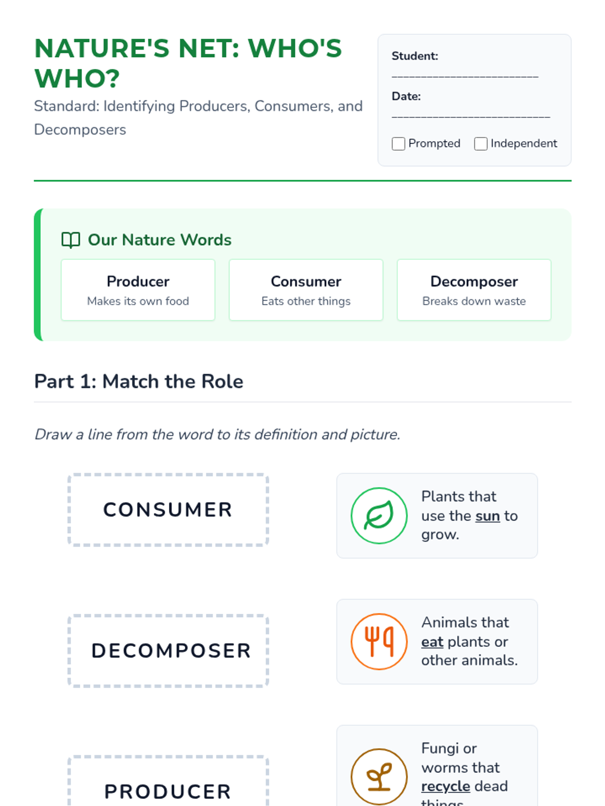 A lesson focused on identifying the roles of producers, consumers, and decomposers within an ecosystem through visual aids and hands-on sorting, designed for MCAS Alt portfolio evidence.