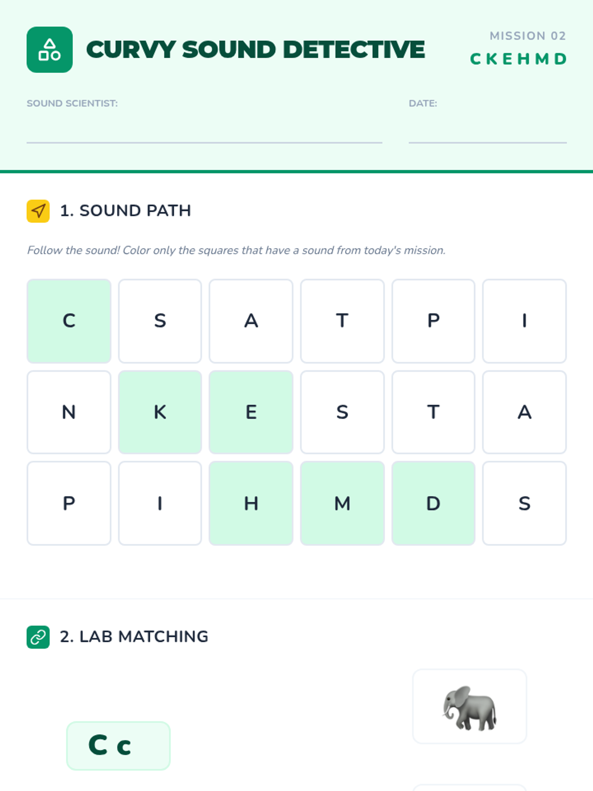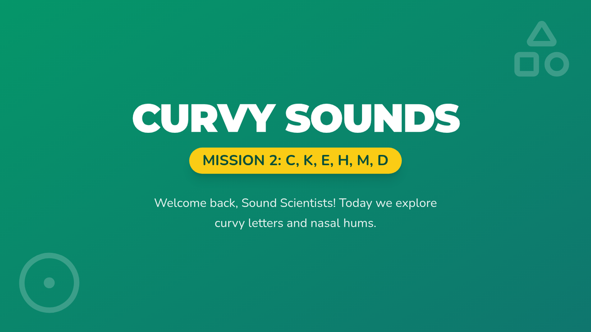 Introduces curvy letter forms and nasal sounds including C, K, E, H, M, and D through visual and auditory discrimination.