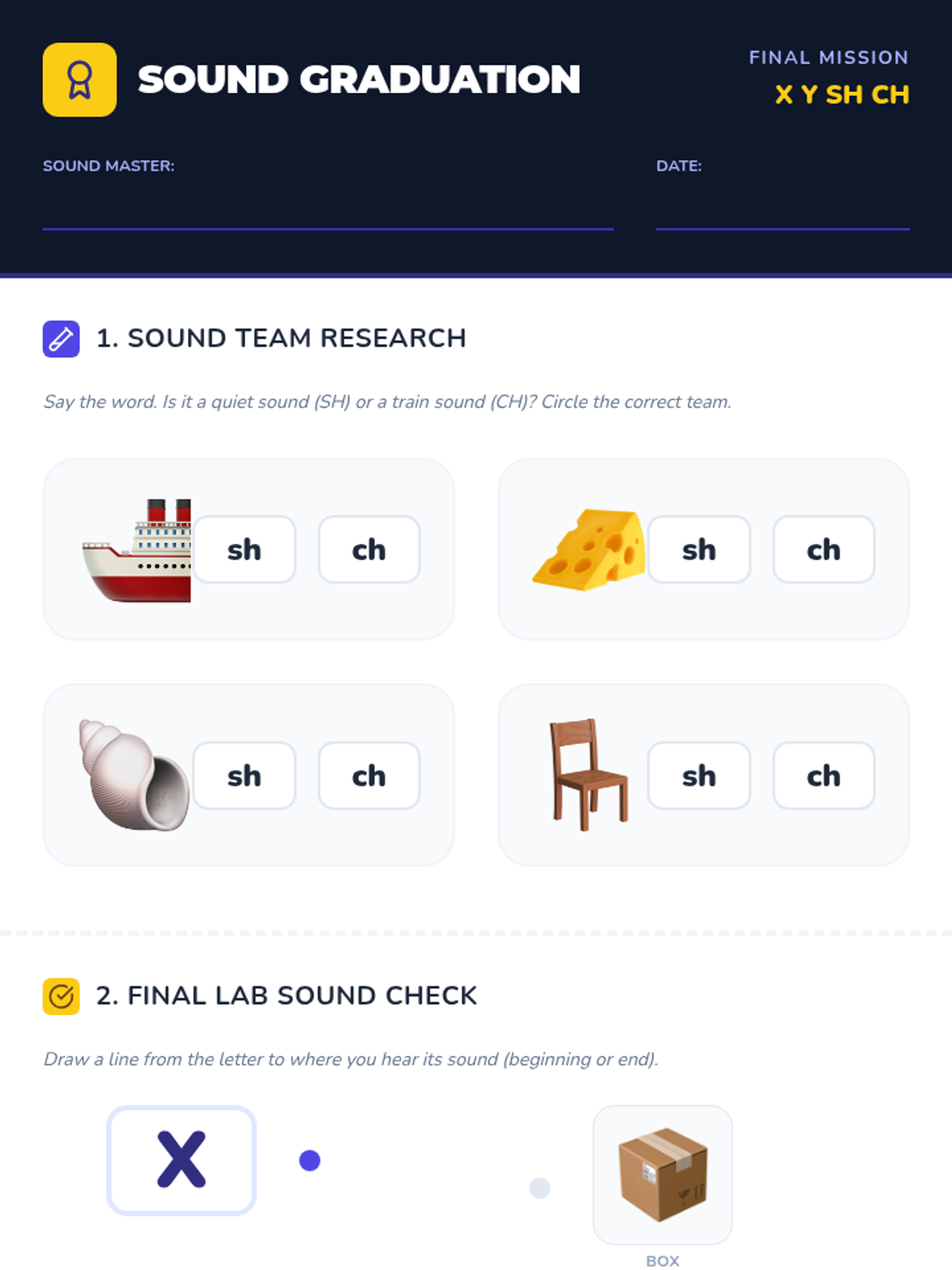 Wraps up the alphabet with X and Y, and introduces basic digraphs (SH, CH) to prepare students for complex blending.