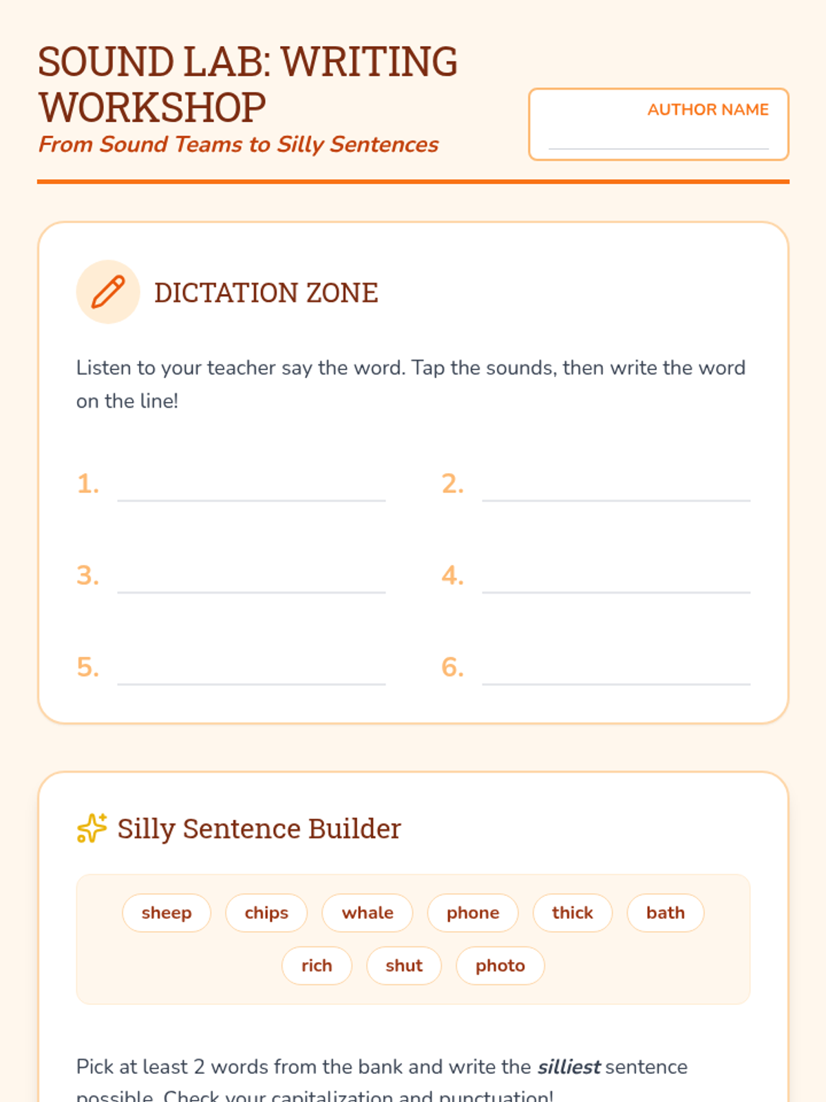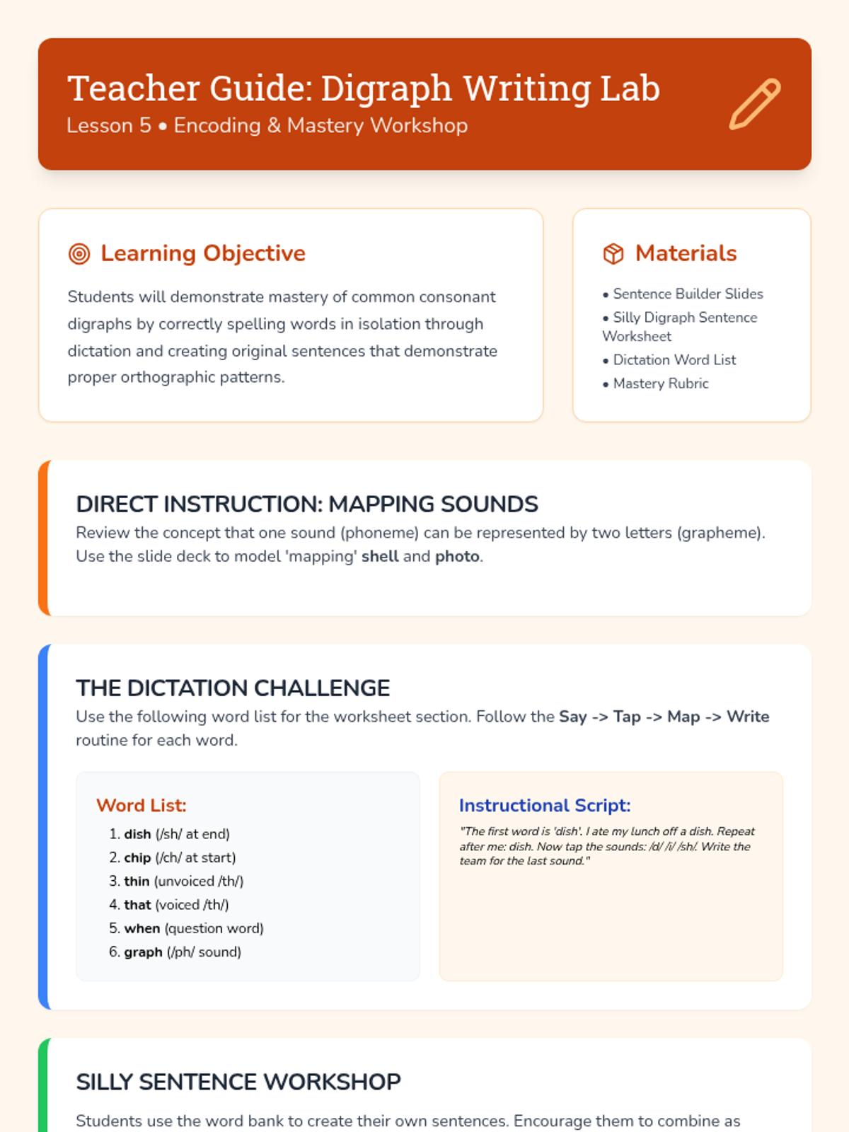 Students demonstrate mastery by spelling digraph words in isolation and creating original sentences in a writing workshop.