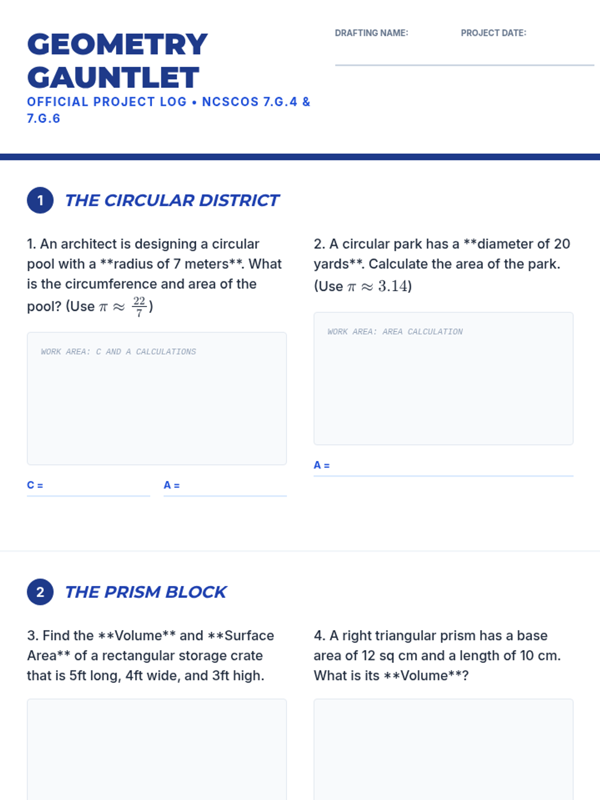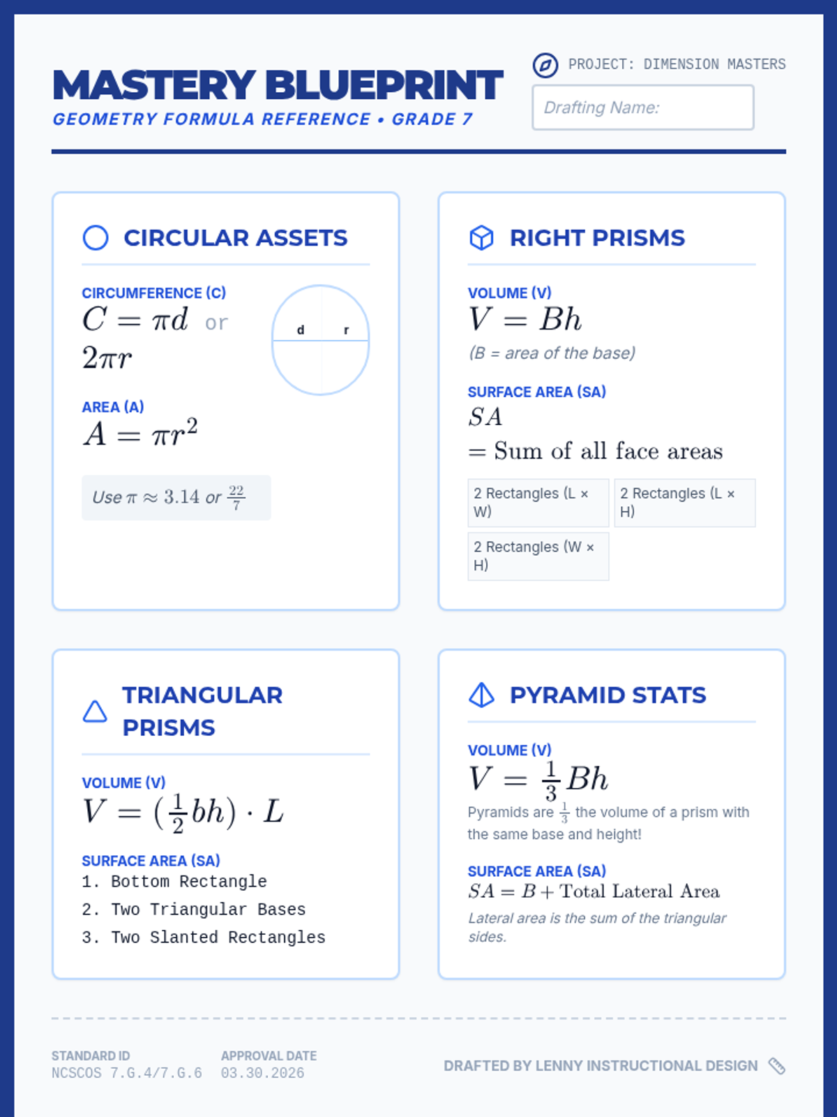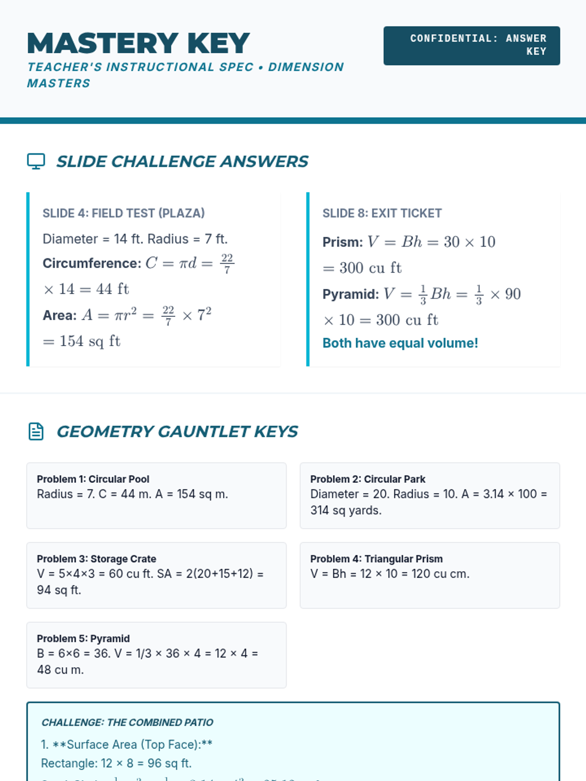 A comprehensive geometry lesson focusing on circles, prisms, and pyramids. Students master area, circumference, surface area, and volume through real-world architectural challenges and EOG-style combined concept problems.