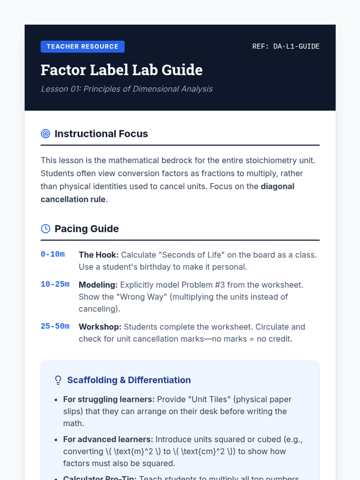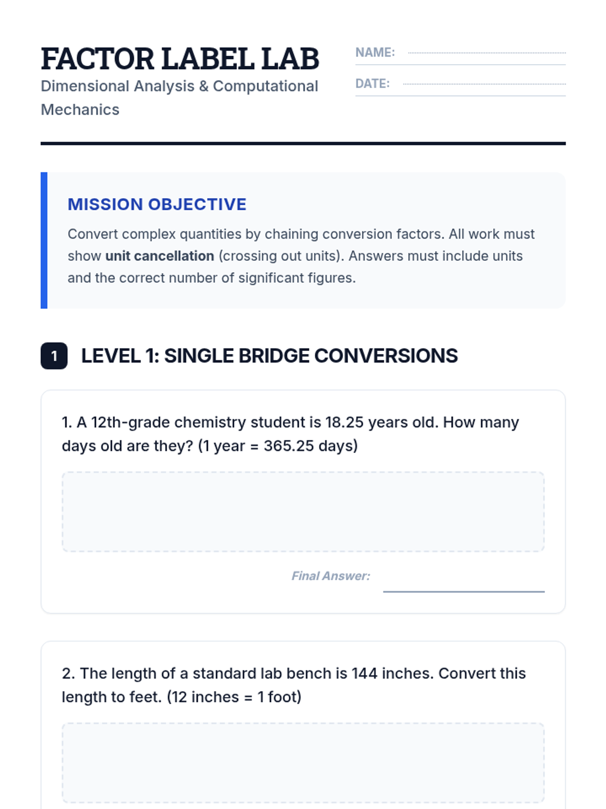 Students master the factor-label method using everyday units before transitioning to chemical applications, focusing on the rigorous setup and cancellation of units.