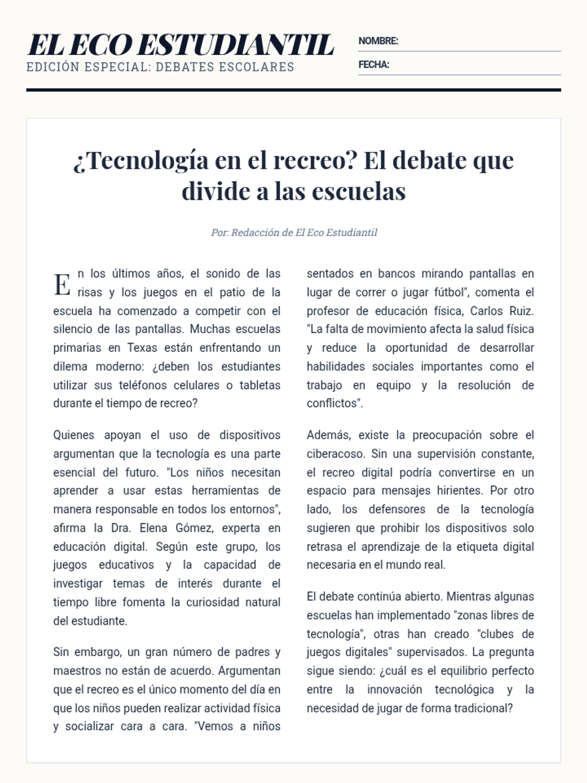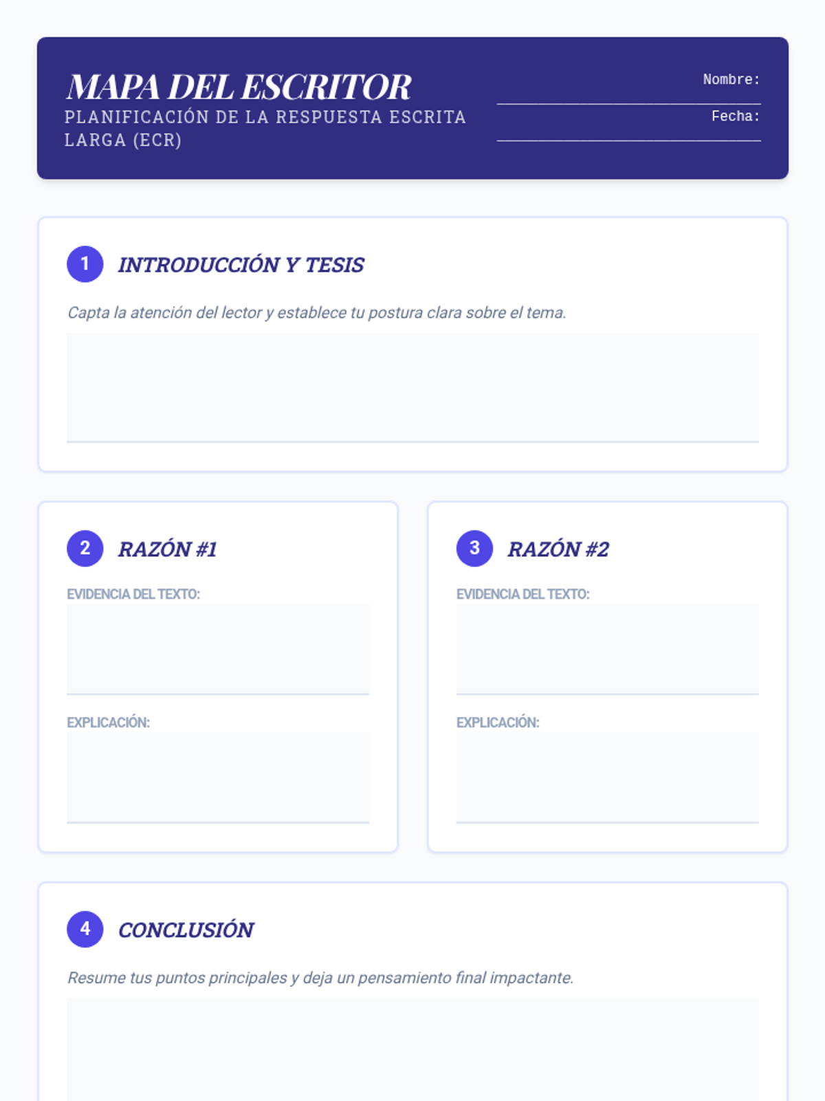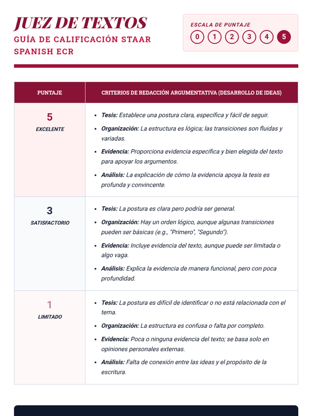 Una lección enfocada en desarrollar habilidades para la Respuesta Escrita Larga (ECR) en español, centrada en el género argumentativo para la prueba STAAR. Incluye un pasaje de lectura, un organizador gráfico de planificación y una guía de calificación detallada.