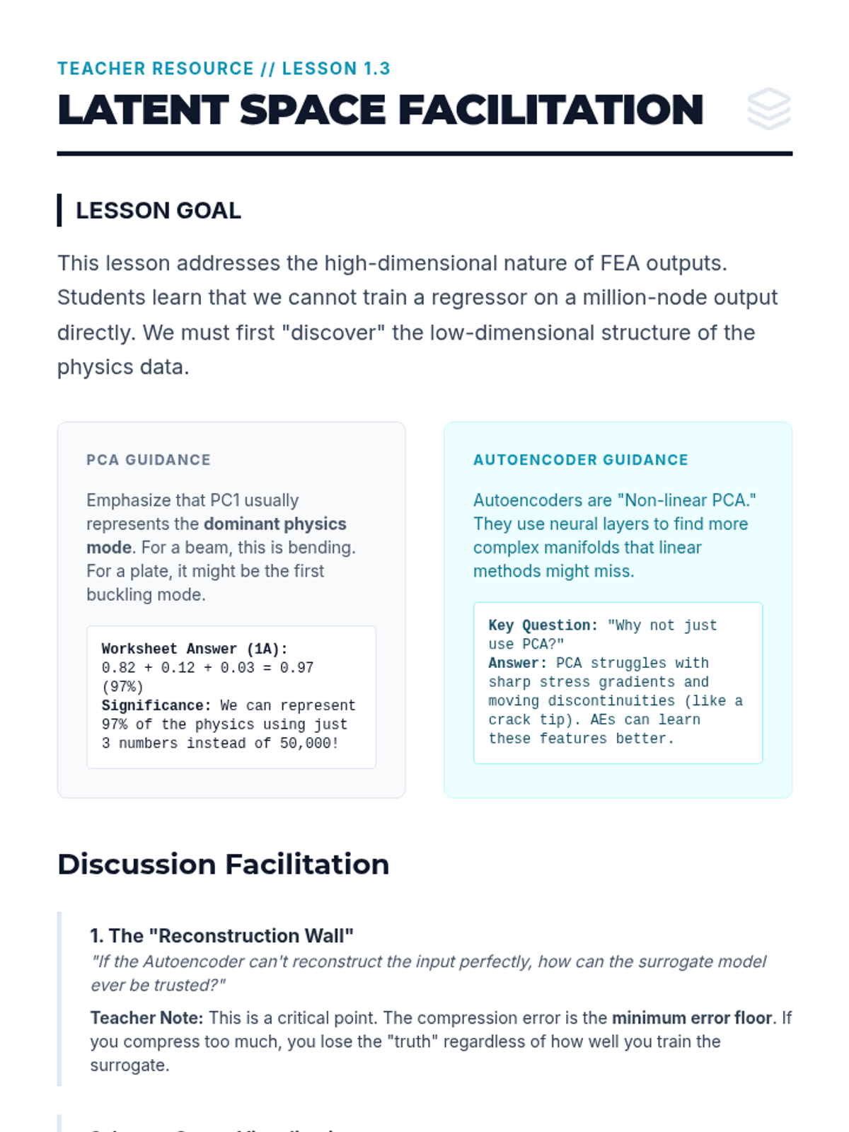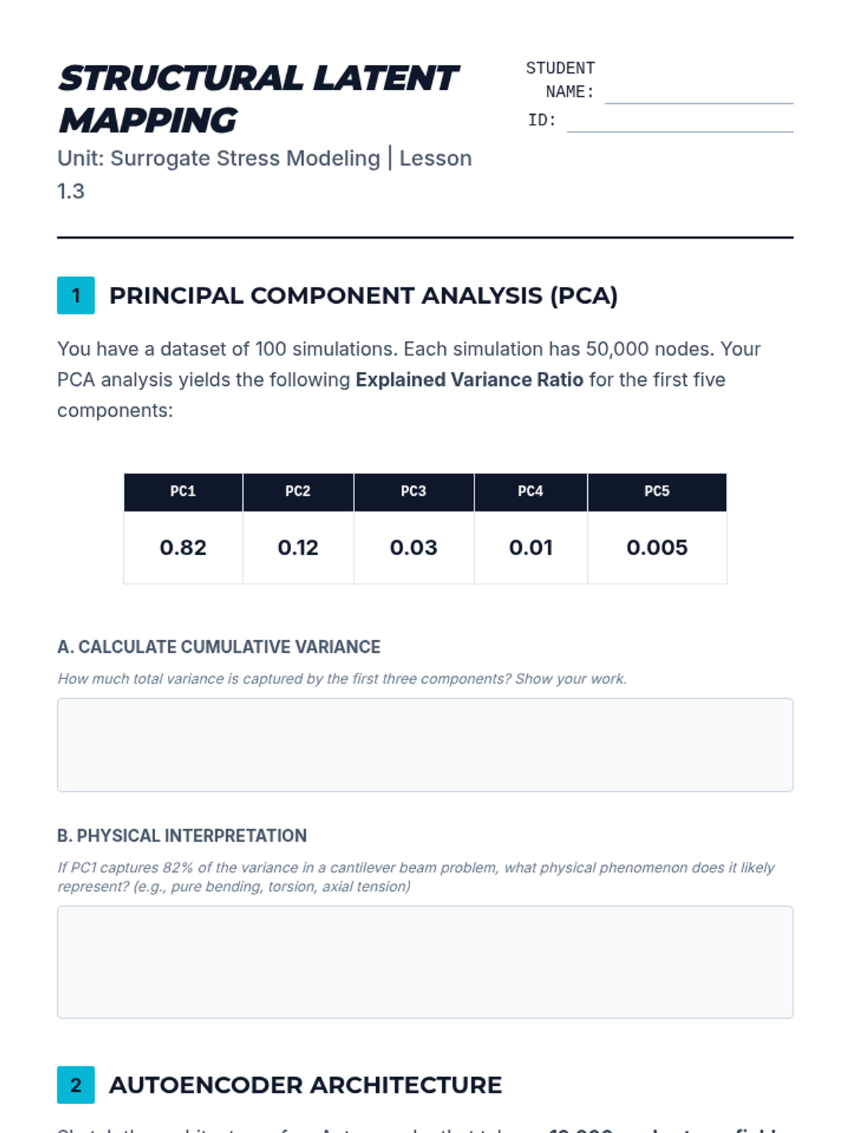 Students apply PCA and Autoencoders to compress high-dimensional stress fields, learning to manage the data intensity of structural simulations.