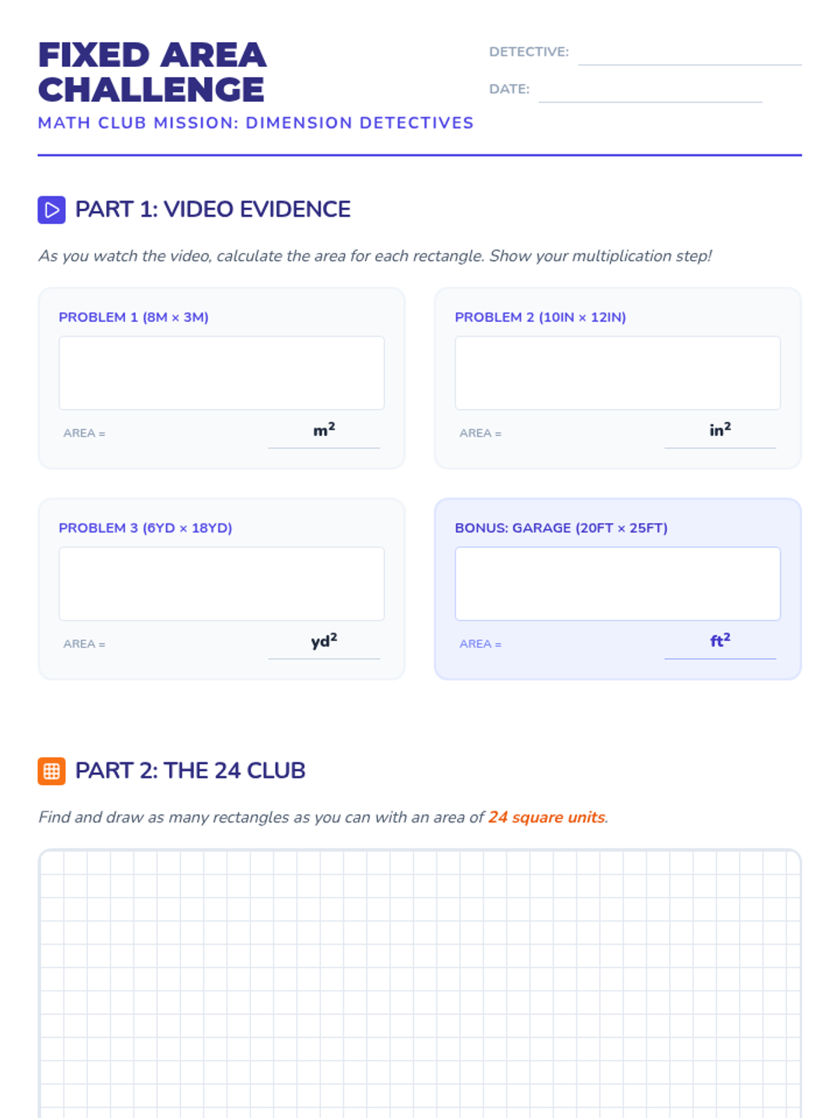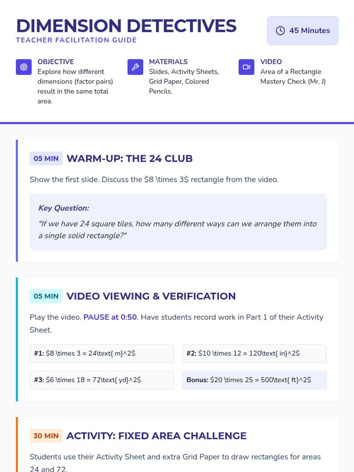 A hands-on exploration of the relationship between a rectangle's dimensions and its area, using factor pairs to discover how different shapes can share the same space.