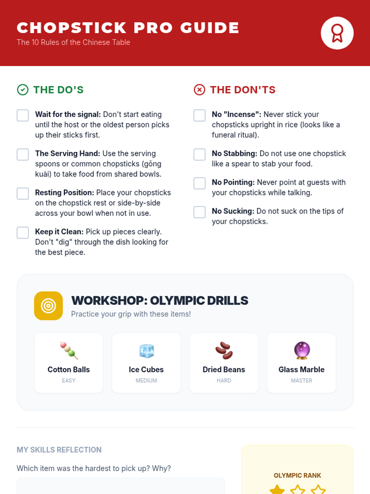 Focuses on Chinese dining table rules, chopstick taboos, and communal eating traditions through a 'Chopstick Olympics' workshop.