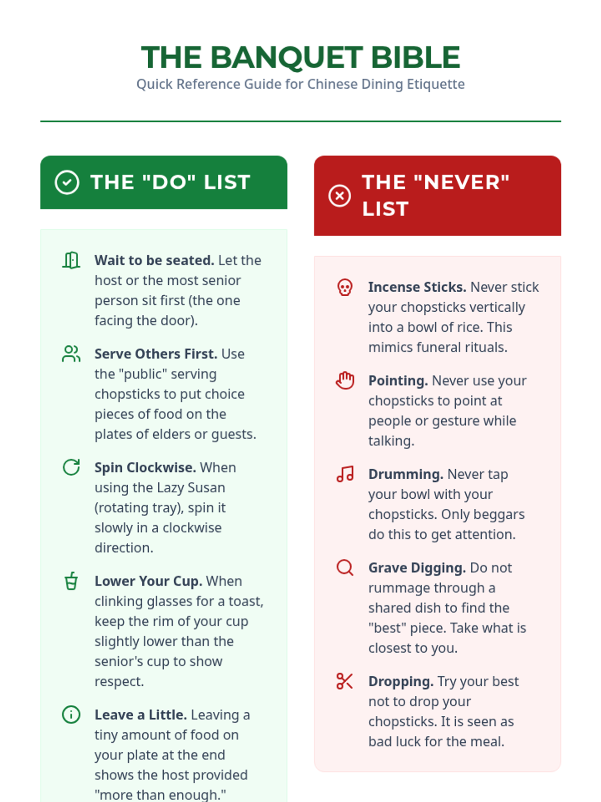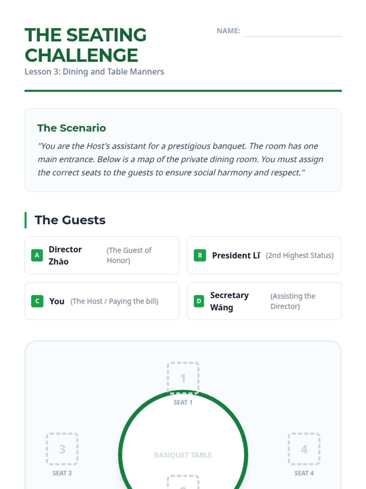 Students master the rules of the Chinese dining table, including seating arrangements, chopstick taboos, and the host-guest dynamic.