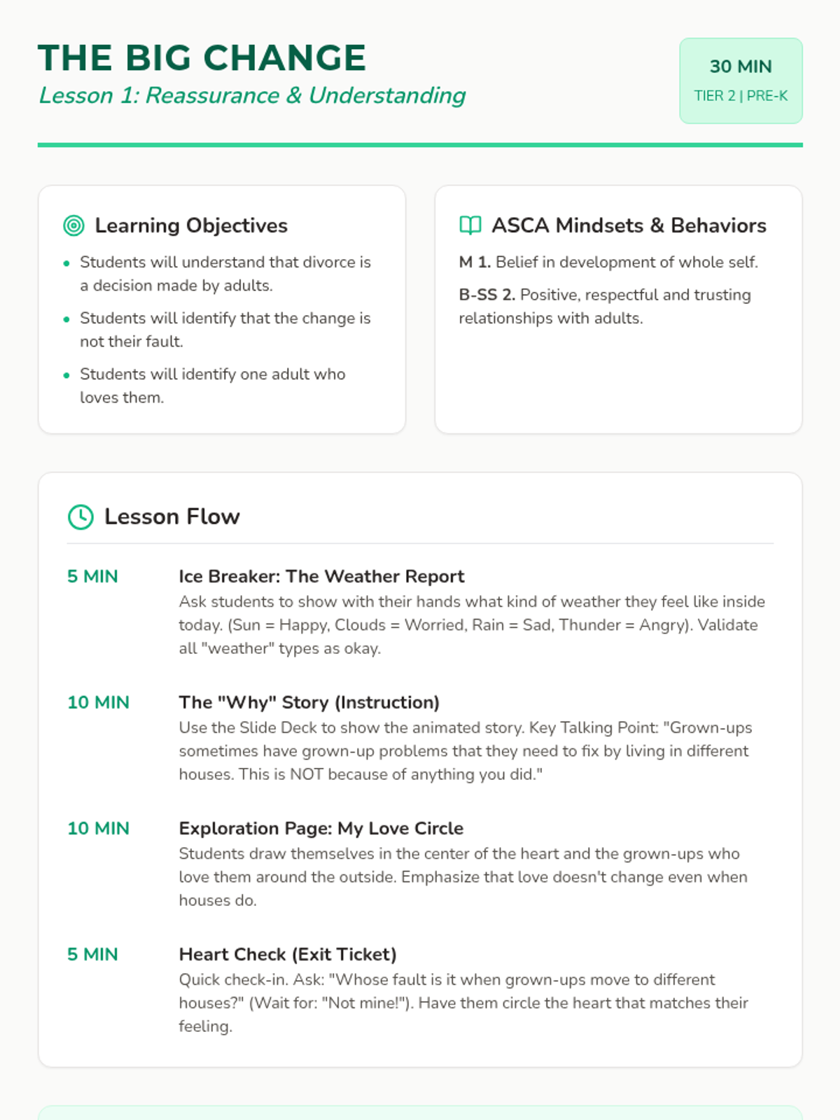 Focuses on the core message that divorce is a grown-up problem and never the child's fault, providing a foundation of safety and reassurance.