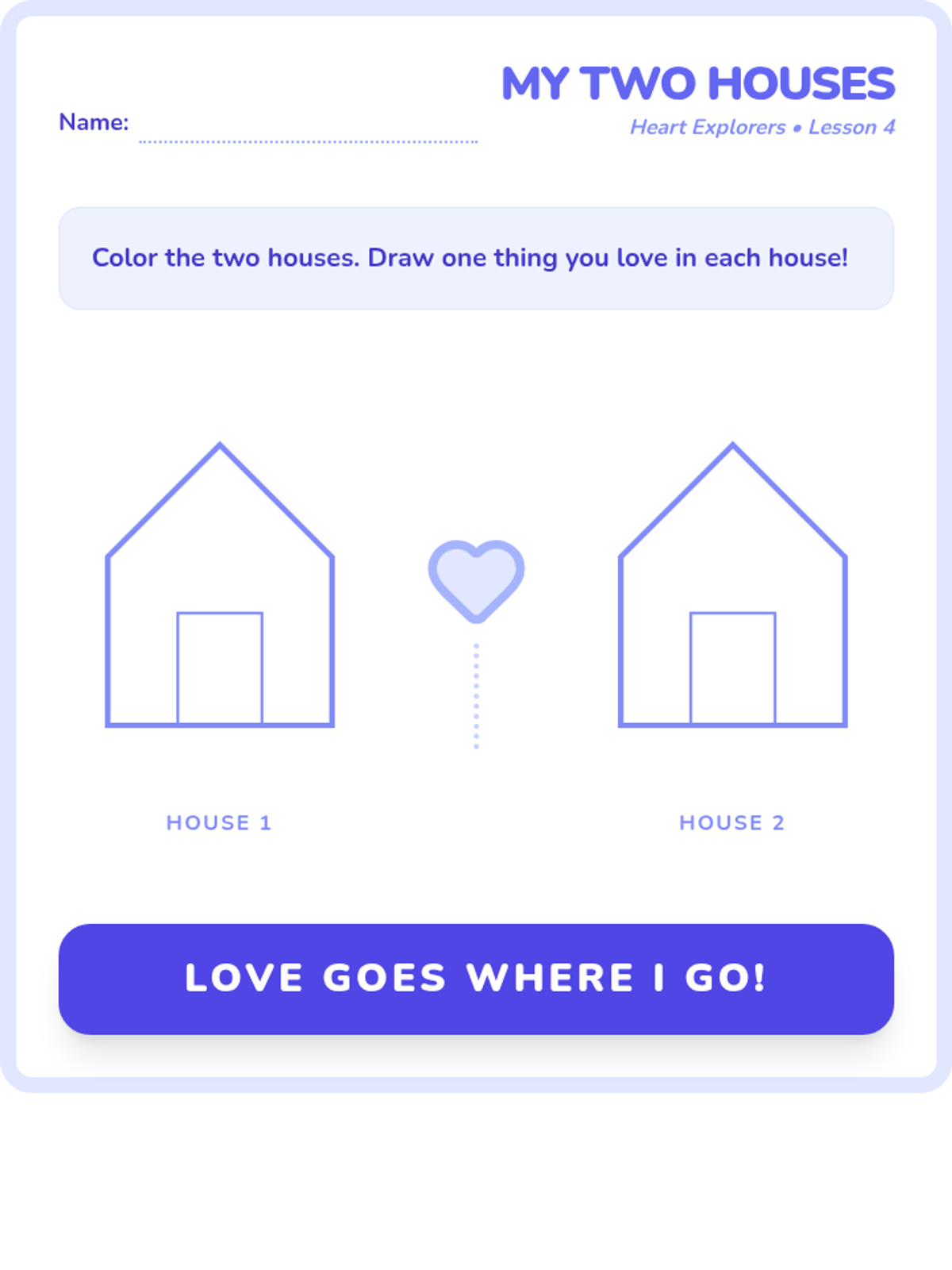 Explores the concept of having two homes and how family love stays the same even when the living situation changes.