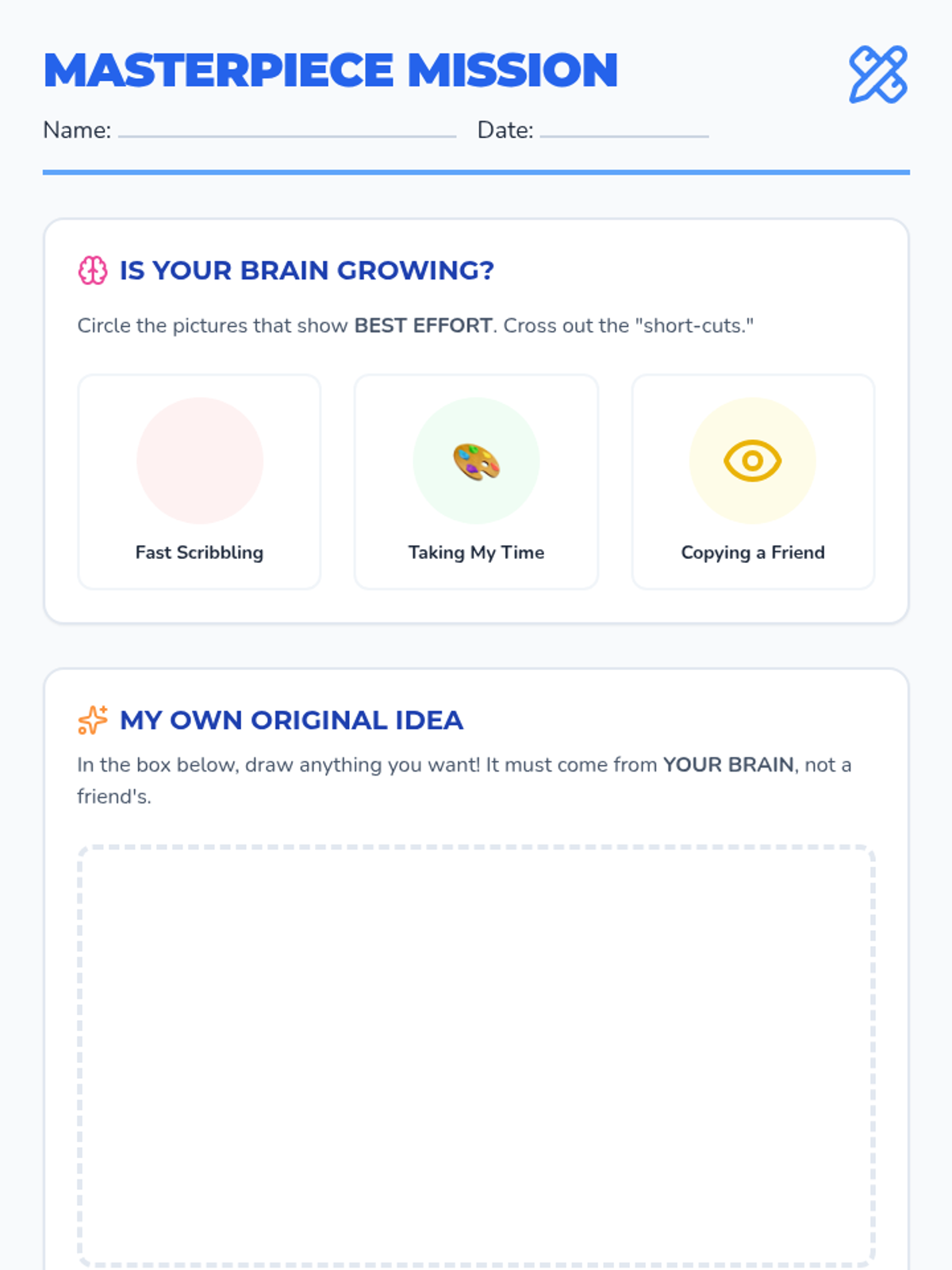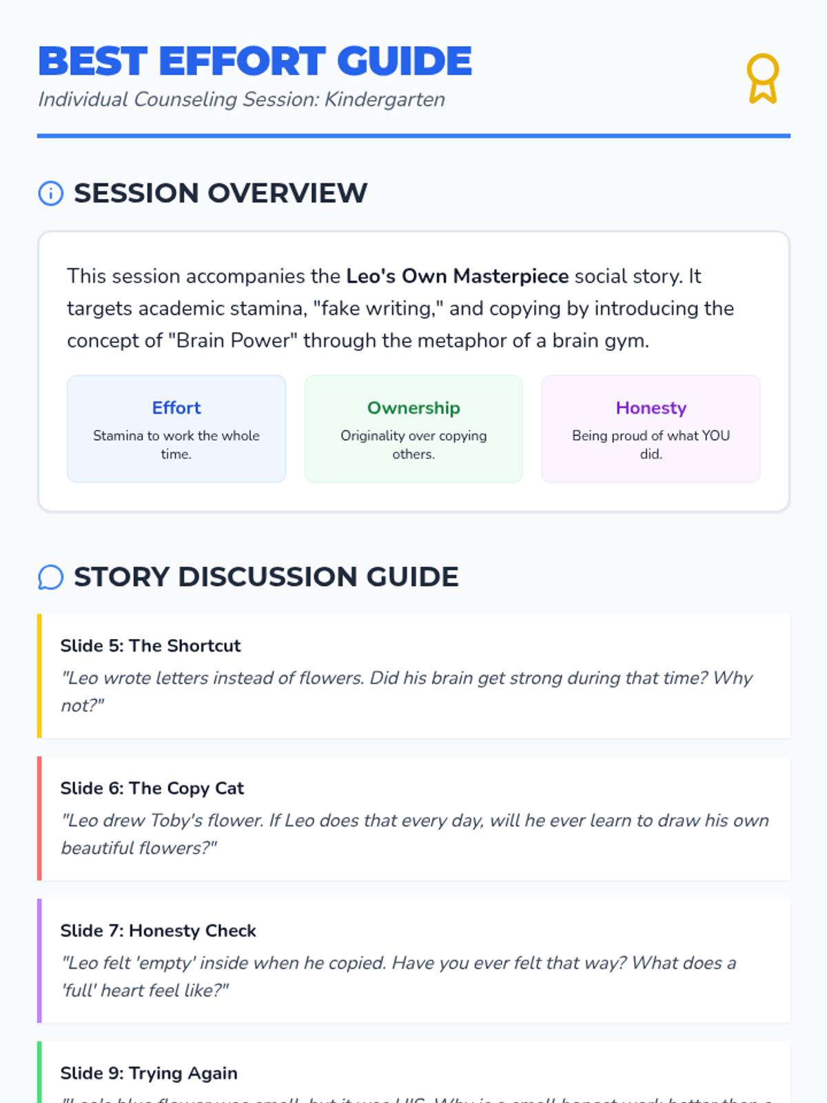A counseling lesson for kindergarteners focused on personal effort, the value of original work (not copying), and staying on task to grow their own 'brain power'.