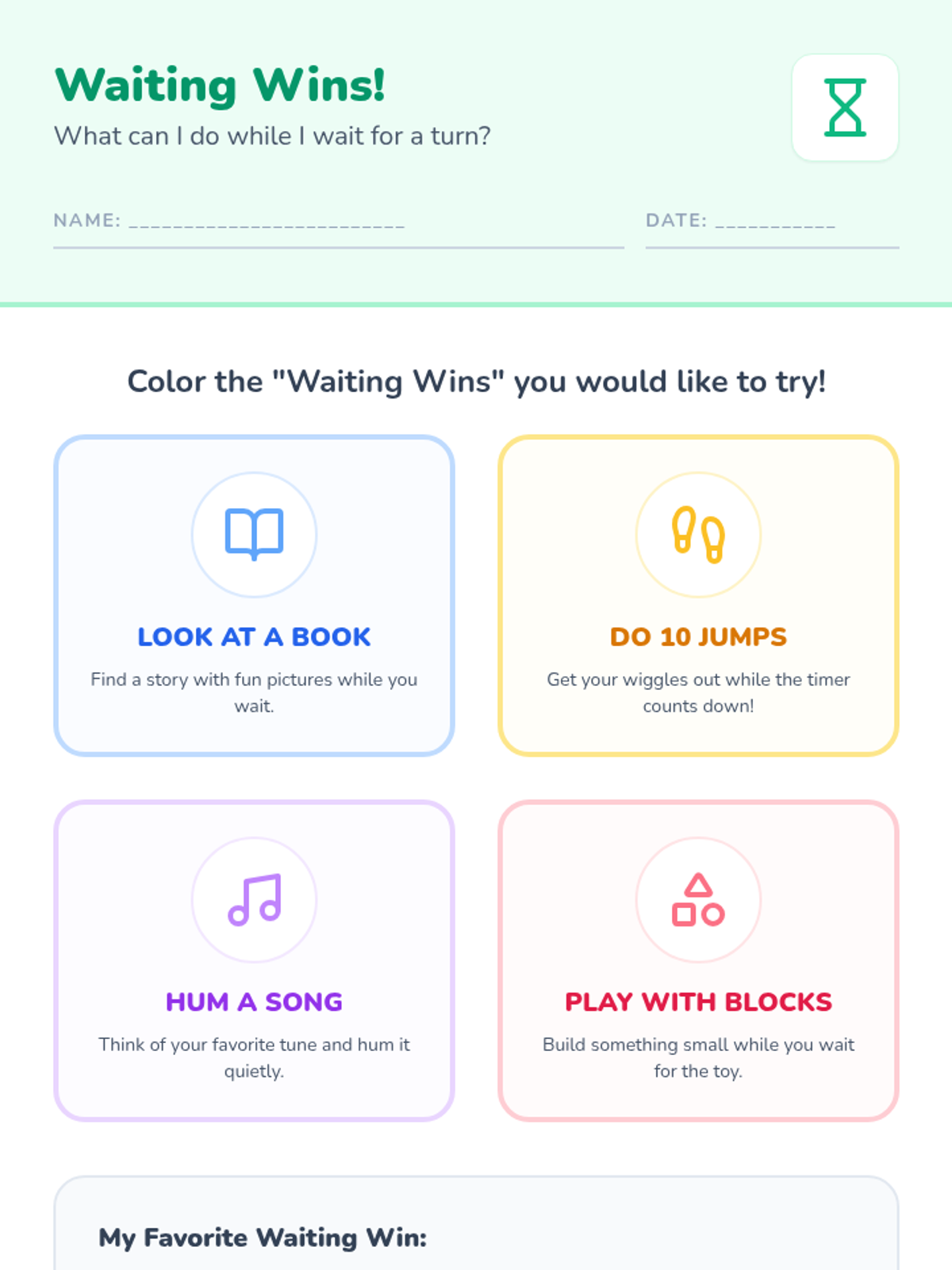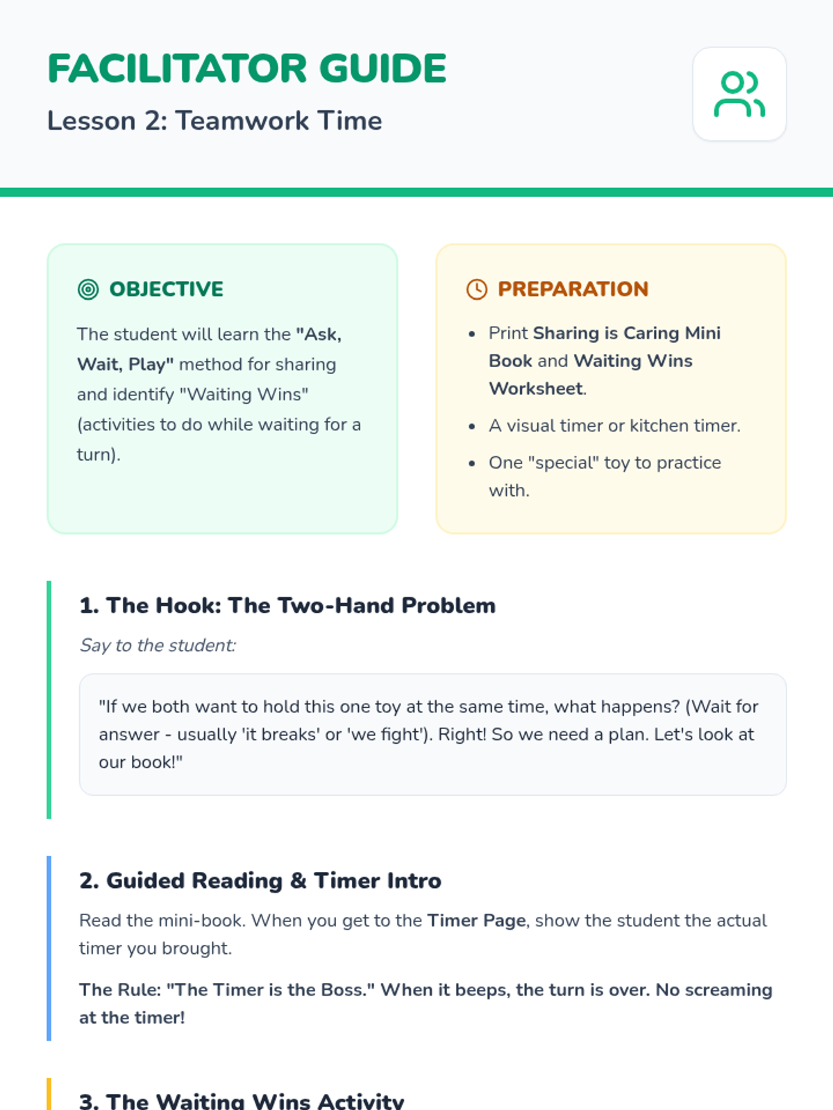 A lesson focused on the mechanics of sharing, including using timers, asking for a turn, and finding something else to do while waiting.