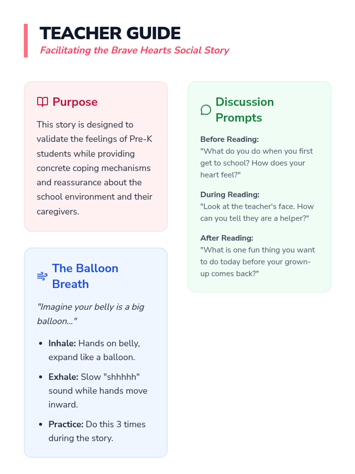 A set of resources designed to help Pre-K students manage separation anxiety through a comforting social story, relaxation techniques, and trust-building activities. It focuses on the 'Balloon Breath' and reinforcing the reliability of caregivers.