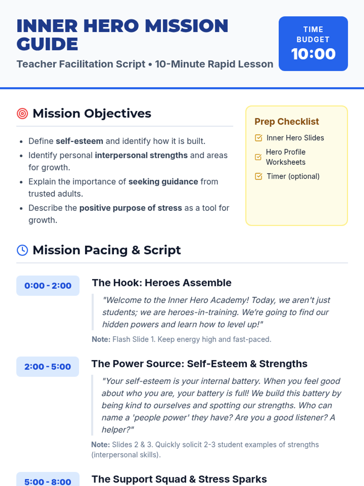 A fast-paced 10-minute lesson for 3rd graders focused on recognizing personal strengths and growth through a detective and investigation theme. Covers self-esteem, seeking adult guidance, and positive stress.