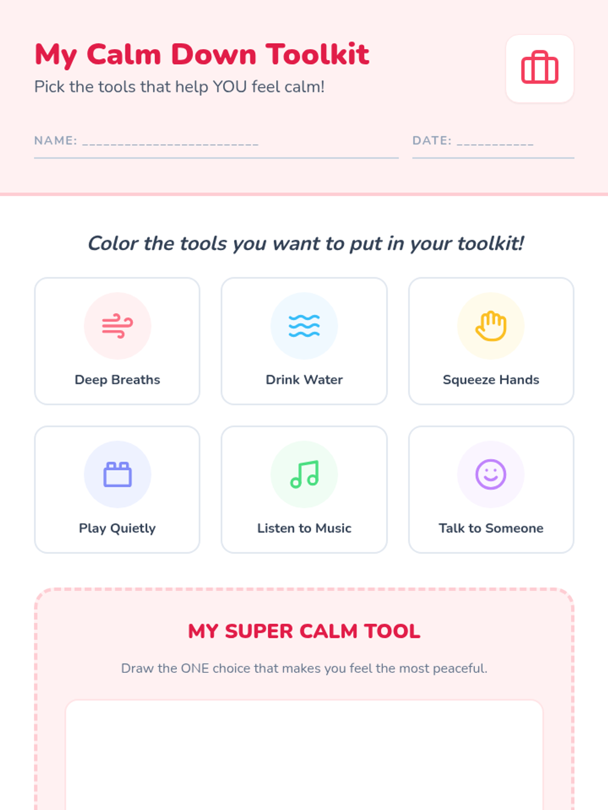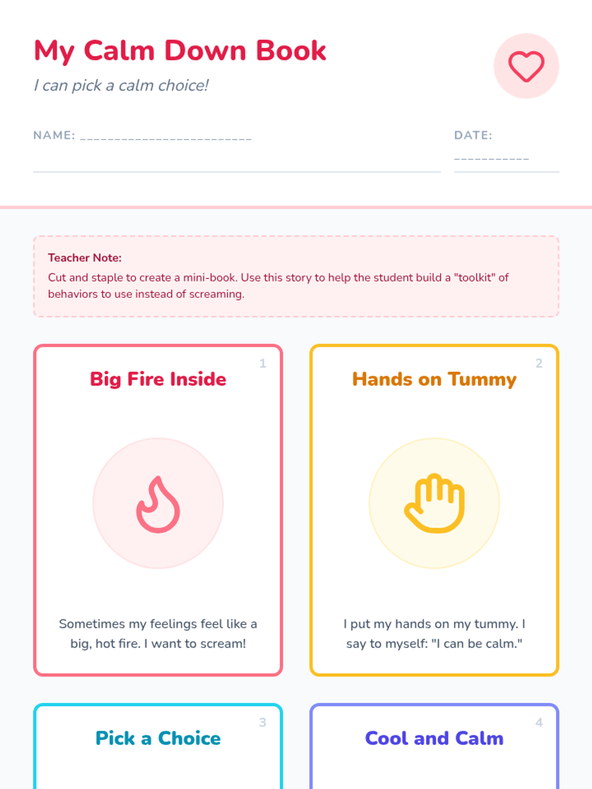 A lesson that provides the student with a toolkit of 'calm down' choices when they feel the urge to scream or react strongly to disappointment.