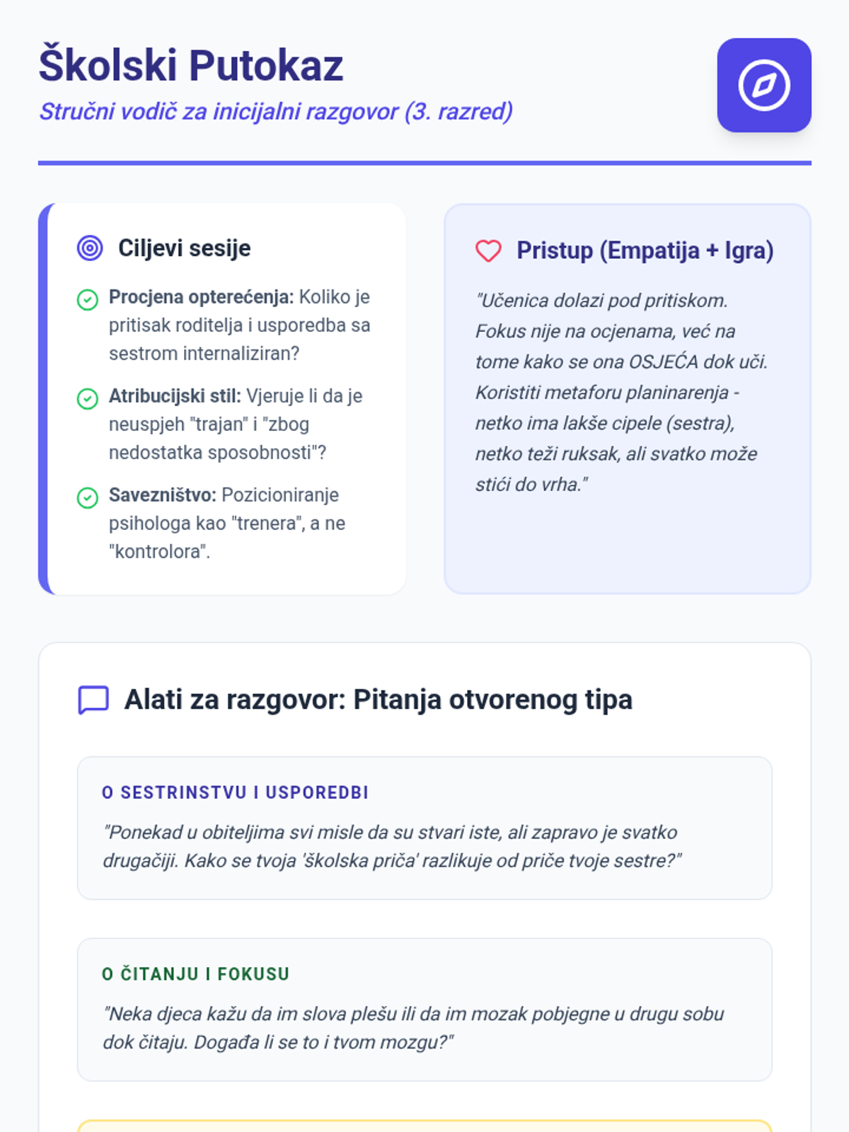 Prvi susret s učenicom trećeg razreda usmjeren na procjenu motivacije, atribucijskih stilova i uspostavljanje povjerenja kroz kreativne aktivnosti.
