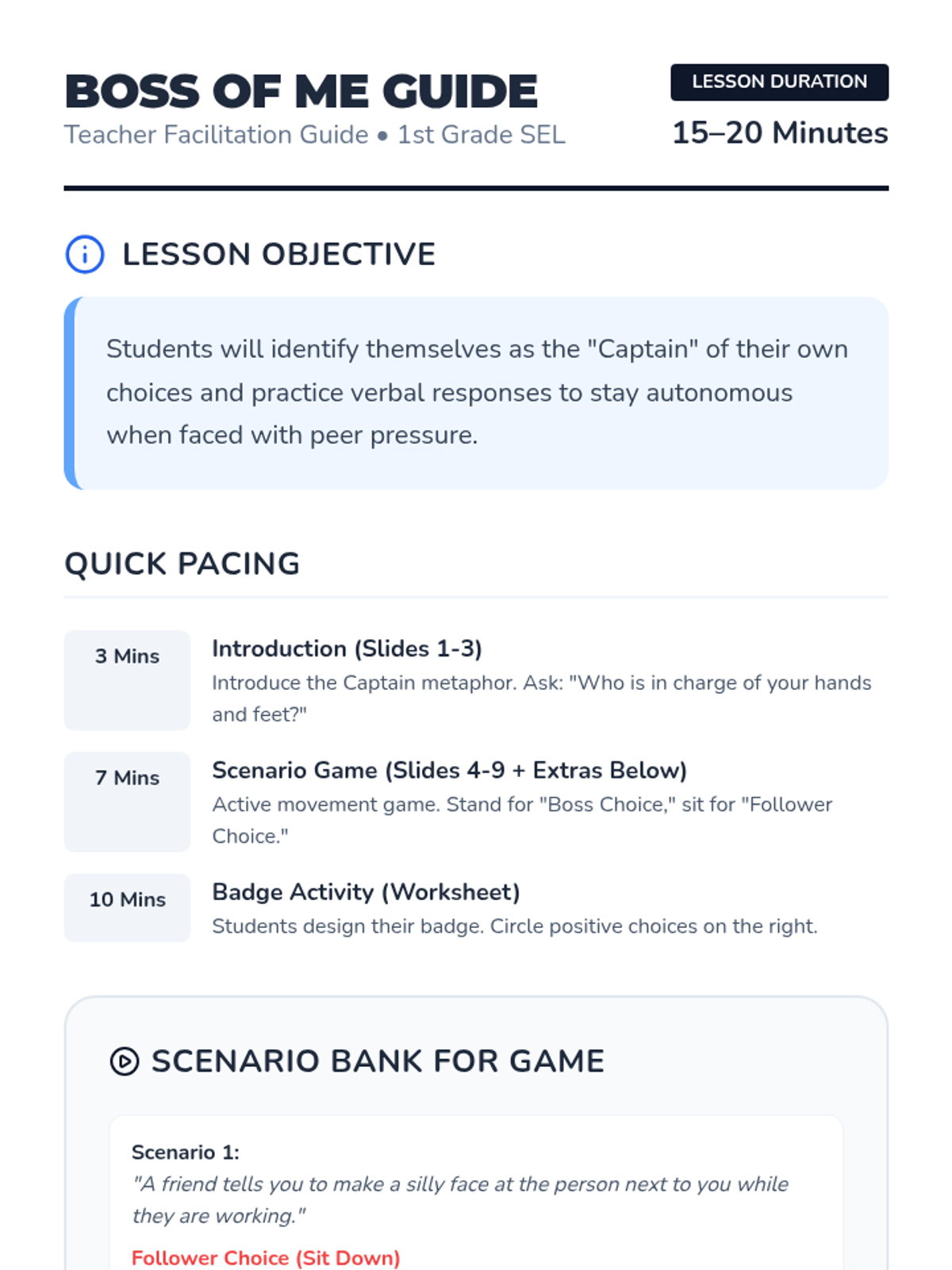 A fast-paced social-emotional learning lesson helping first graders understand they are the captains of their own choices, even when friends suggest otherwise.