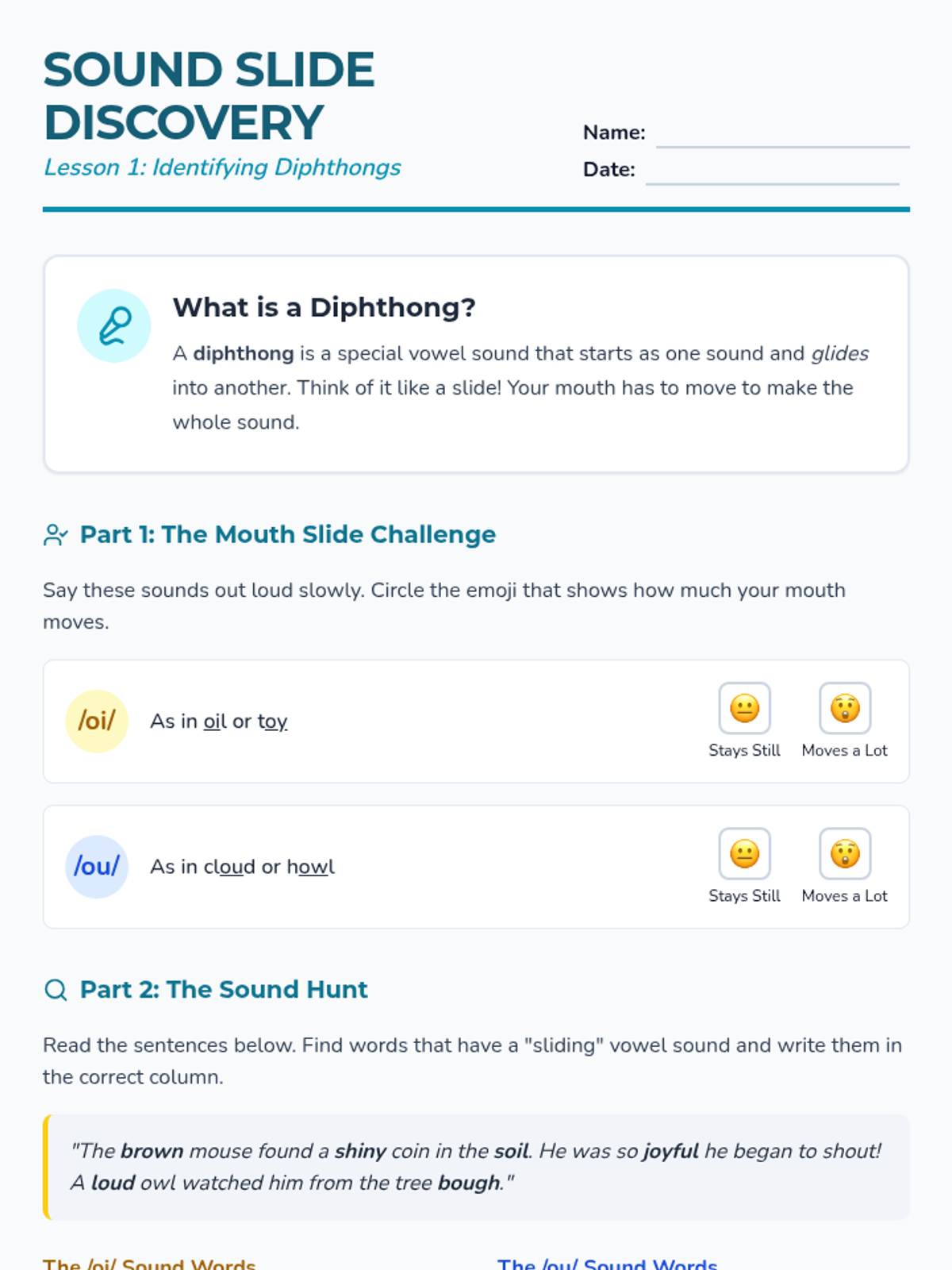 Students identify diphthongs and vowel glides by focusing on mouth movements and auditory discrimination through a "Sound Hunt."