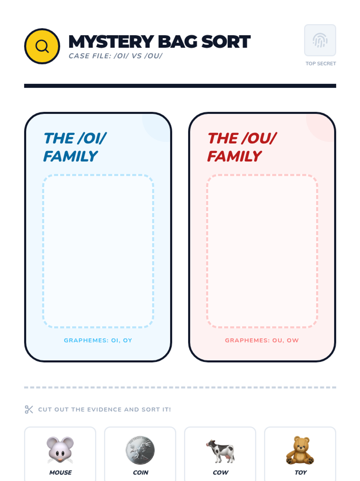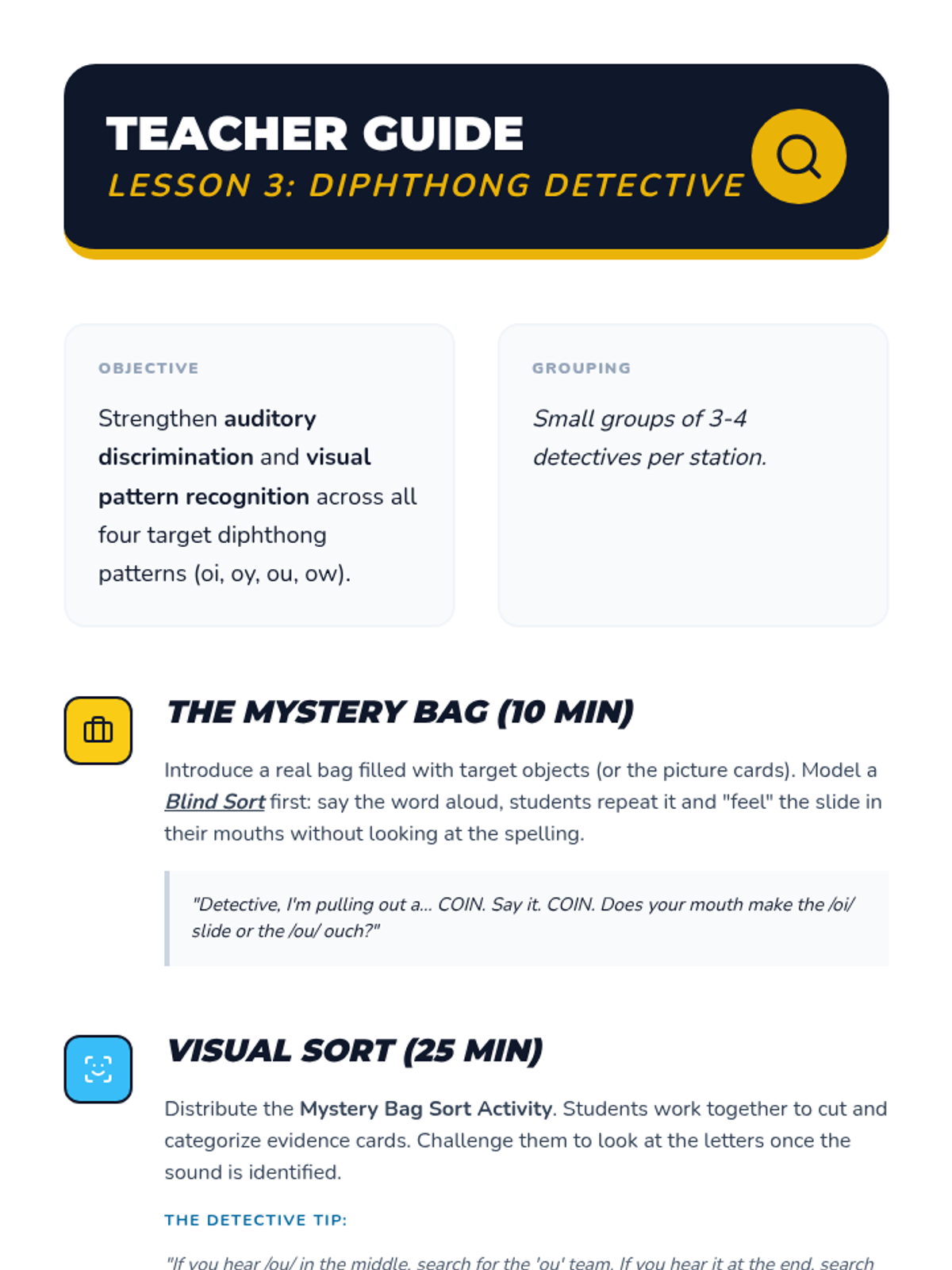 A comparative analysis of all four diphthong patterns (oi, oy, ou, ow) to strengthen auditory and visual discrimination skills.