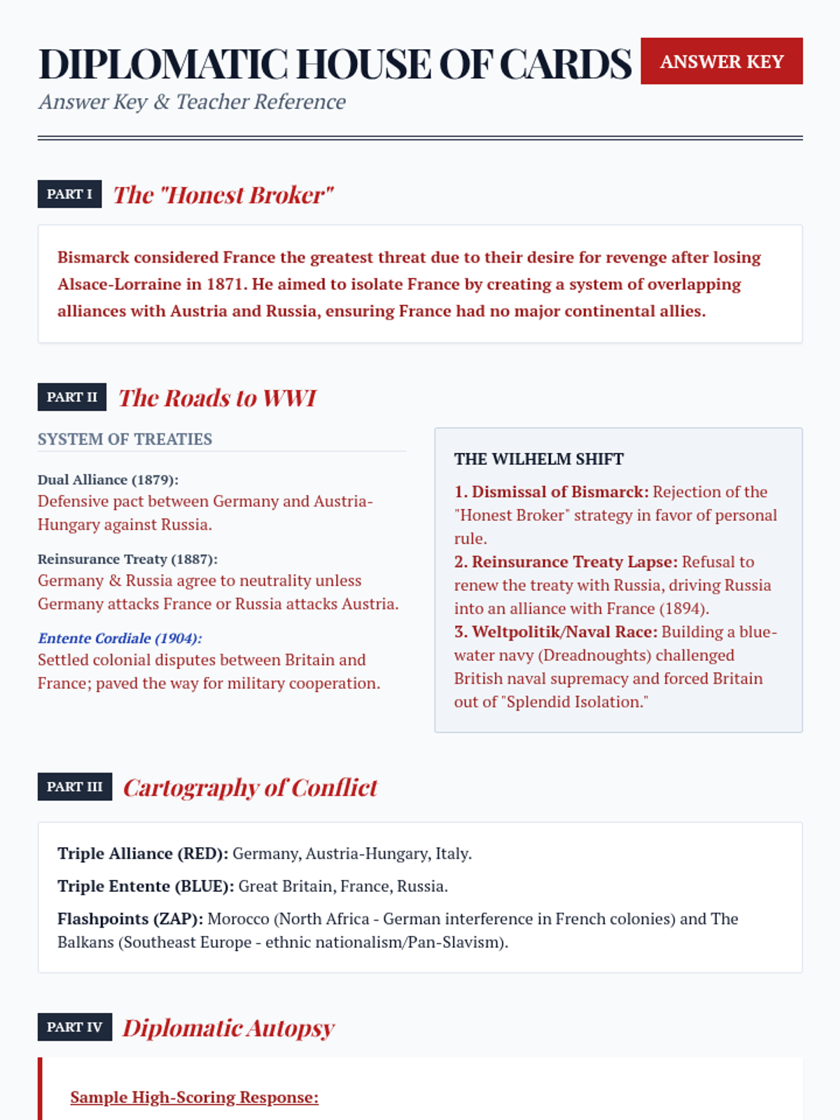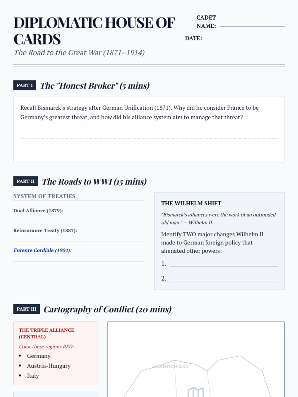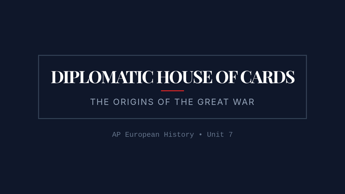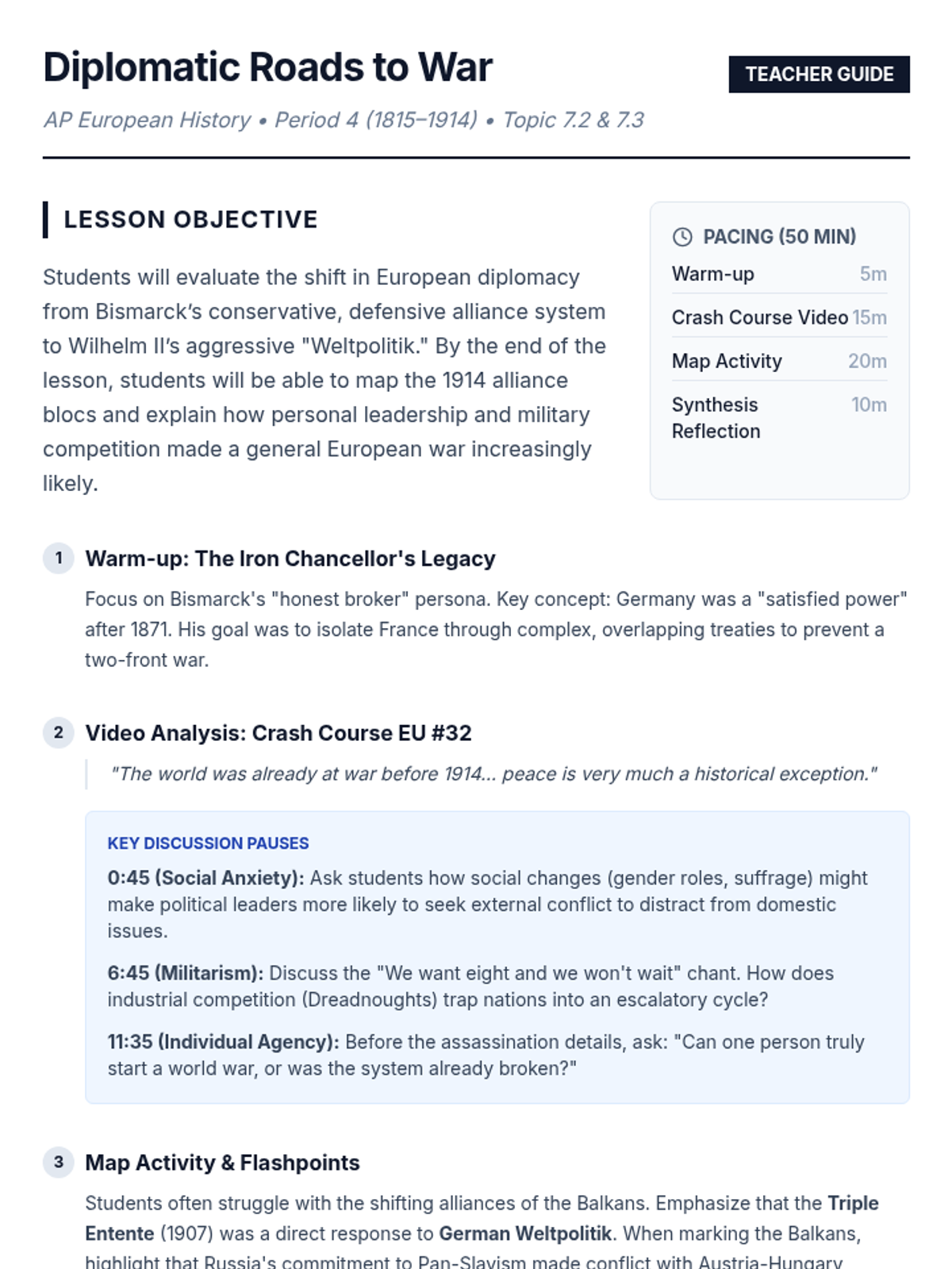 This lesson explores the complex diplomatic shifts and social tensions leading to World War I, contrasting Bismarck's stabilizing alliance system with Wilhelm II's aggressive 'Weltpolitik.' Students analyze primary causes through a video guide, map activity, and synthesis reflection.
