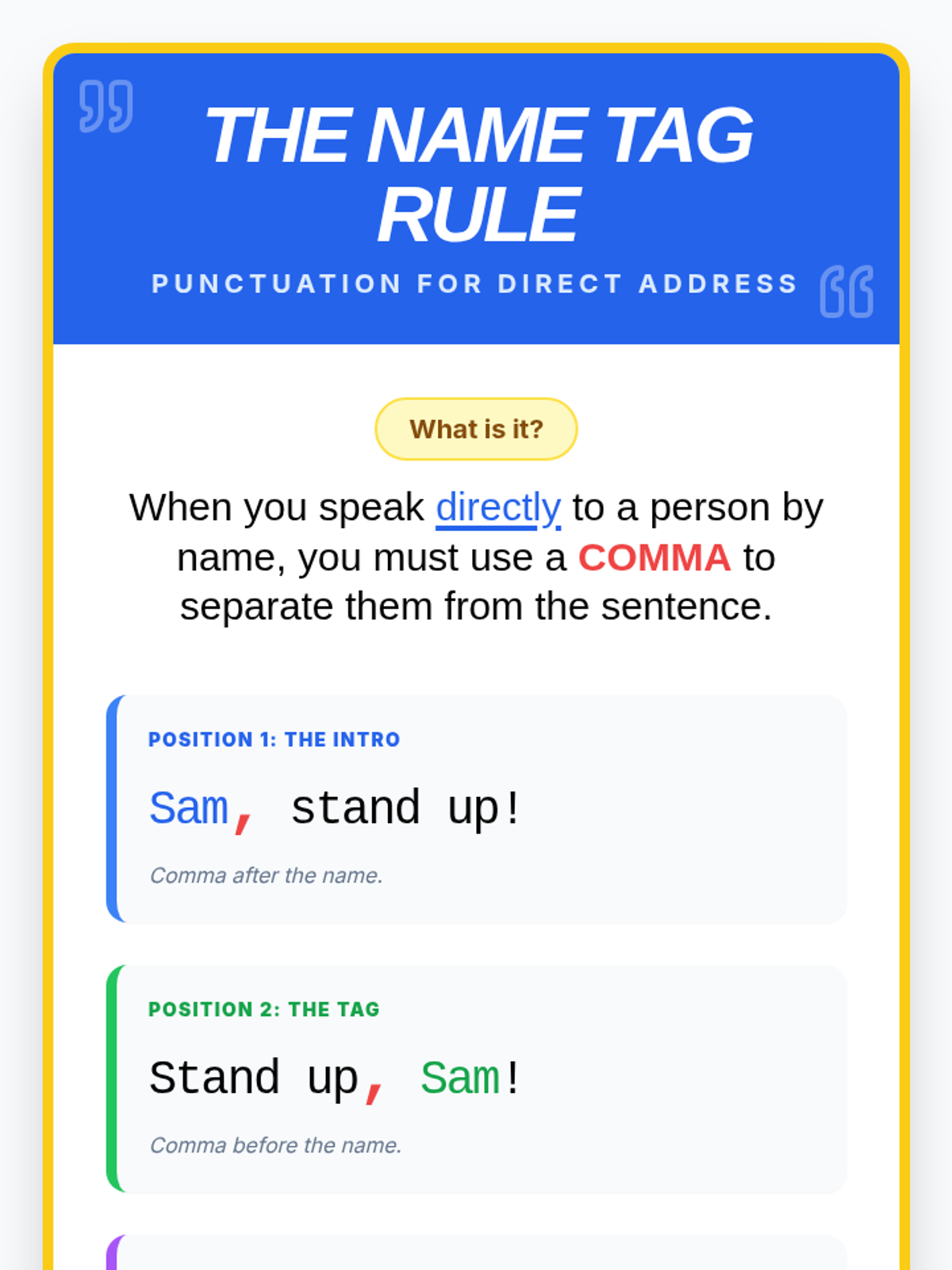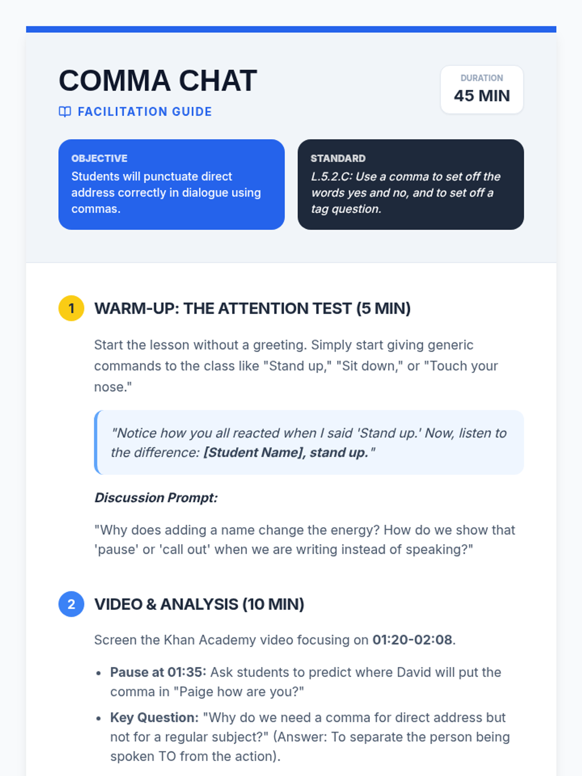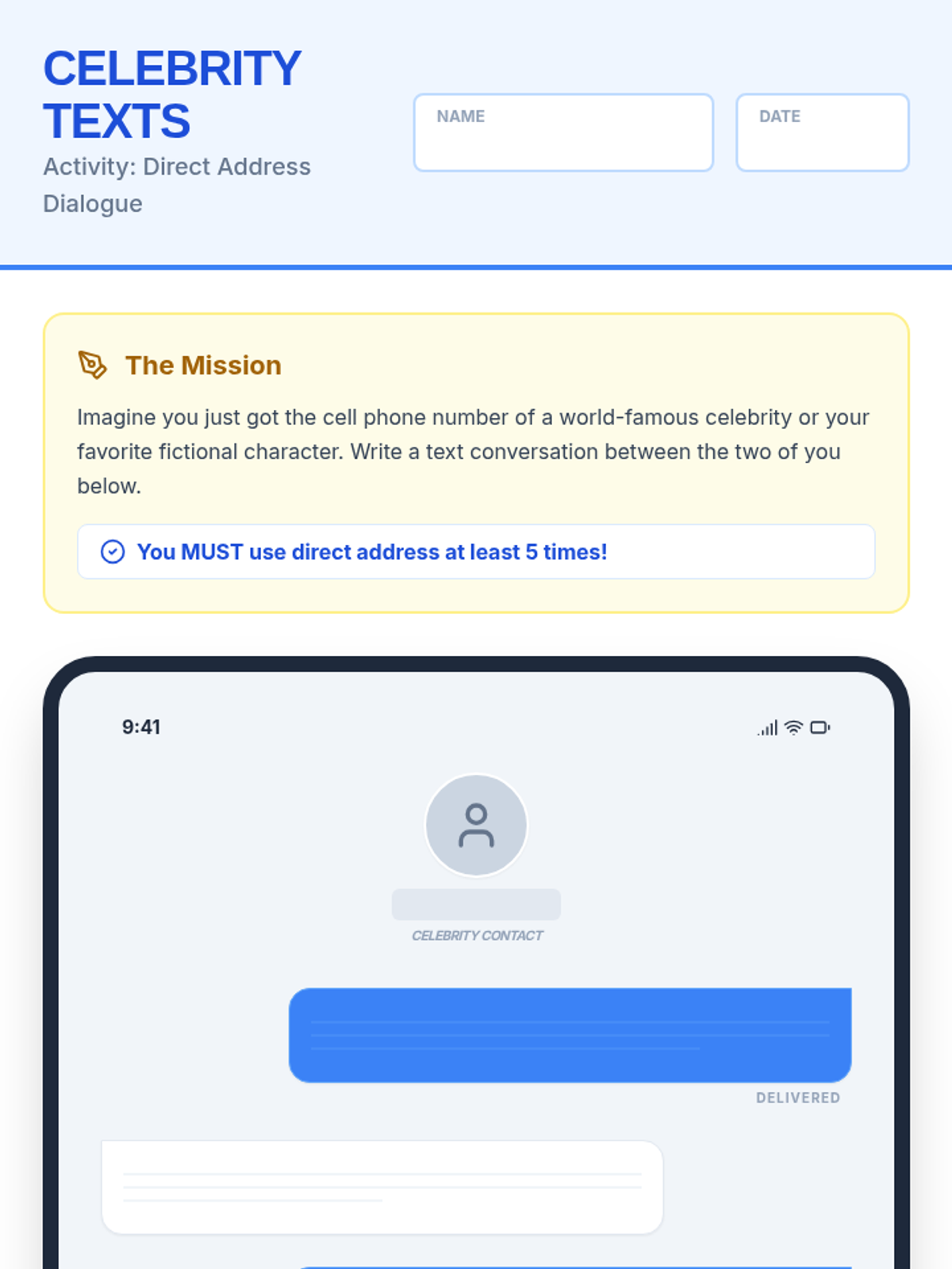 A lesson focusing on the correct punctuation of direct address in dialogue, featuring a celebrity-themed text message activity and a grammar video analysis.