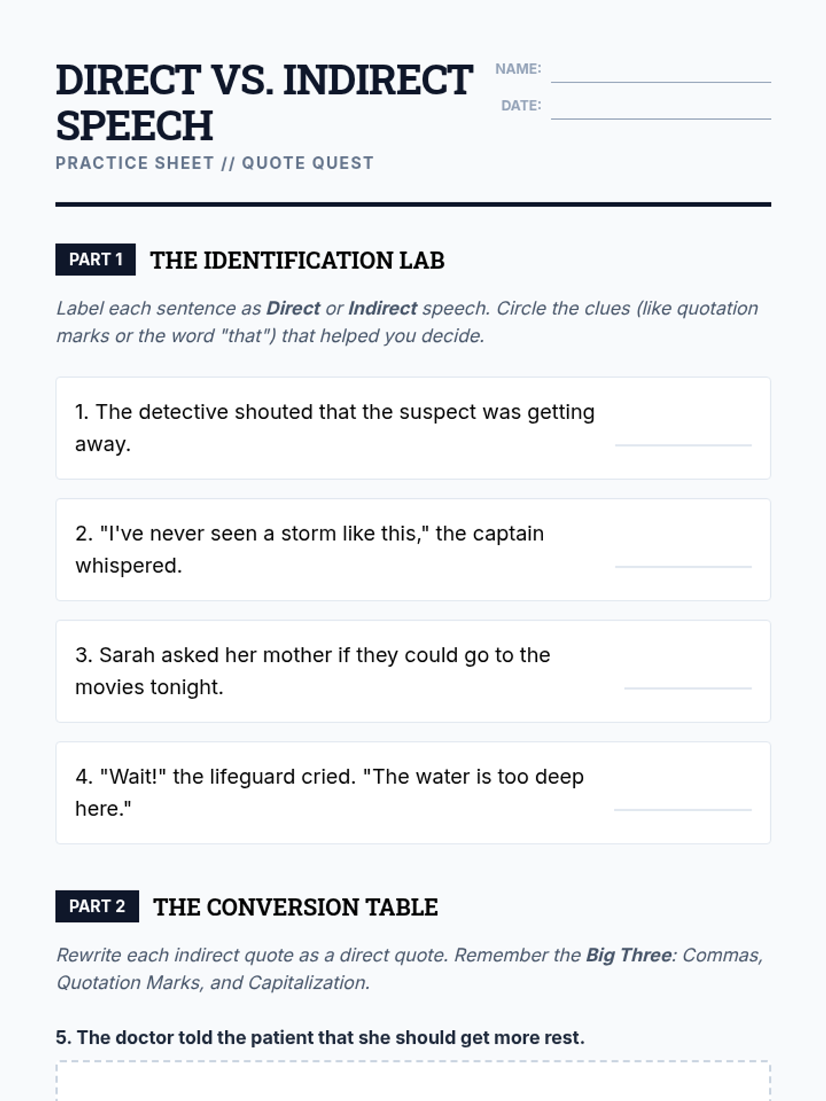 Students differentiate between someone's exact words and a paraphrase, practicing the conversion of indirect speech into direct quotes with proper capitalization and opening punctuation.