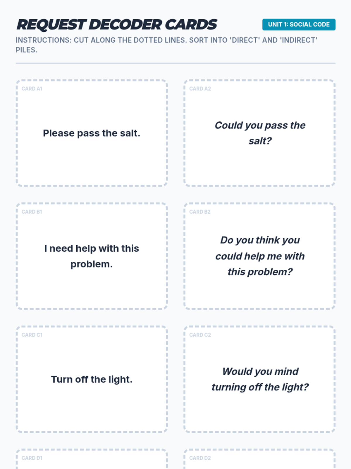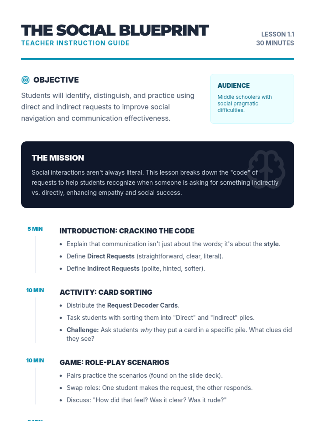 This lesson helps students distinguish between direct and indirect requests through experiential sorting and role-playing activities, specifically designed for middle schoolers working on social pragmatic skills.