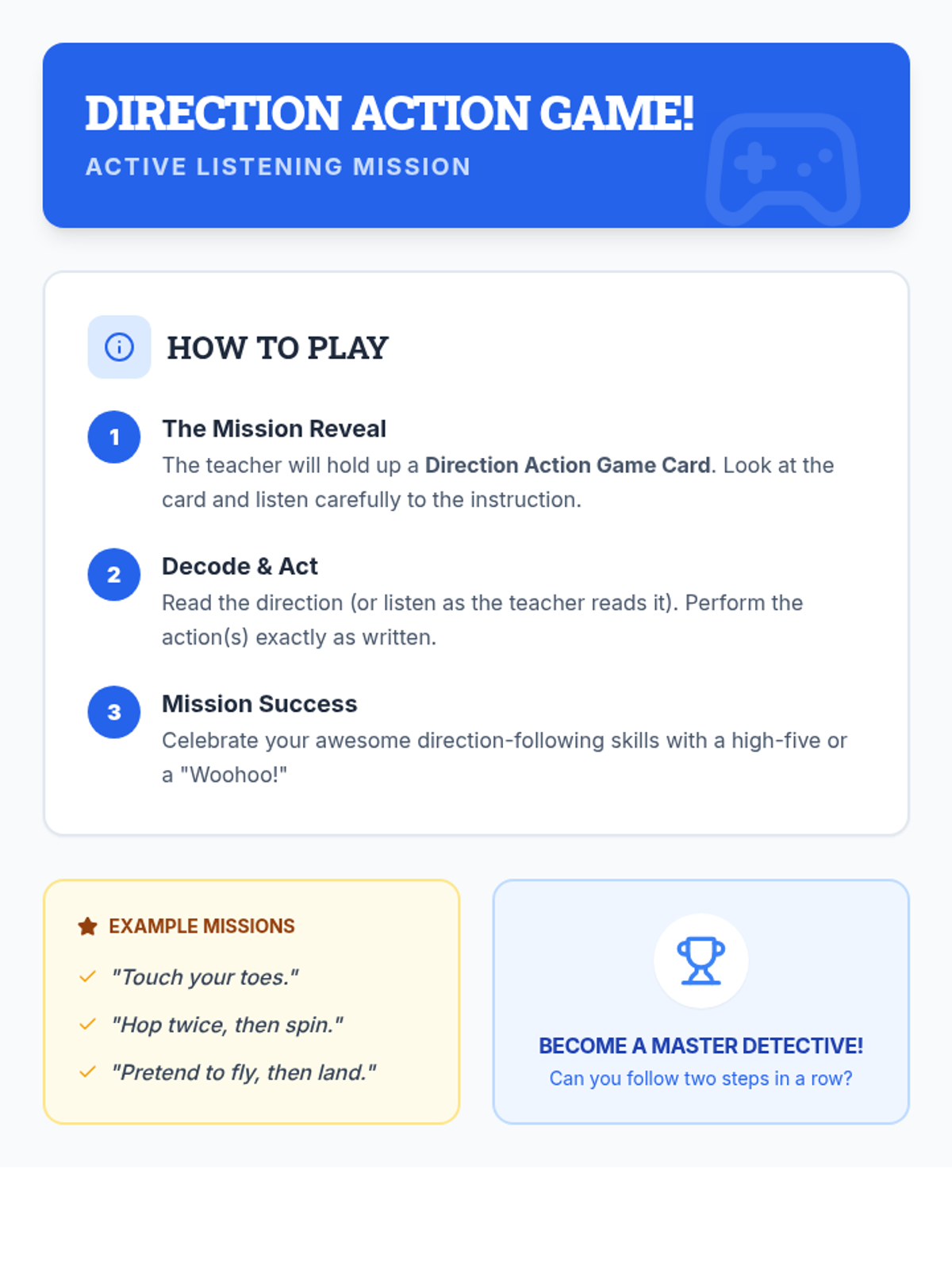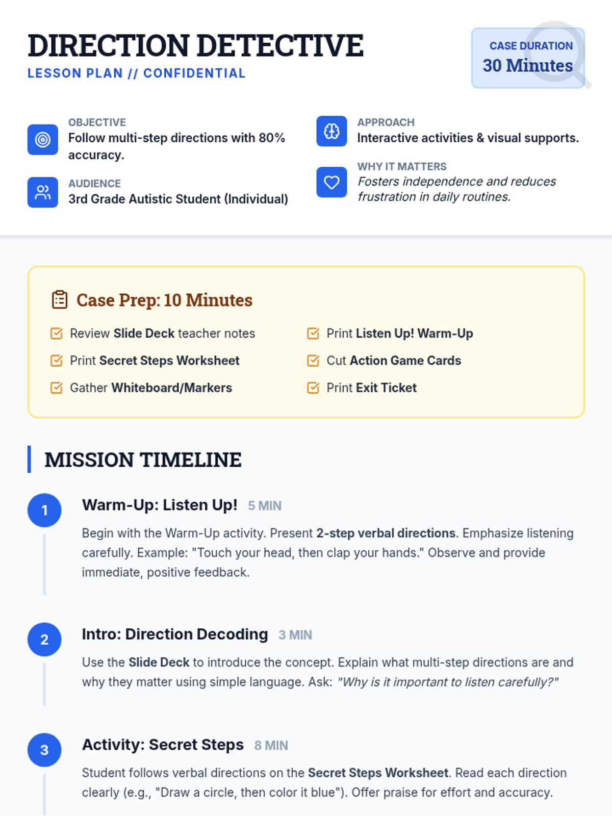 A 30-minute individualized lesson for a 3rd-grade autistic student focused on following multi-step directions through engaging activities and visual supports.