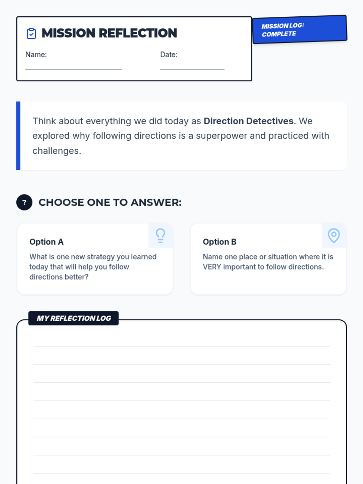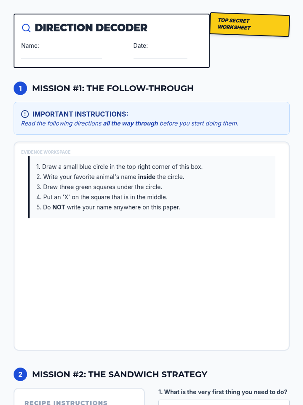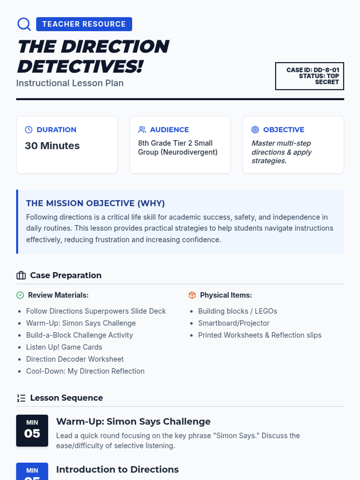 A 30-minute Tier 2 lesson for neurodivergent 8th graders to master the 'superpower' of following multi-step directions through hands-on detective-themed activities.