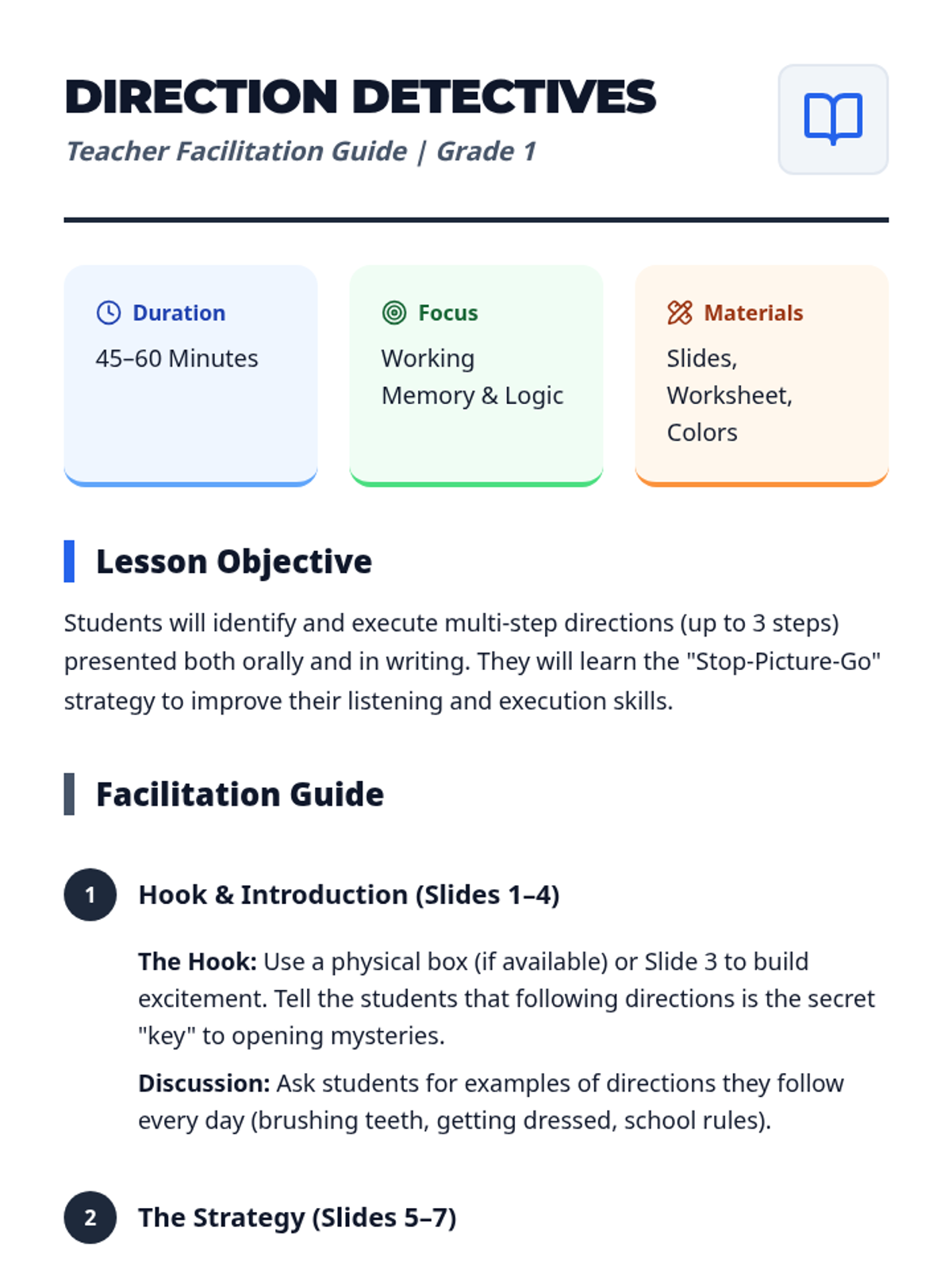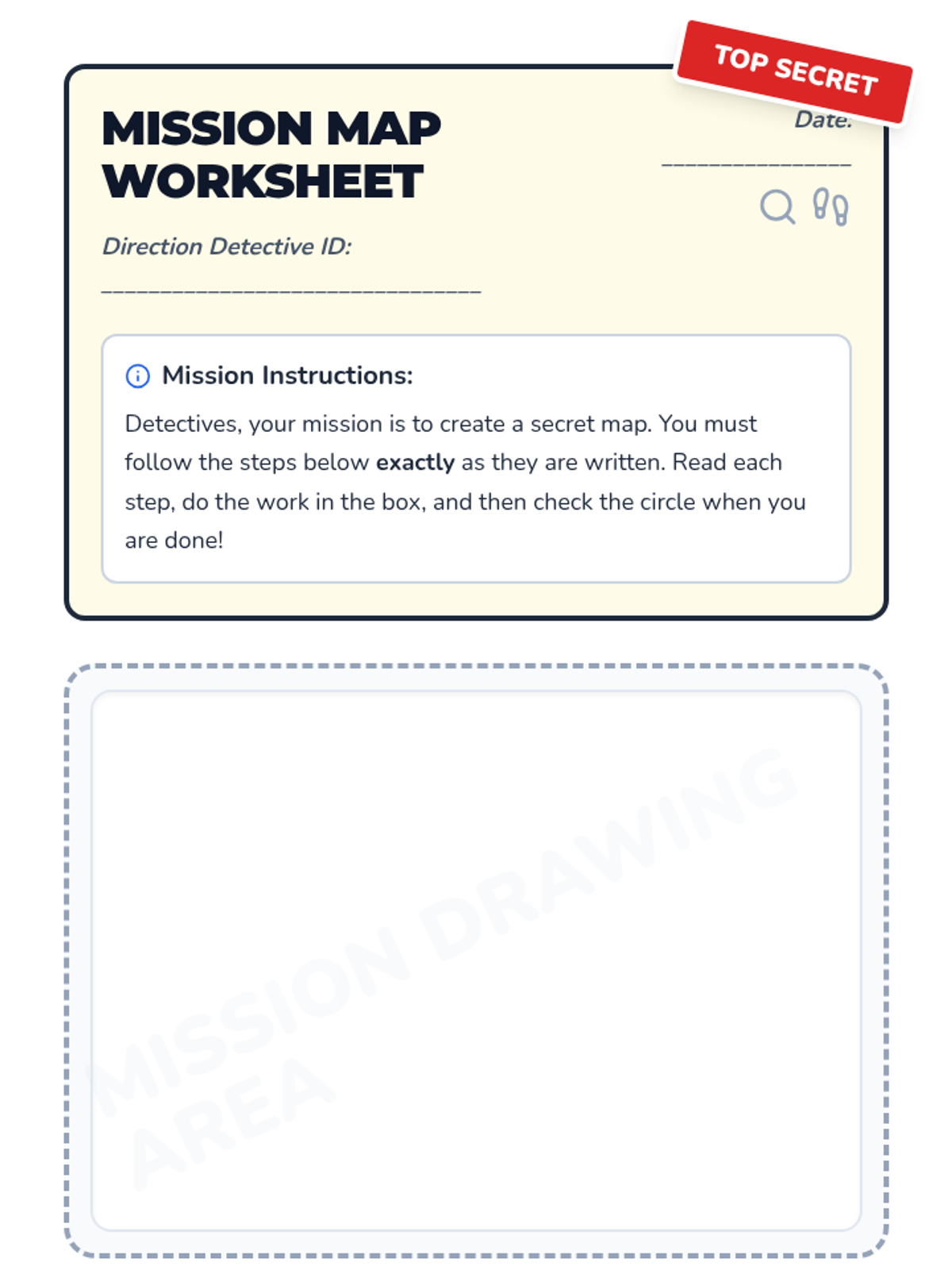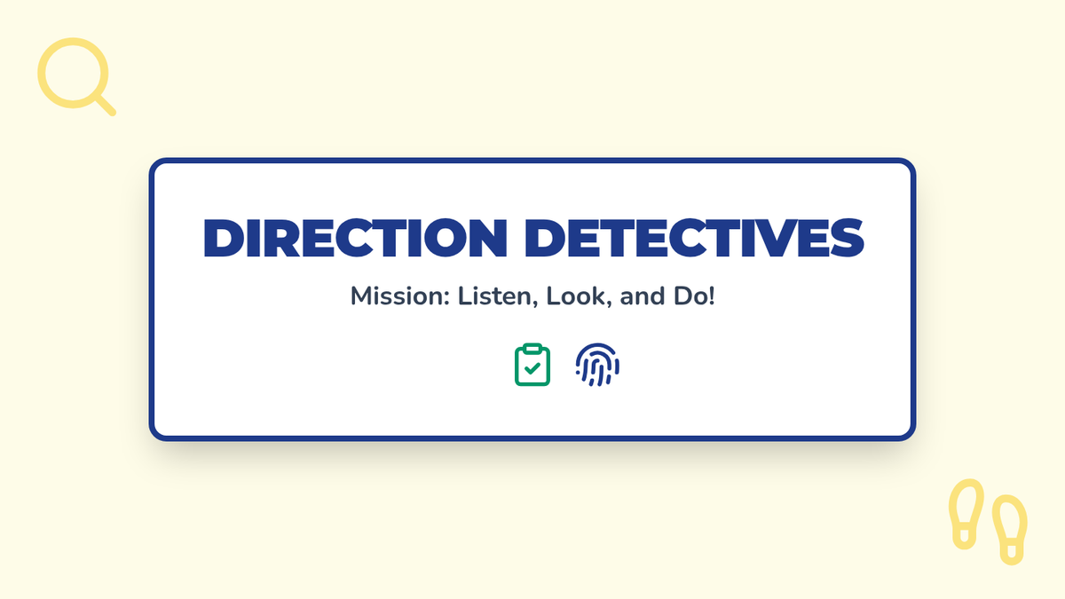 A high-energy, interactive lesson for first graders focused on mastering multi-step oral and written directions through the lens of 'Direction Detectives'. Students practice listening, visualizing, and executing sequences of actions.