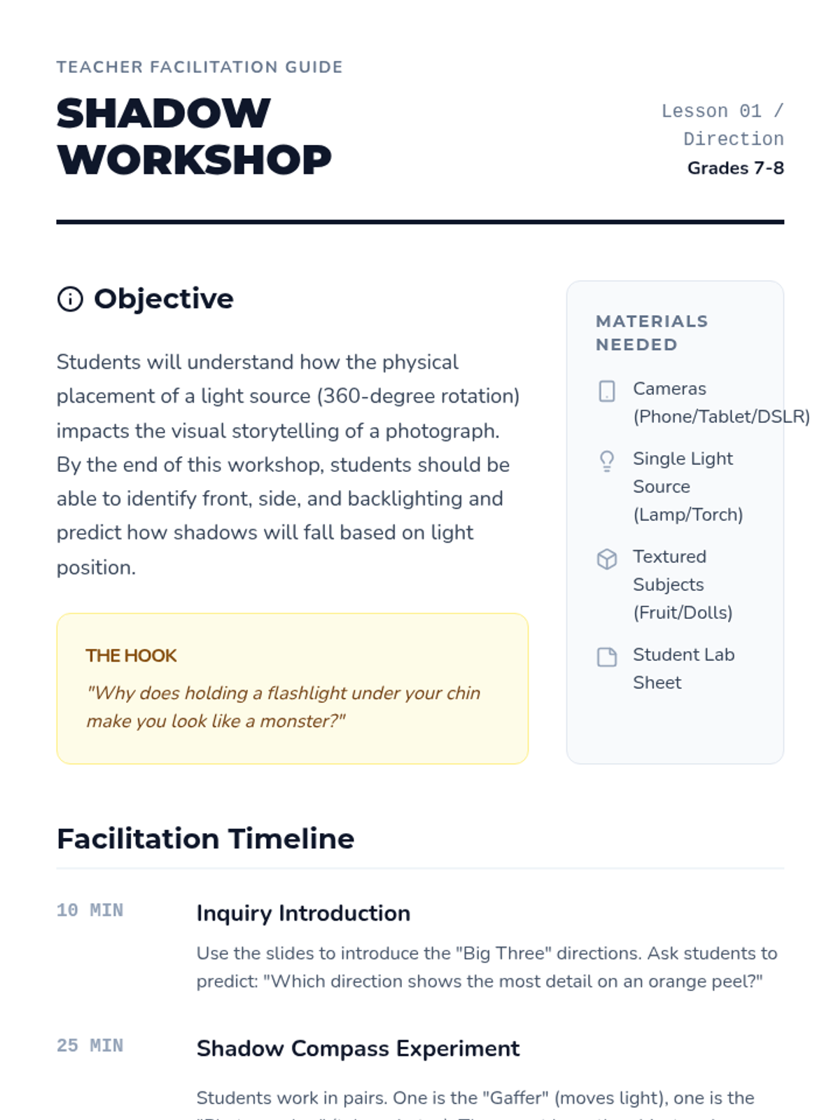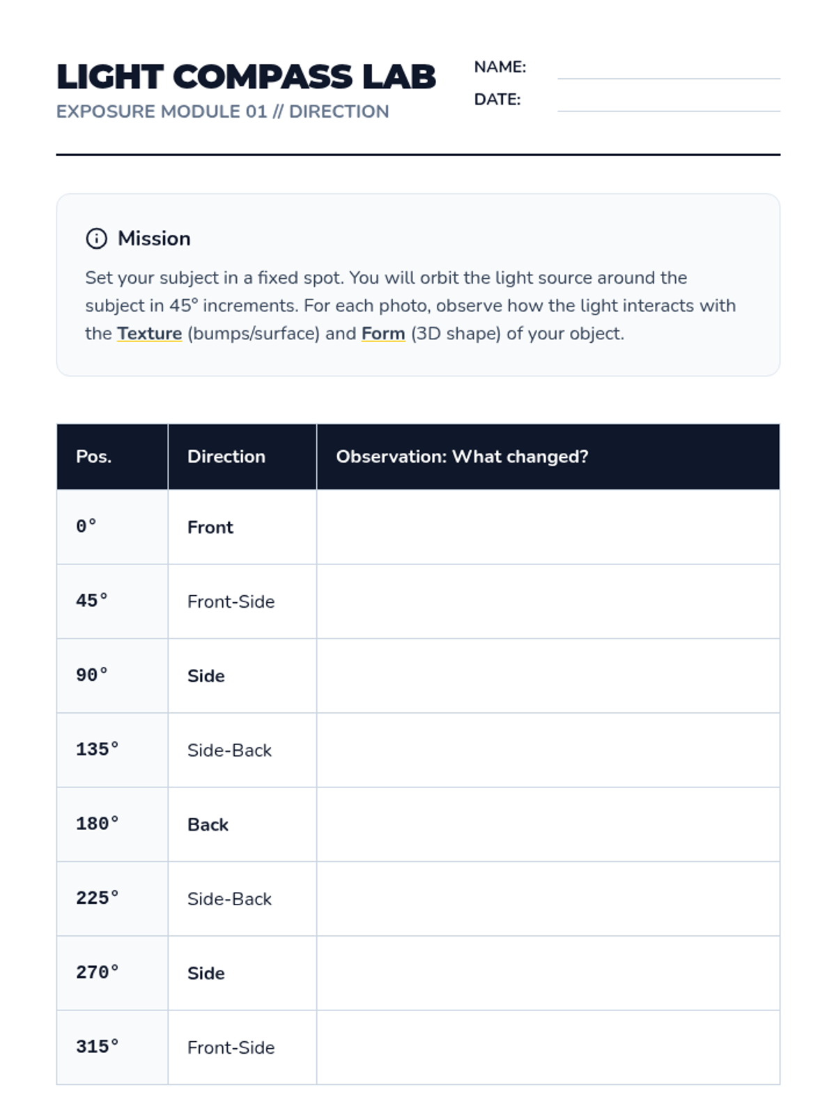 Students explore how the 360-degree placement of a light source affects texture, depth, and shadow on a subject.