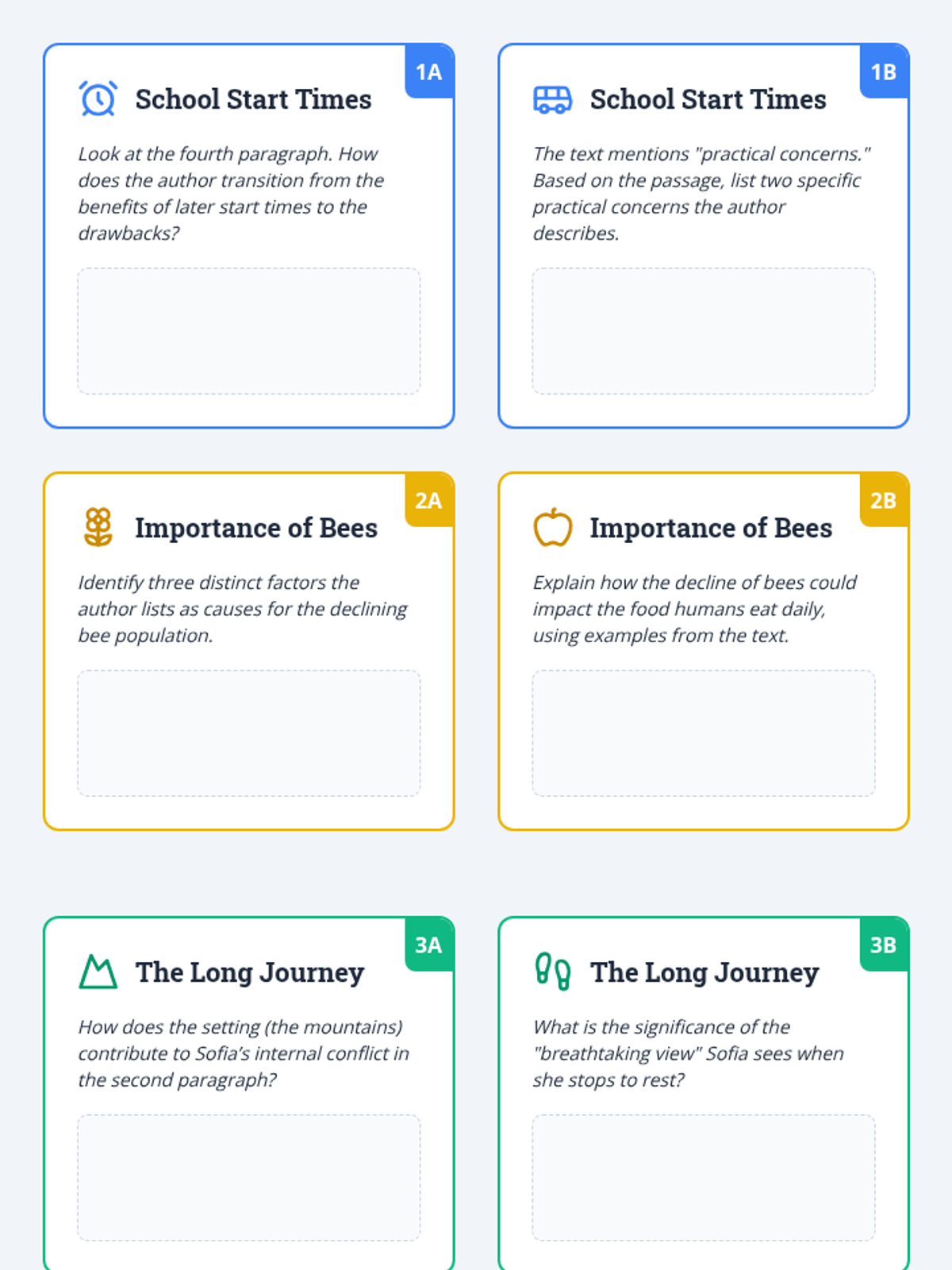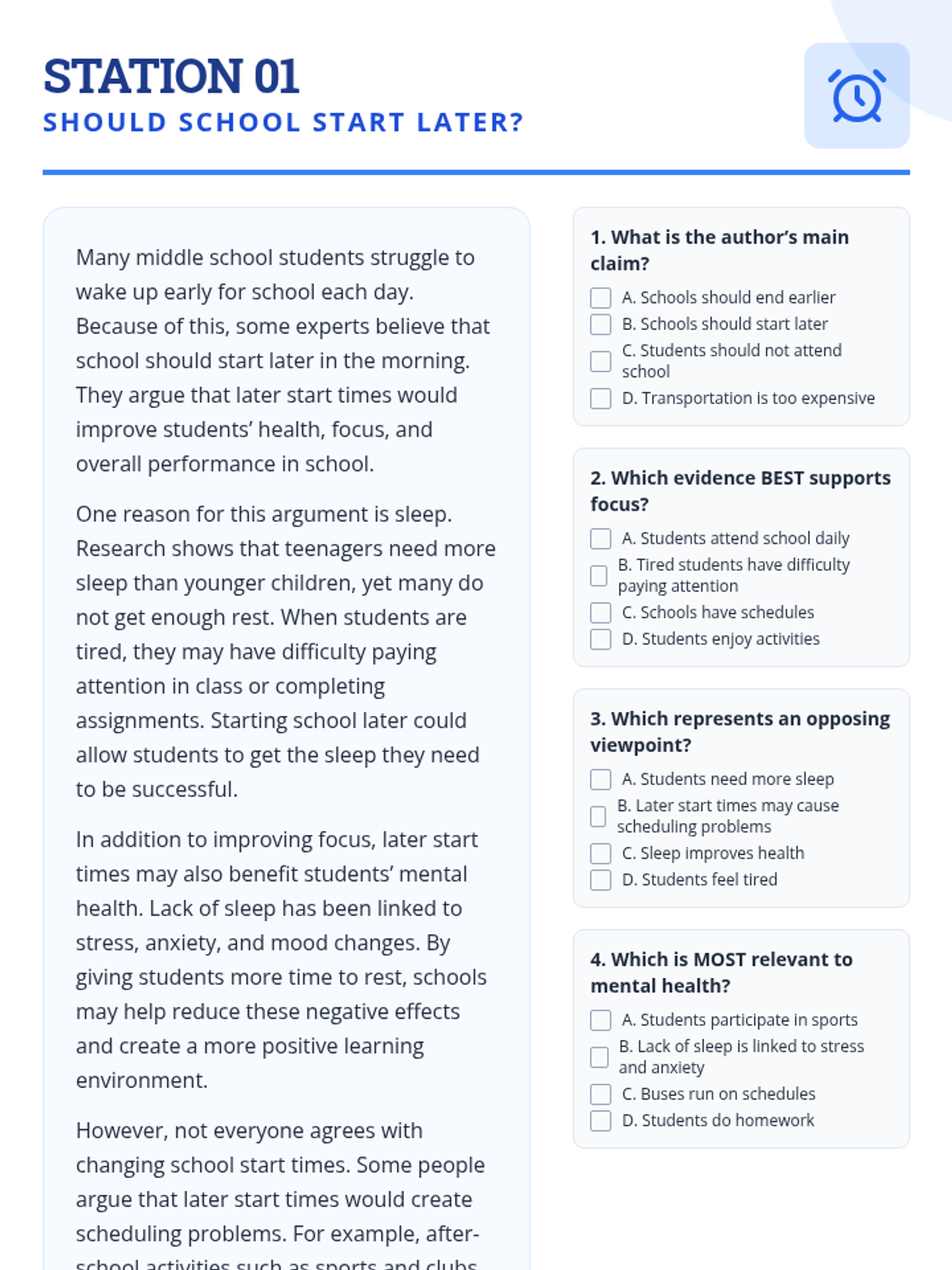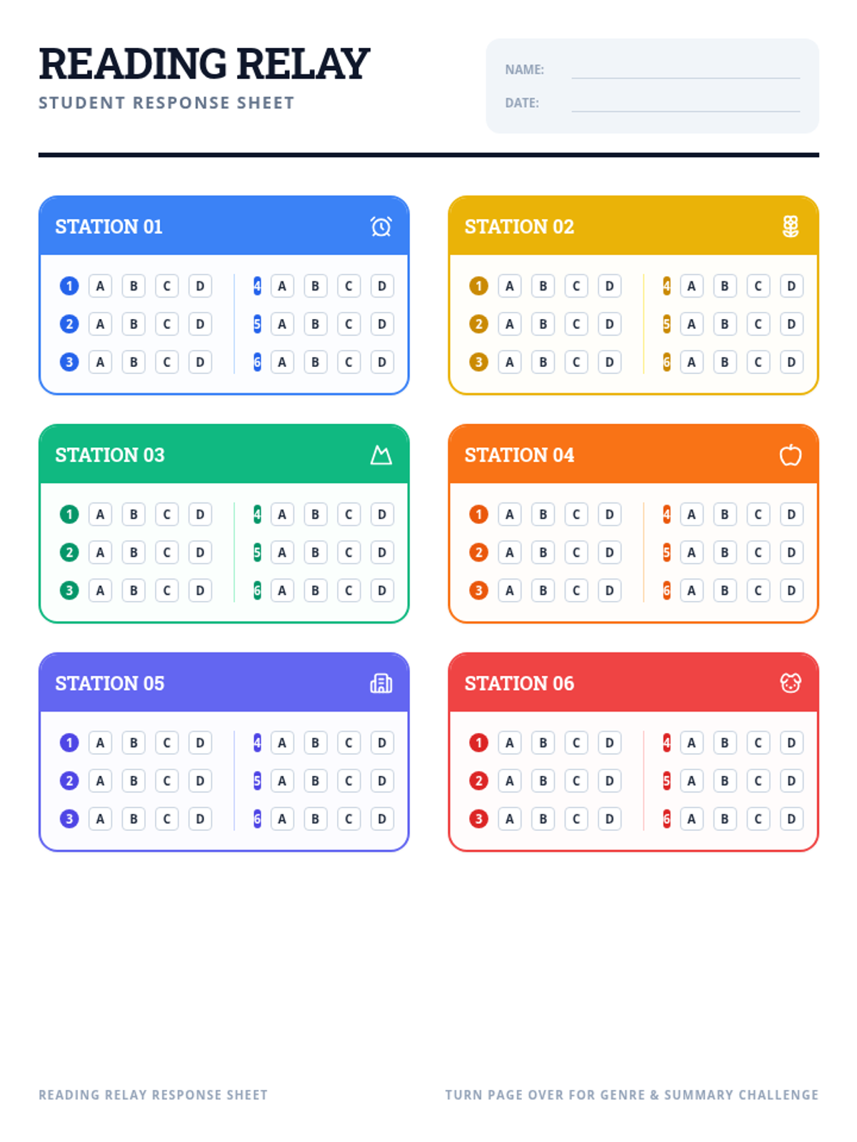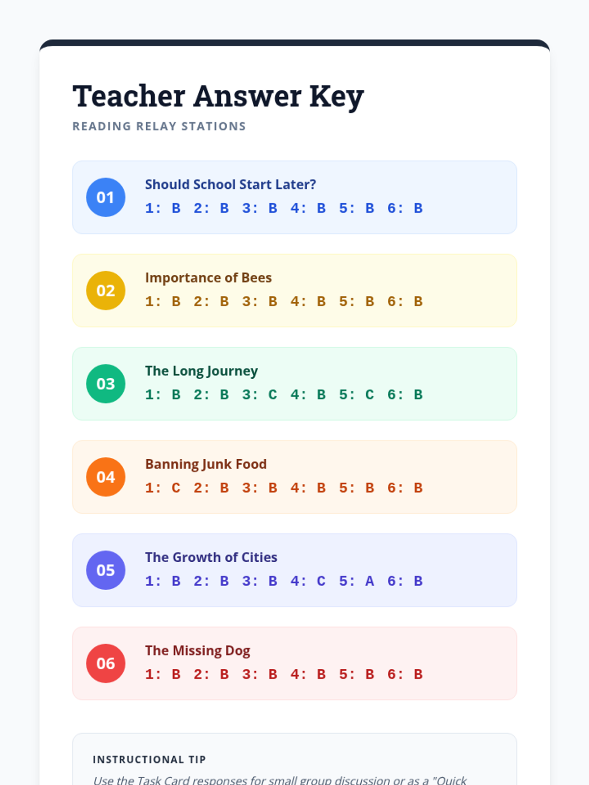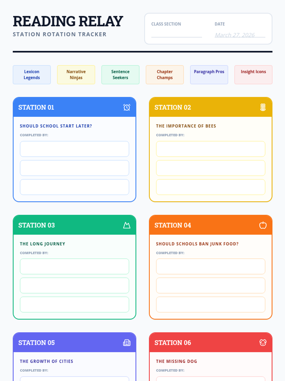 A set of literacy stations designed to build comprehension, argumentative analysis, and theme identification skills through six diverse reading passages.