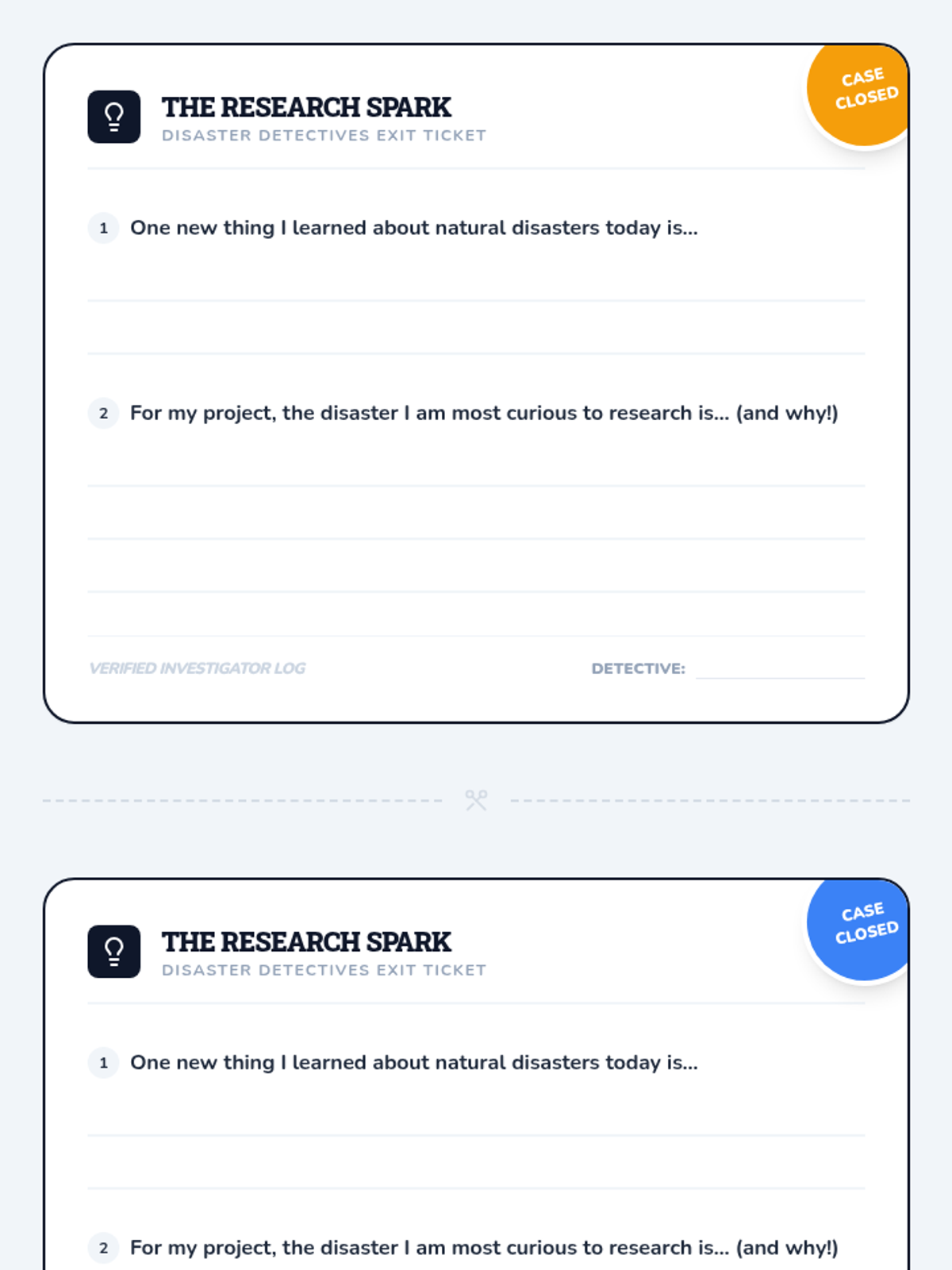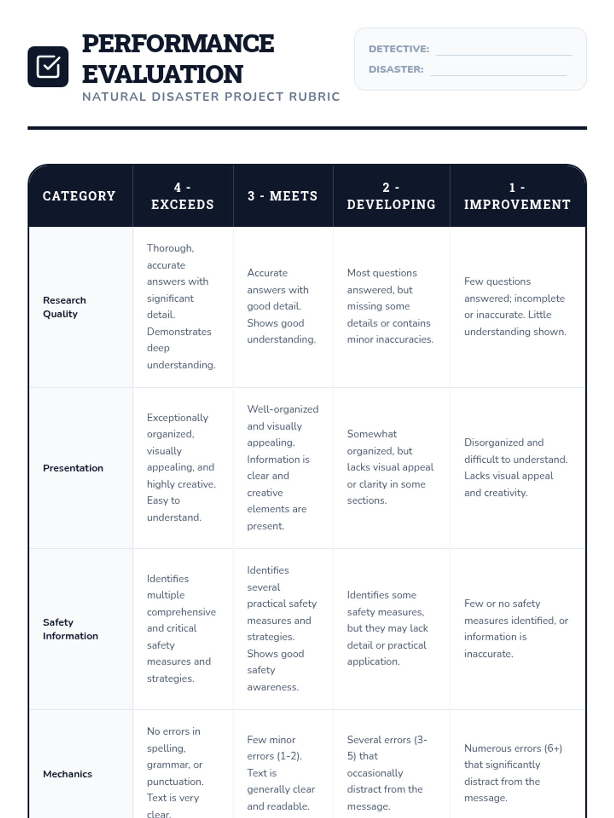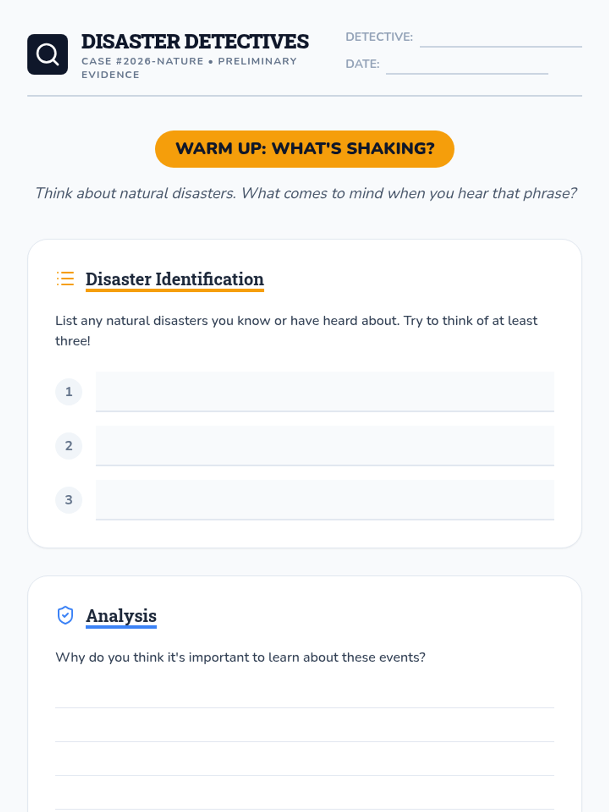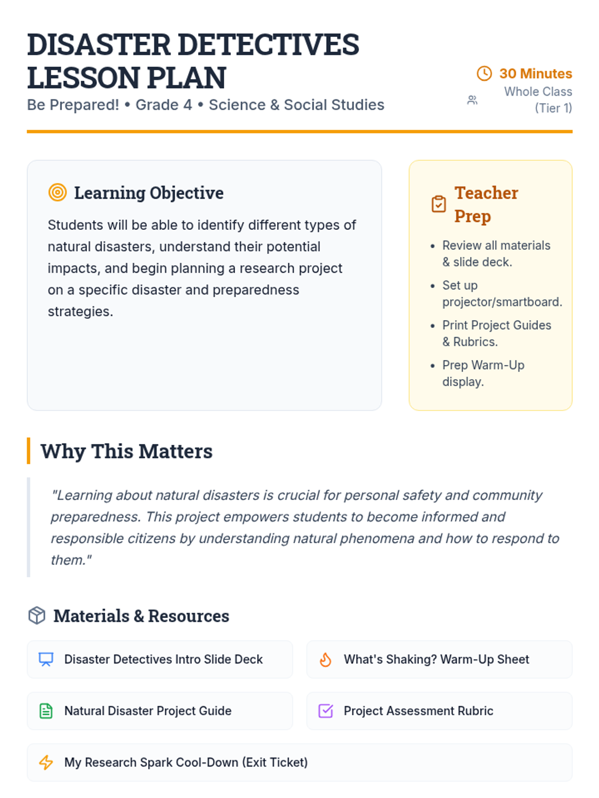 A 30-minute introductory session where 4th-grade students learn about natural disasters and launch their 'Disaster Detectives' research project. Students will identify various disasters, understand the importance of preparedness, and choose a topic for investigation.