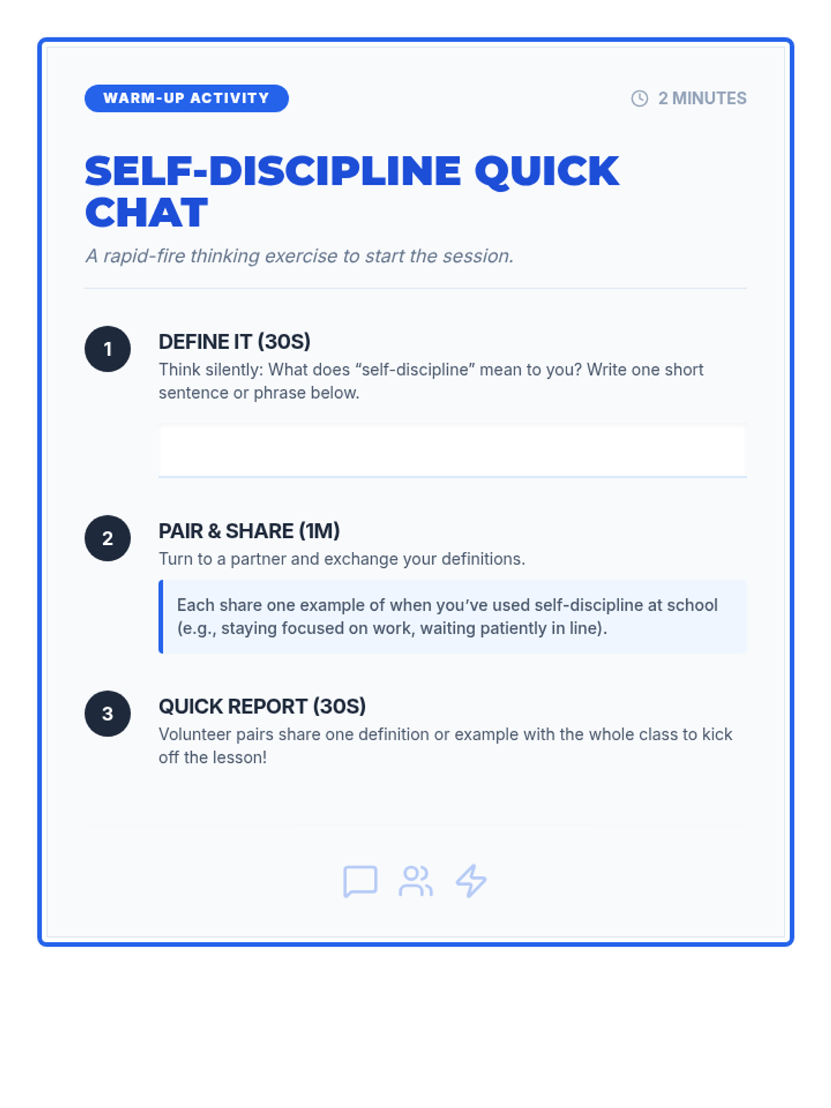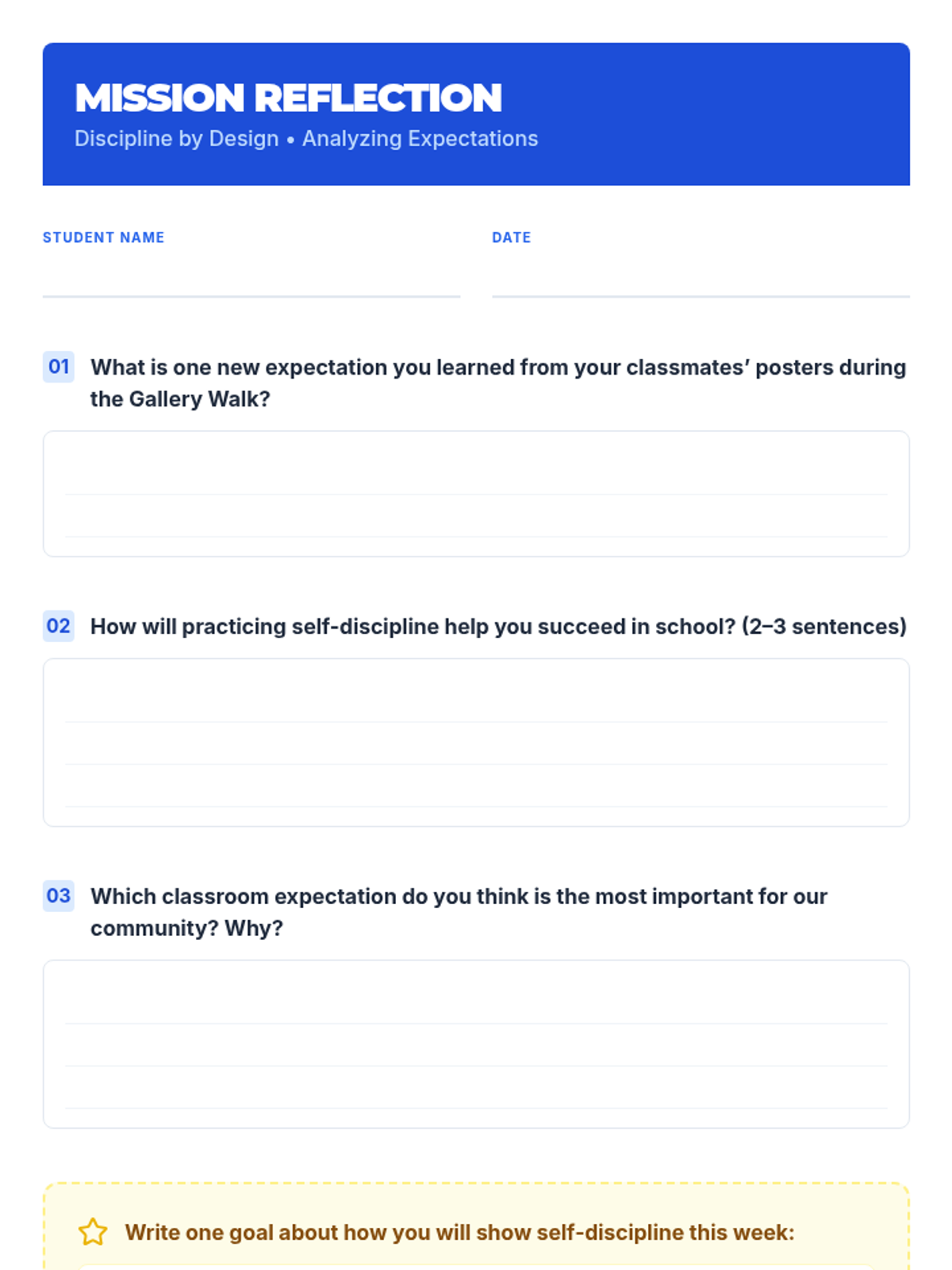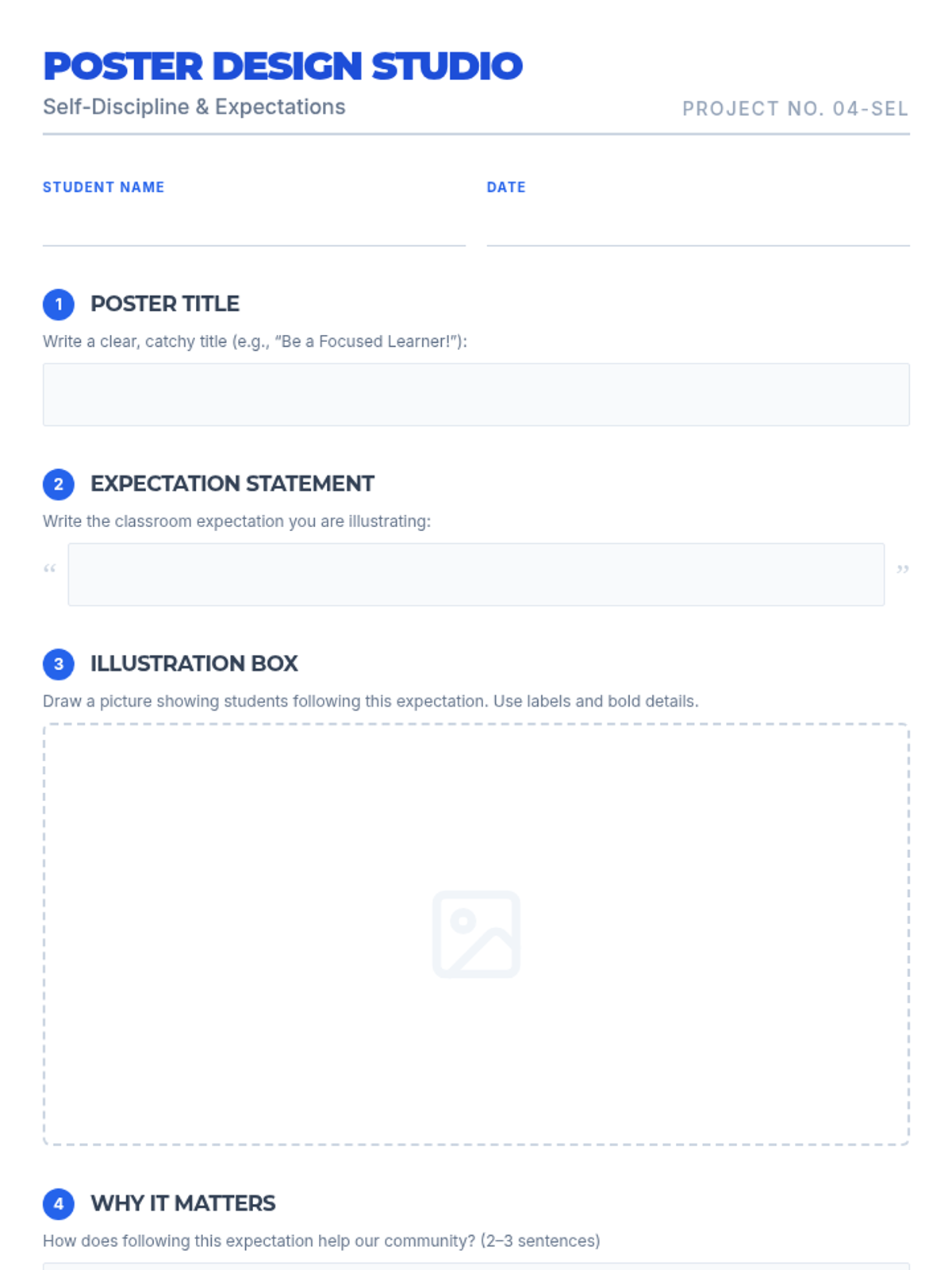 A 30-minute Tier 1 lesson for 4th graders that builds self-discipline through identifying expectations and designing visual classroom posters. Students practice personal responsibility and contribute to a positive classroom culture.