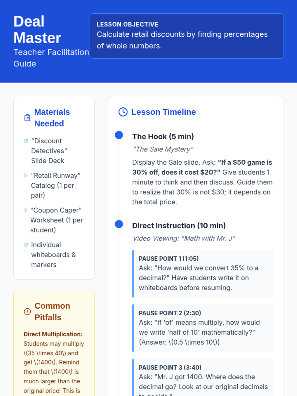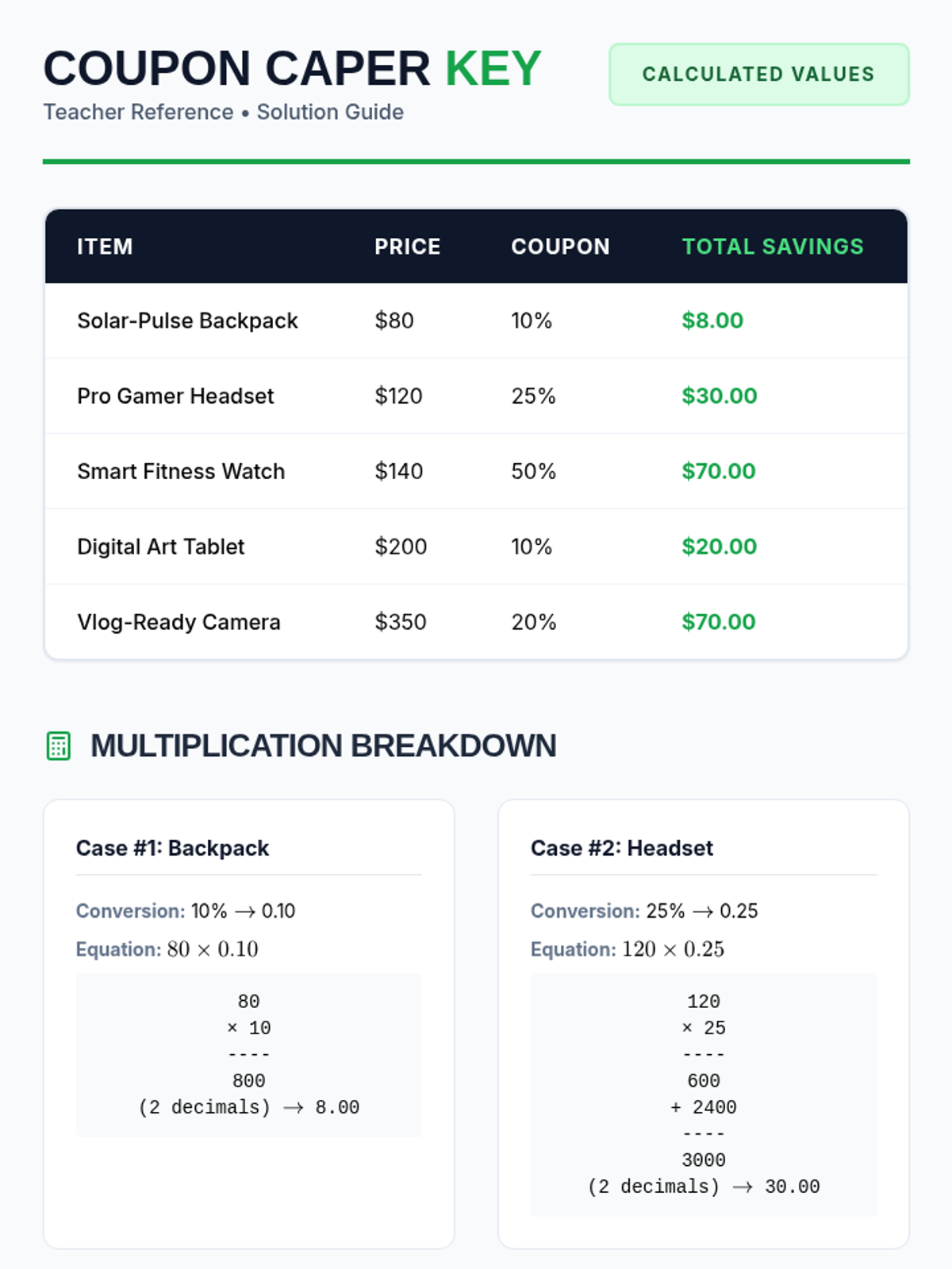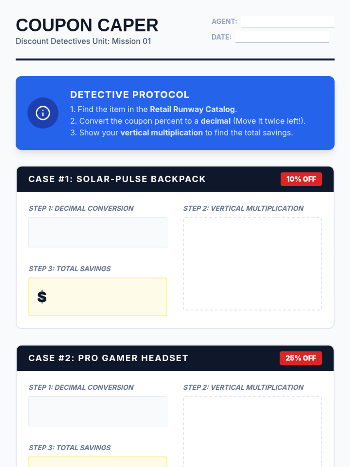 Students will learn to calculate retail discounts by finding the percentage of a whole number using the decimal multiplication method. The lesson includes a 'Discount Detectives' activity where students use a catalog and coupons to find savings.