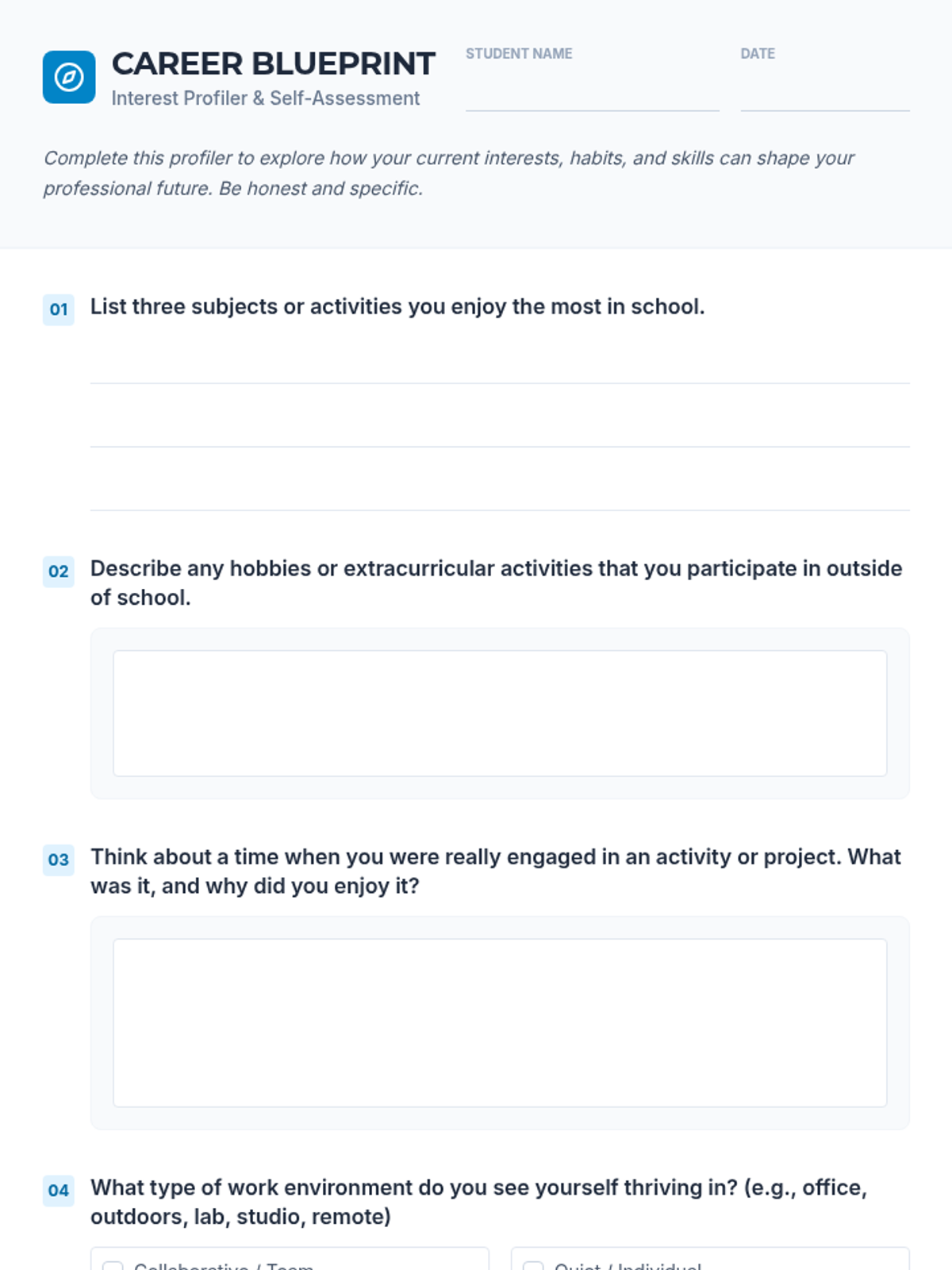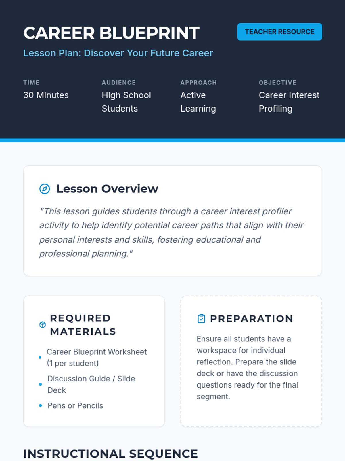 A career exploration lesson for high school students, featuring a self-assessment profiler and group discussion to help identify potential professional paths.