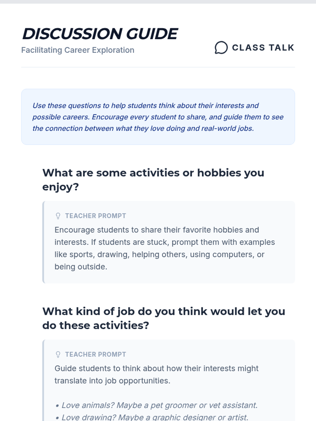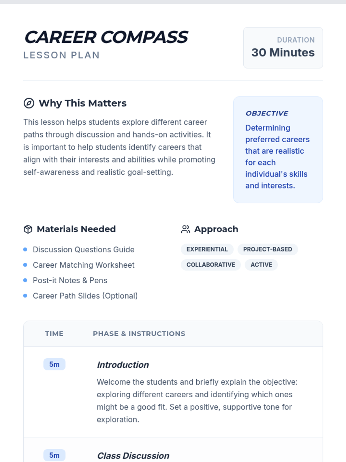 A lesson designed for 18-year-olds with developmental disabilities to explore career paths that align with their interests and abilities through discussion and hands-on activities.