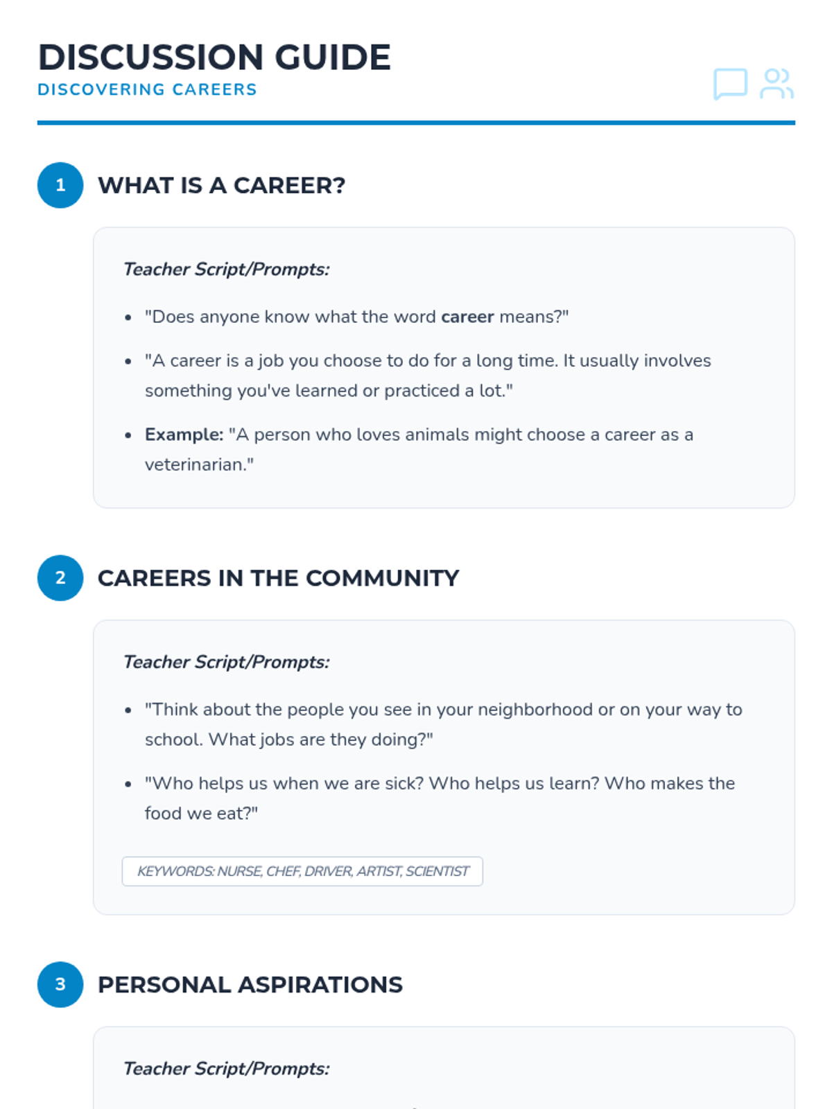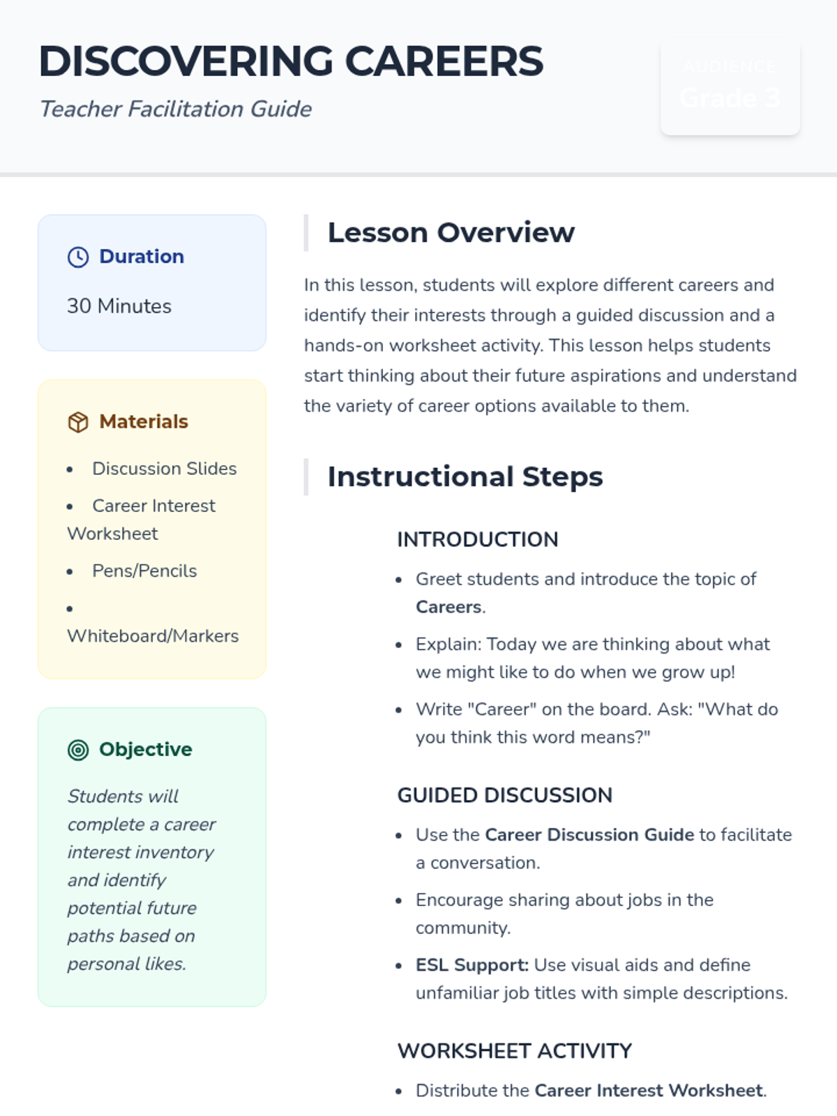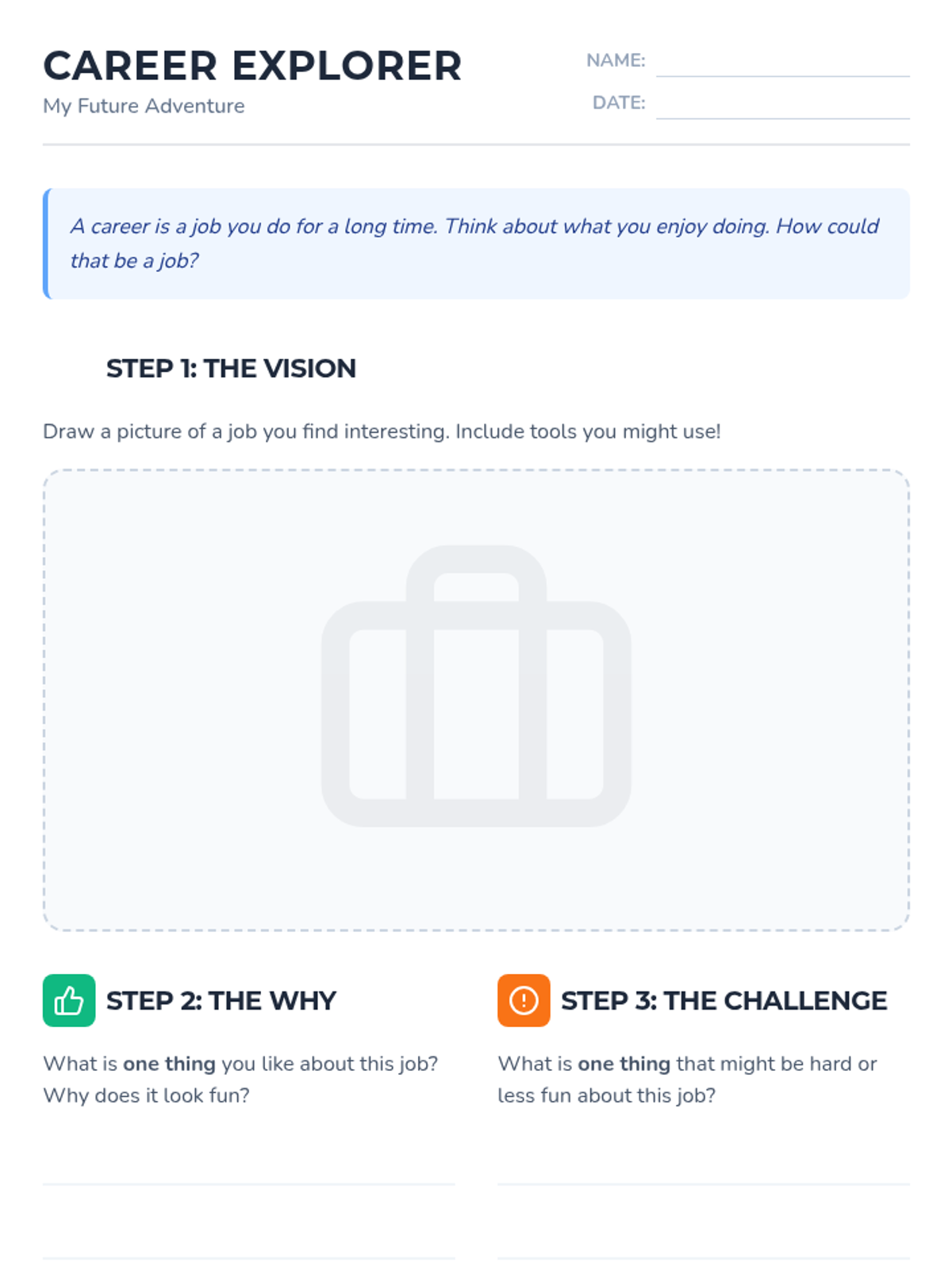 A Grade 3 career exploration lesson where students define 'career', discuss various job paths, and reflect on their personal interests through drawing and writing.