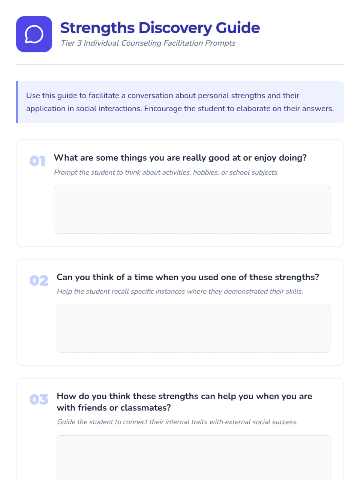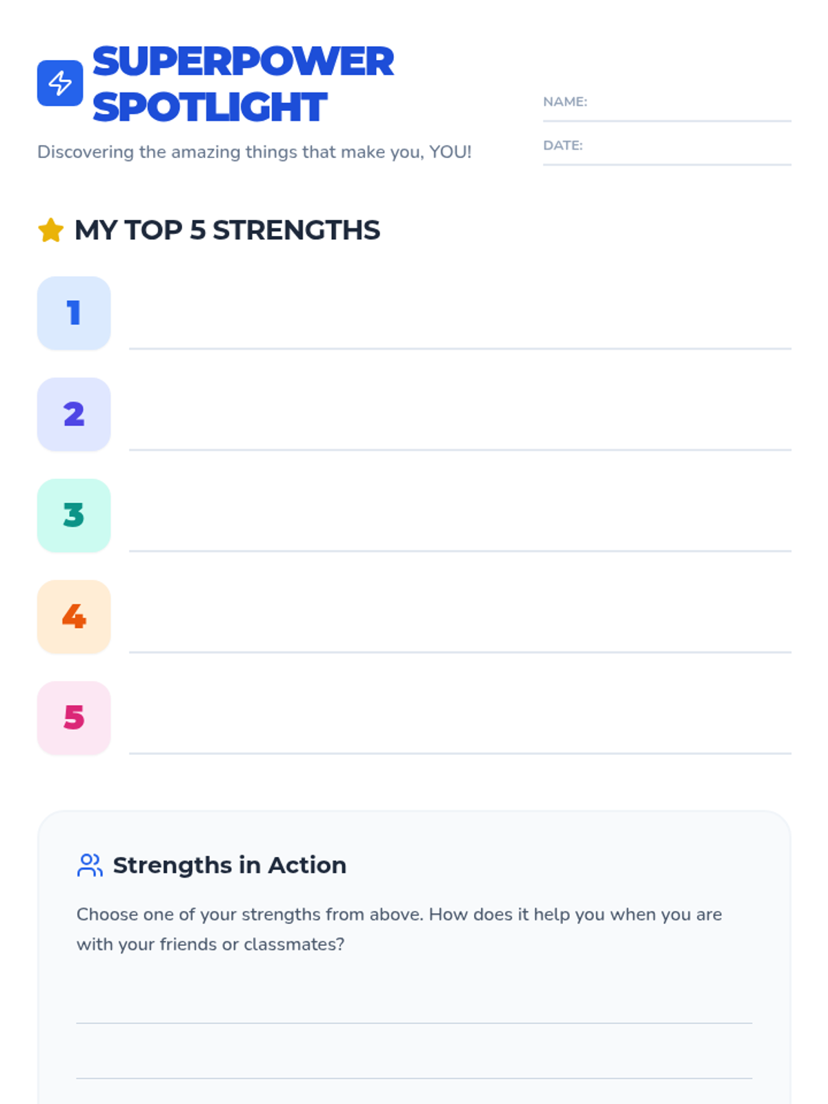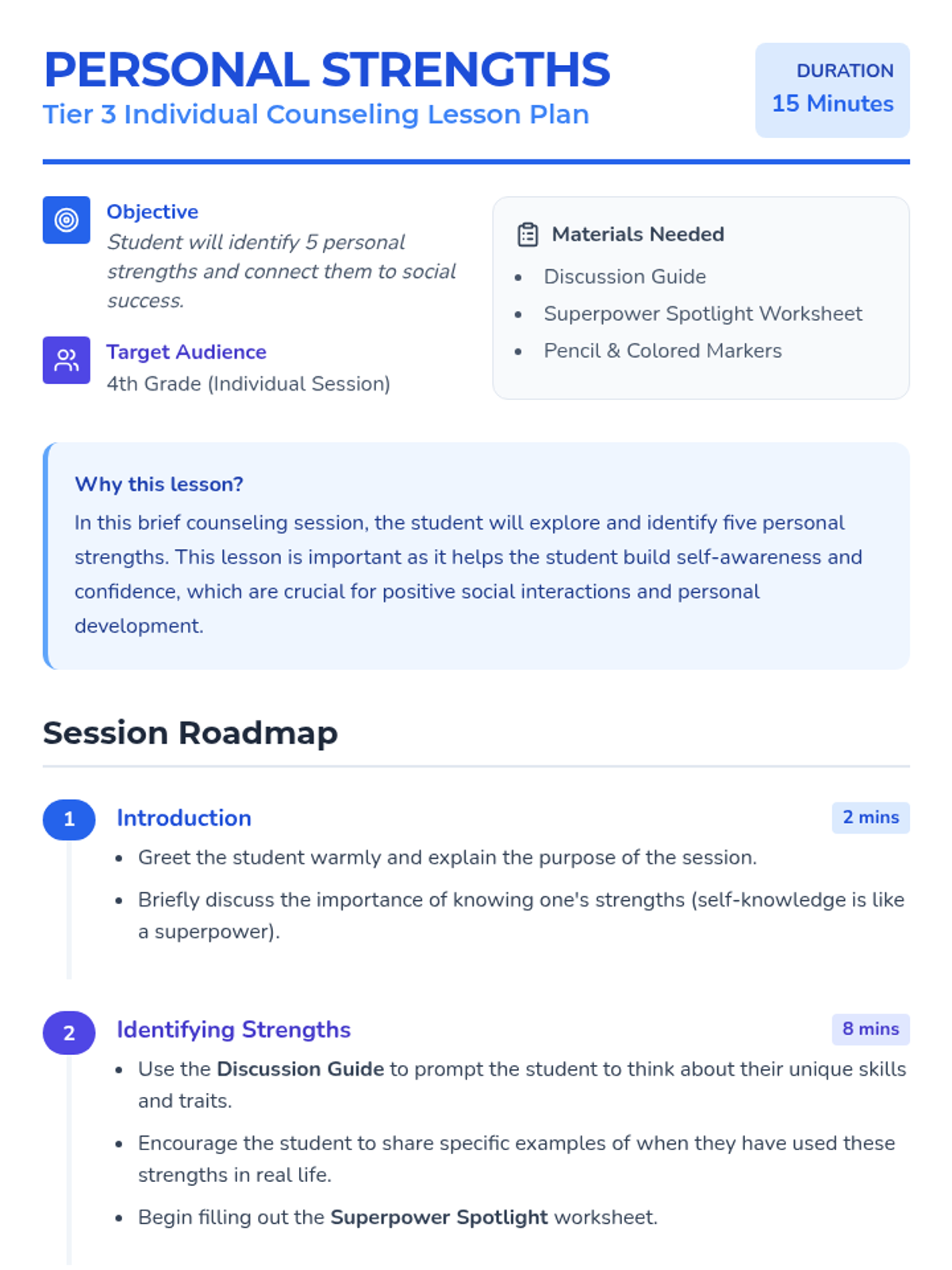 A brief individual counseling session for 4th graders to identify five personal strengths and explore how these strengths enhance their social interactions and self-confidence.